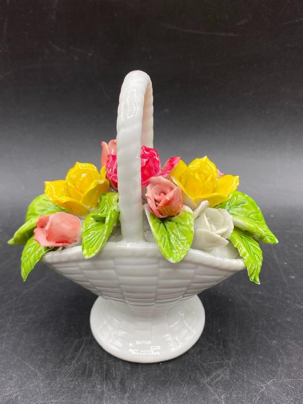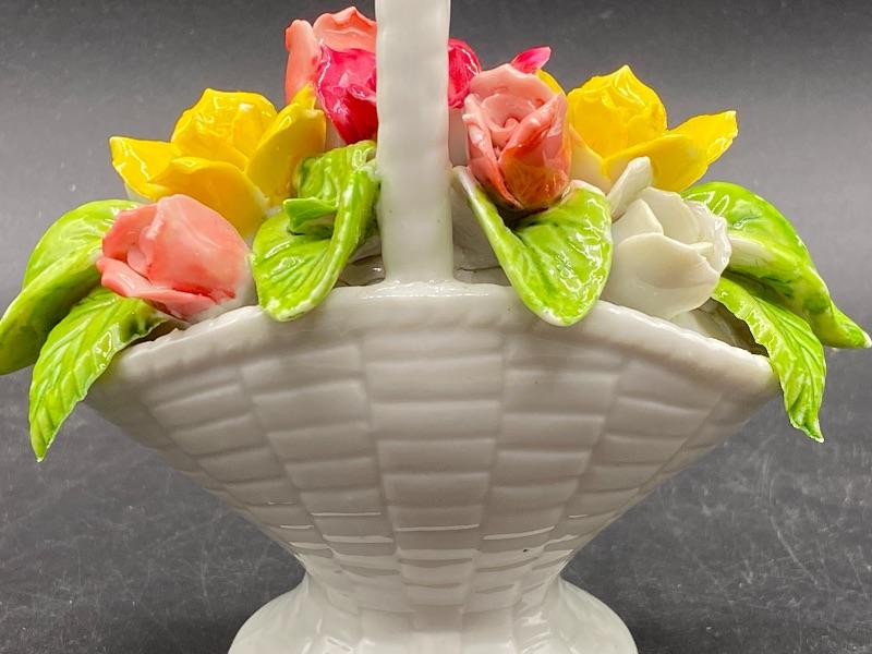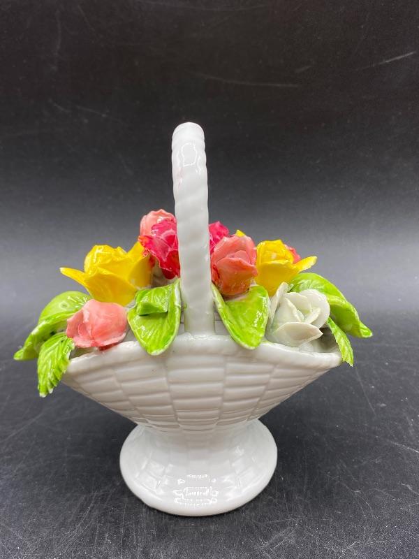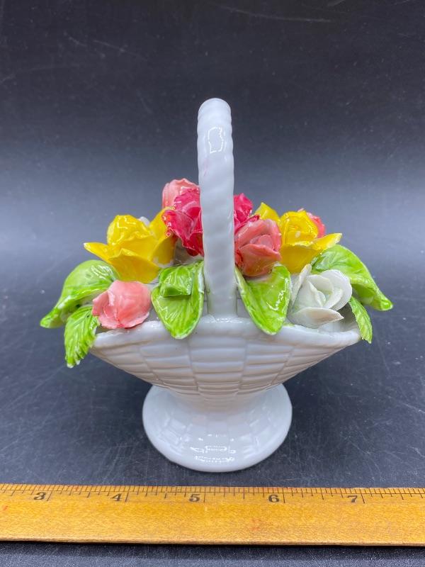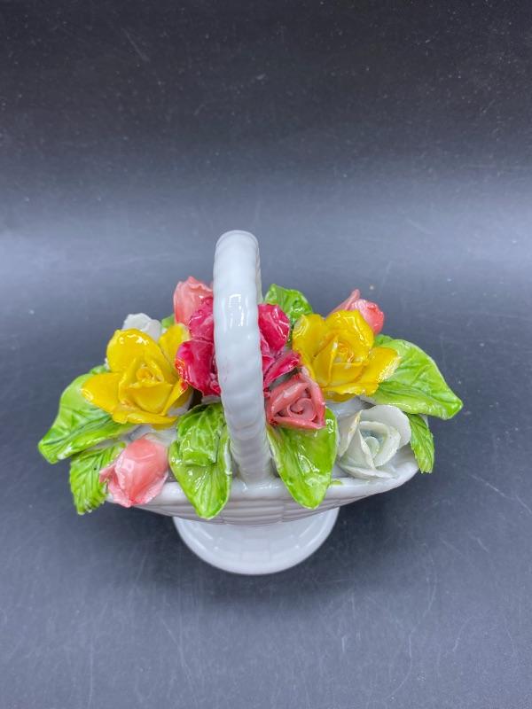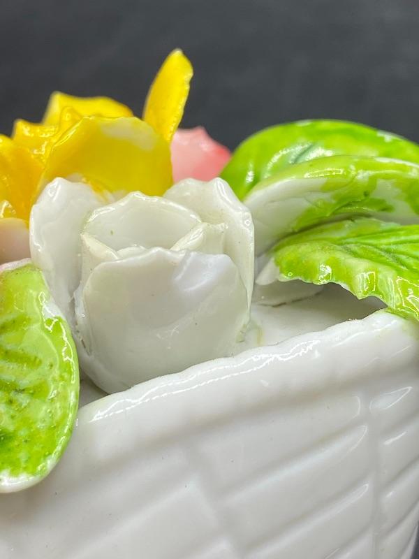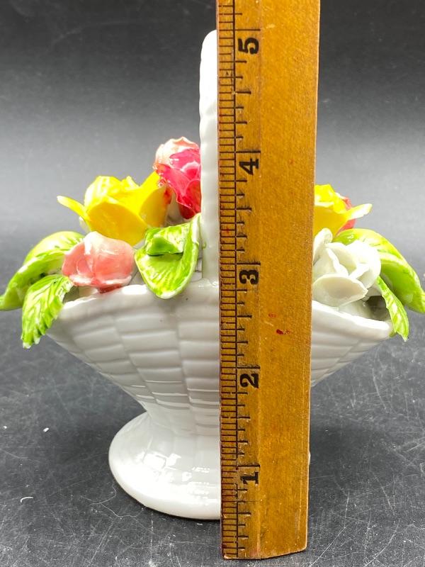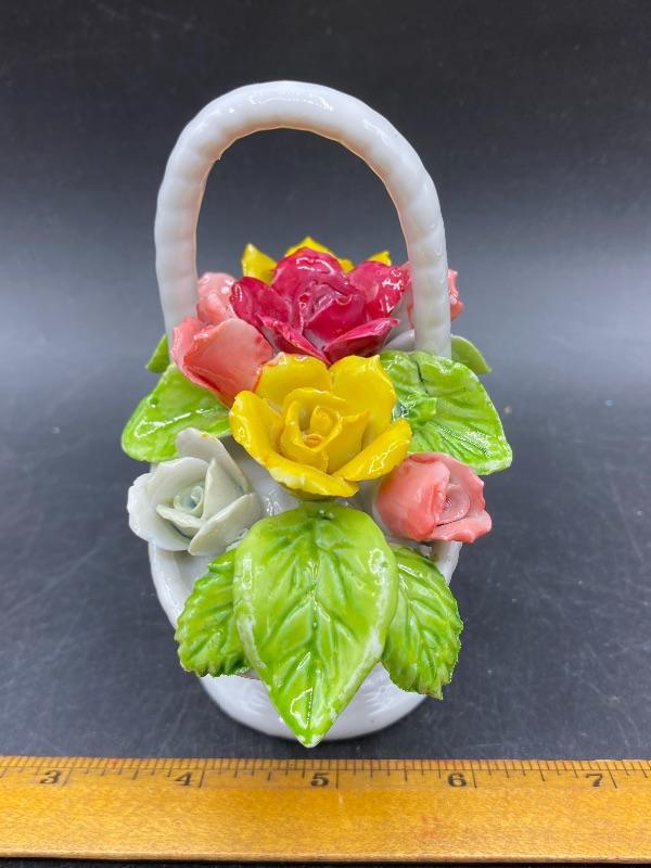 Small porcelain white flower basket with colorful flowers. Only one tiny chip in bottom of petal on white flower. About 4" size.