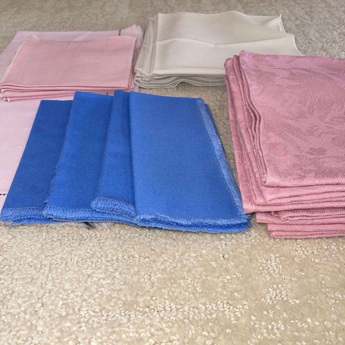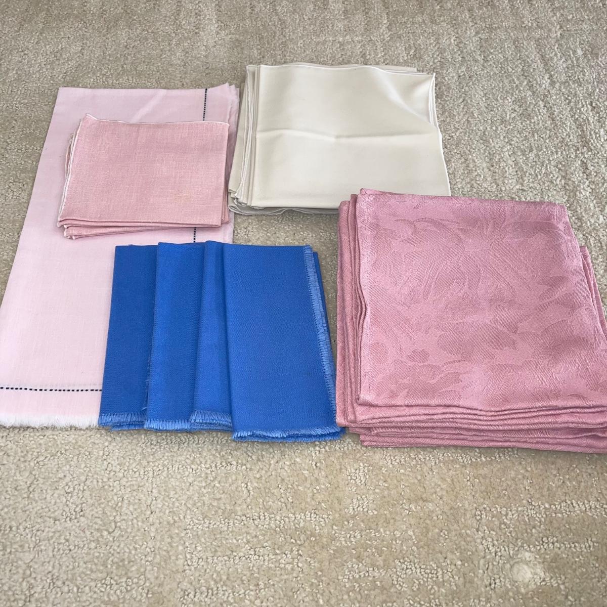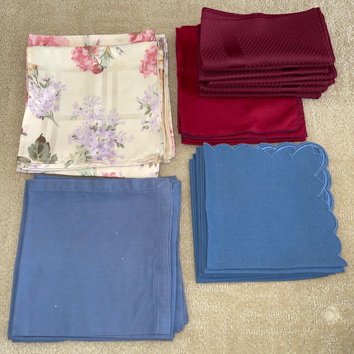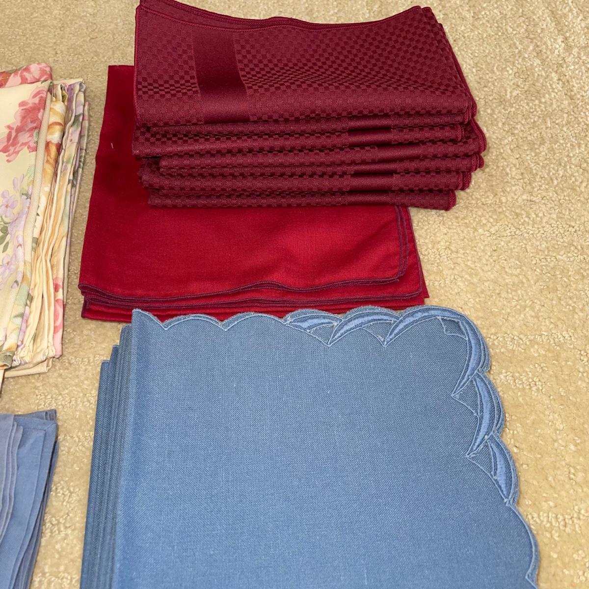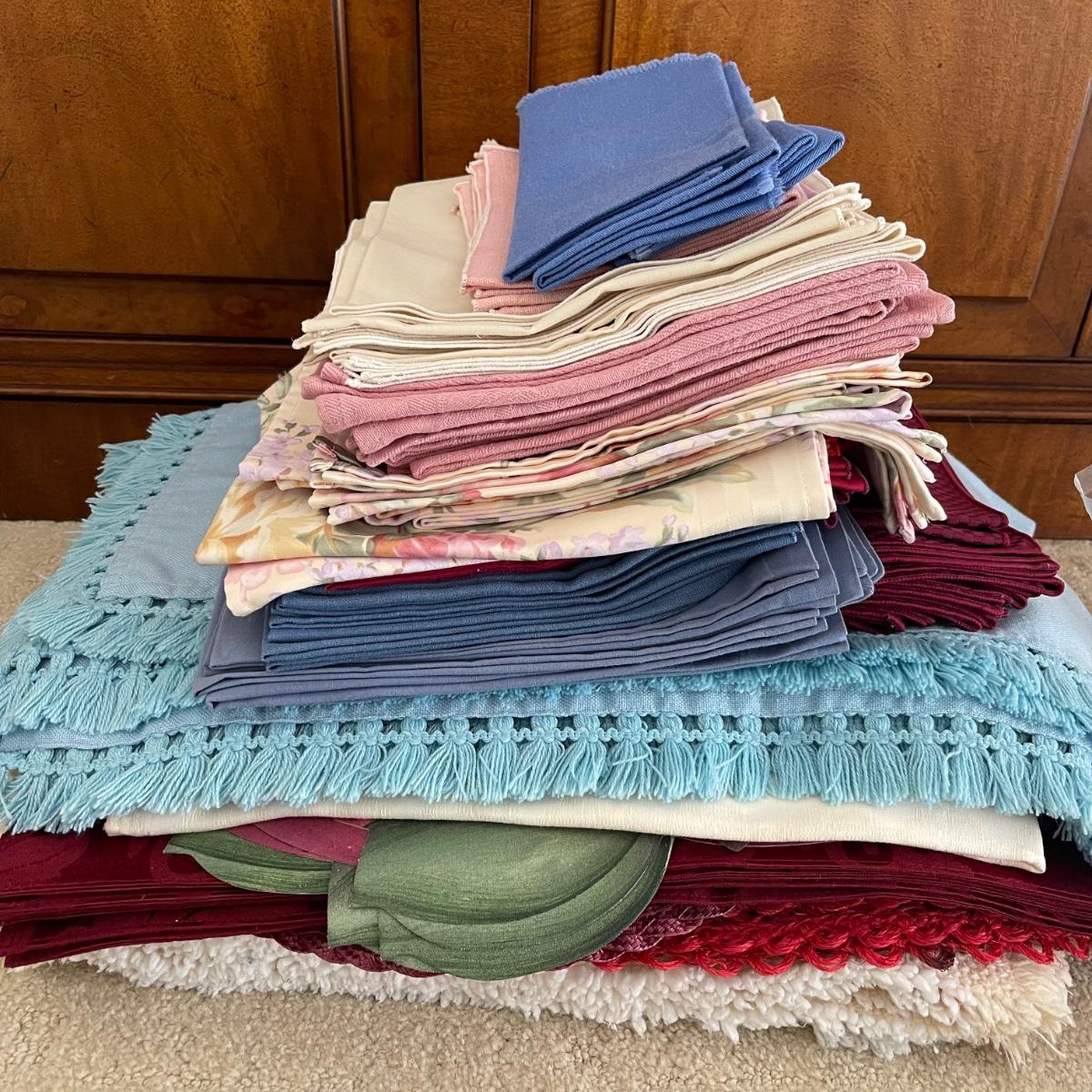 An assortment of colorful table linens. There are placemats, napkins, and table cloths. Mostly sets of four but a few extras. All are in well kept condition. Shipping available.