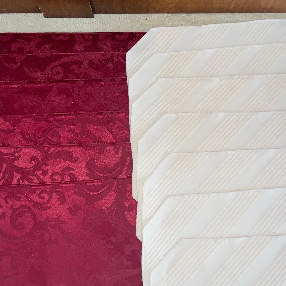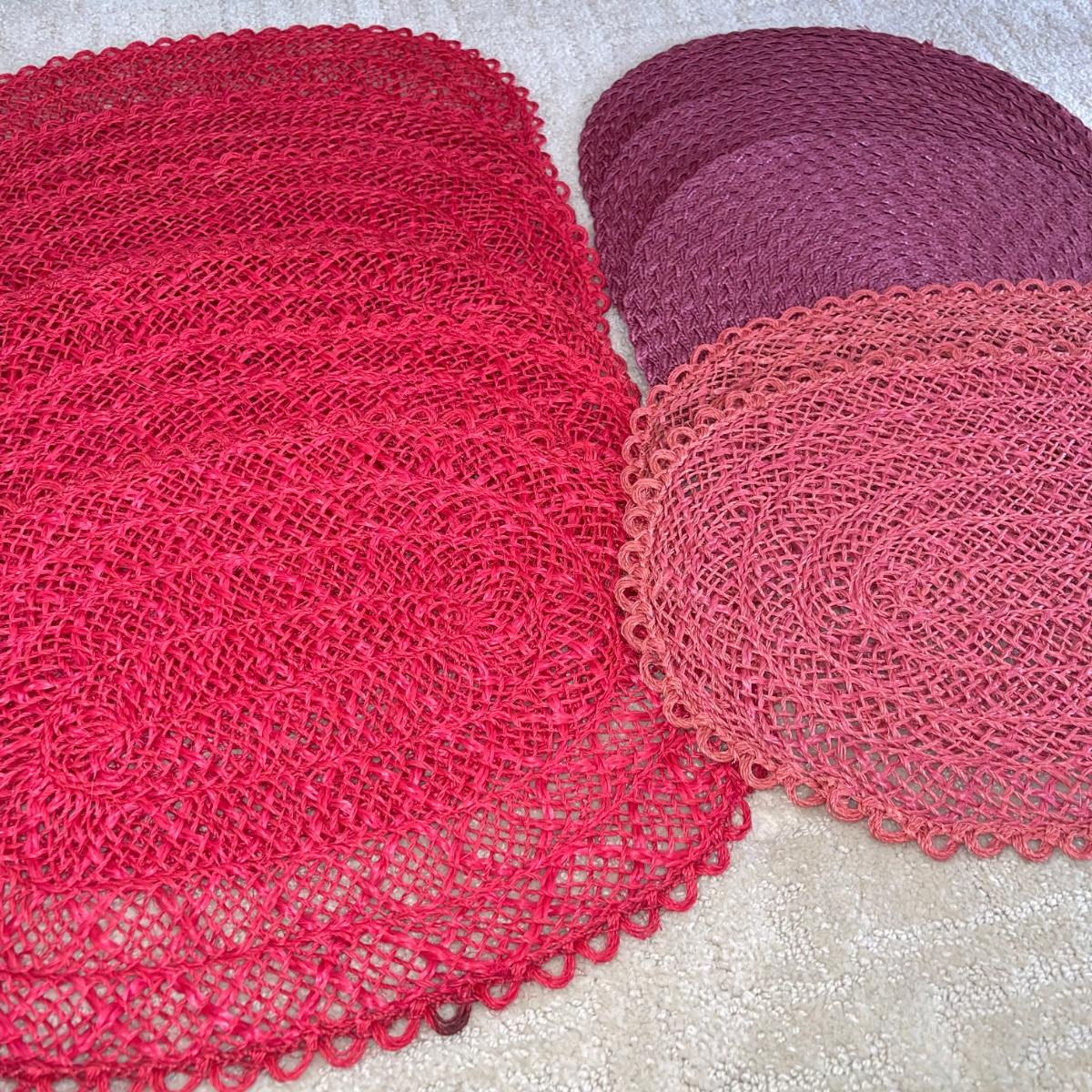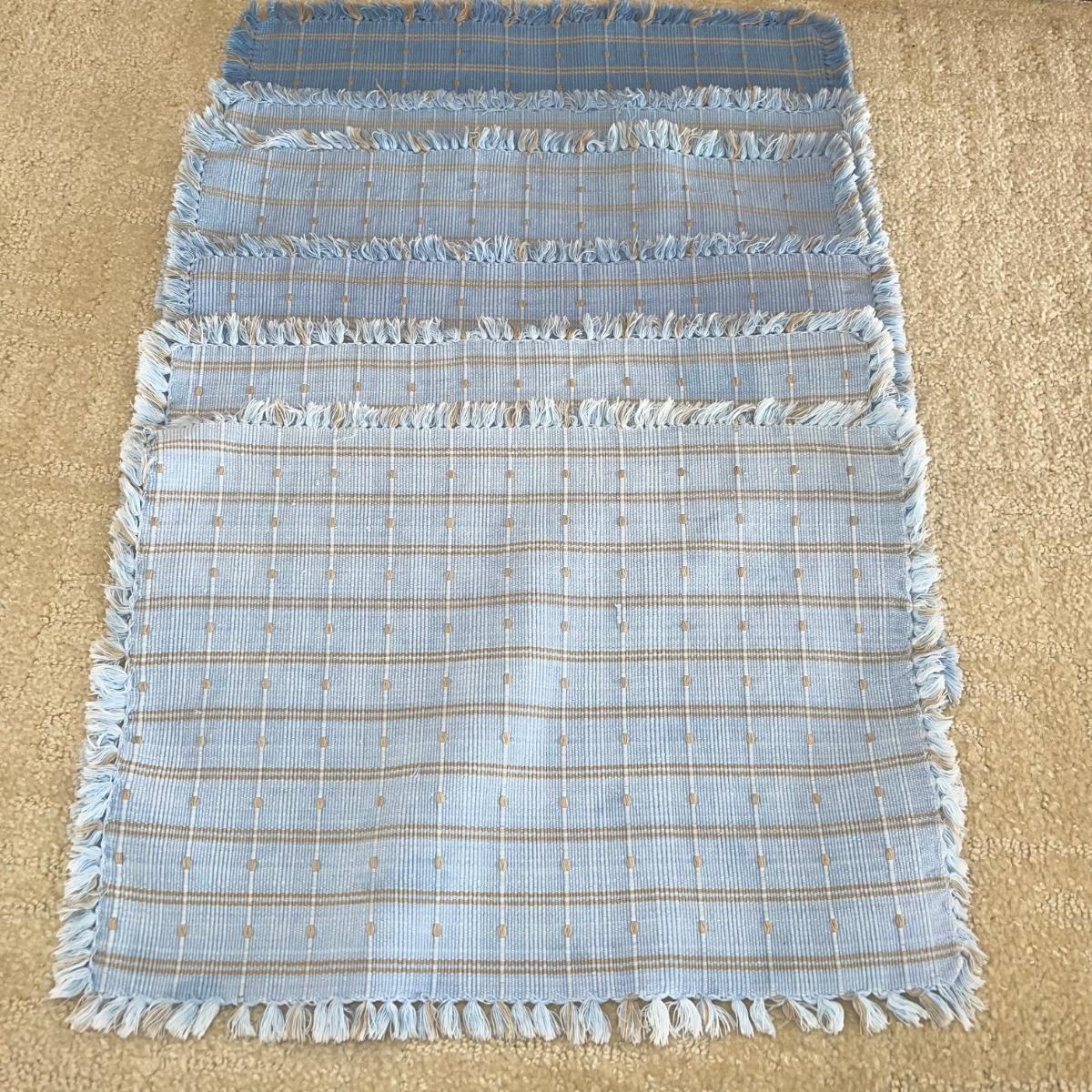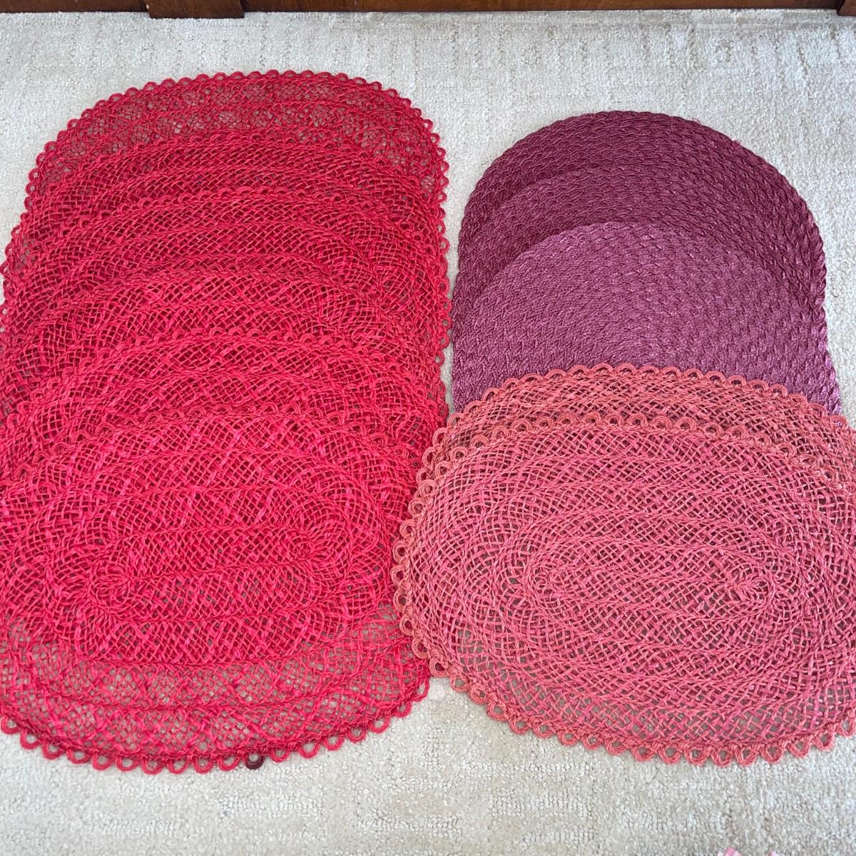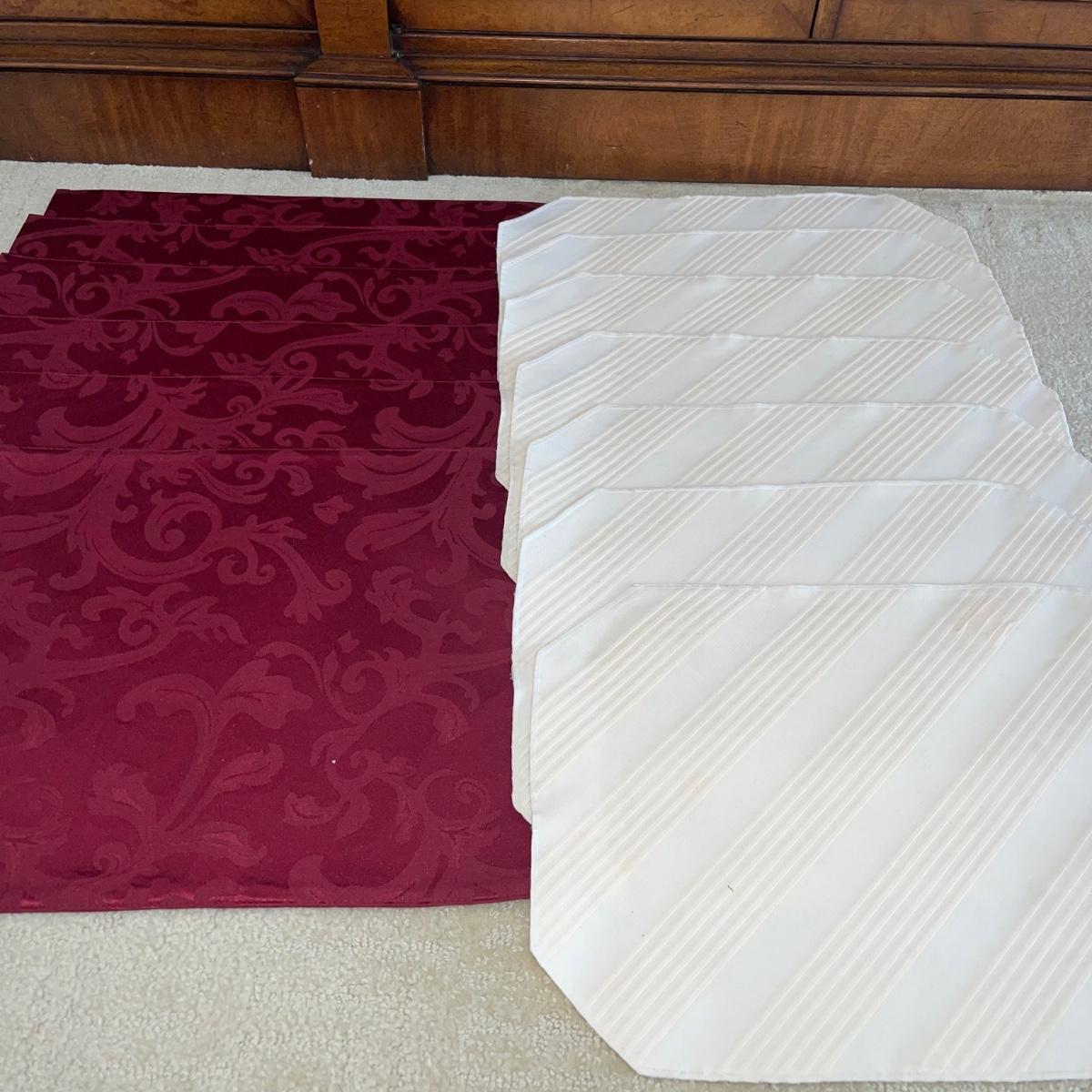 An assortment of colorful table linens. There are placemats, napkins, and table cloths. Mostly sets of four but a few extras. All are in well kept condition. Shipping available.