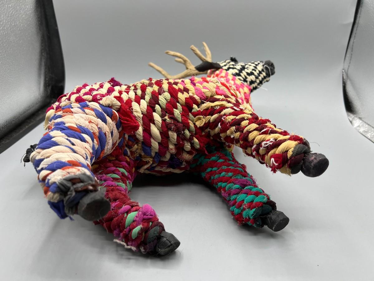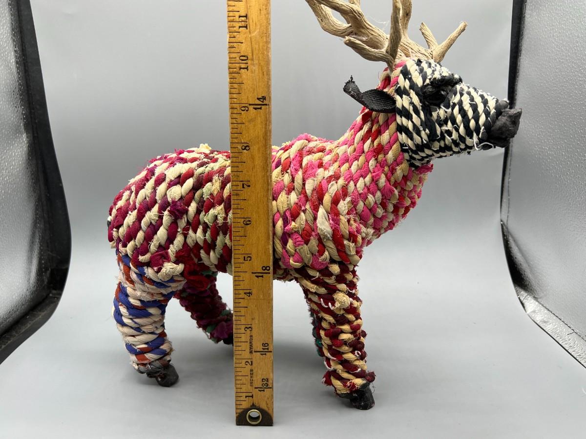 Colorful twisted rope covered deer. Multicolor. Good condition. About 12" tall at top of antlers.
