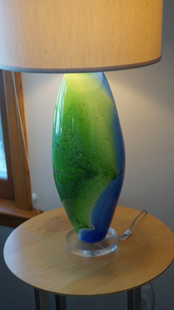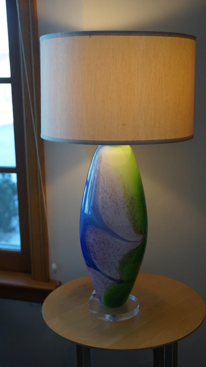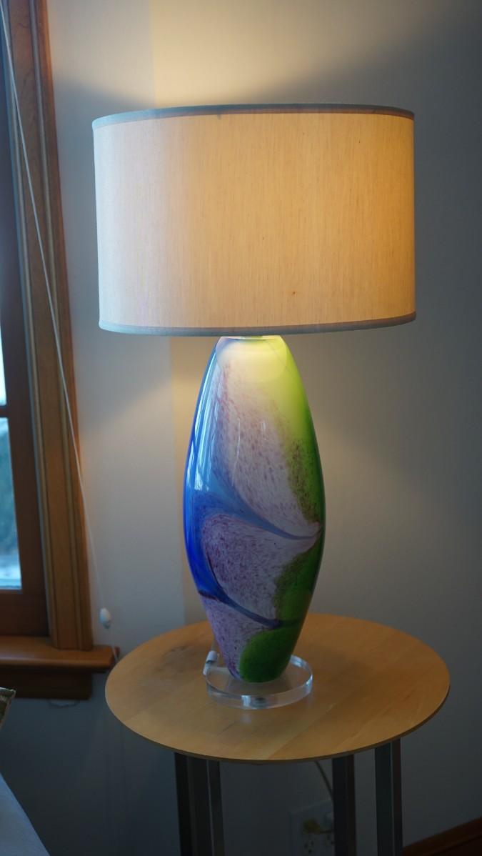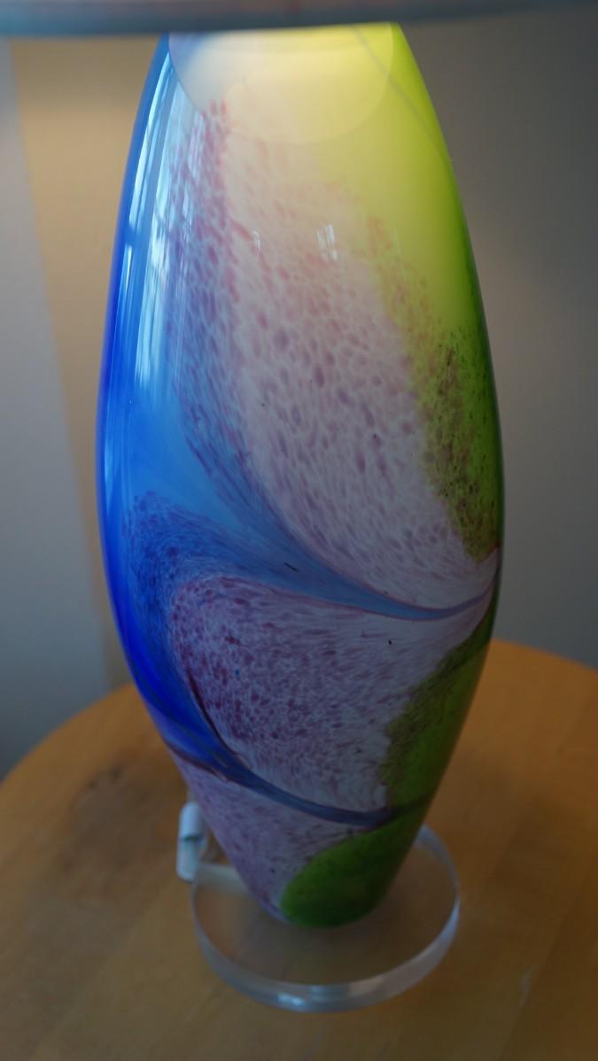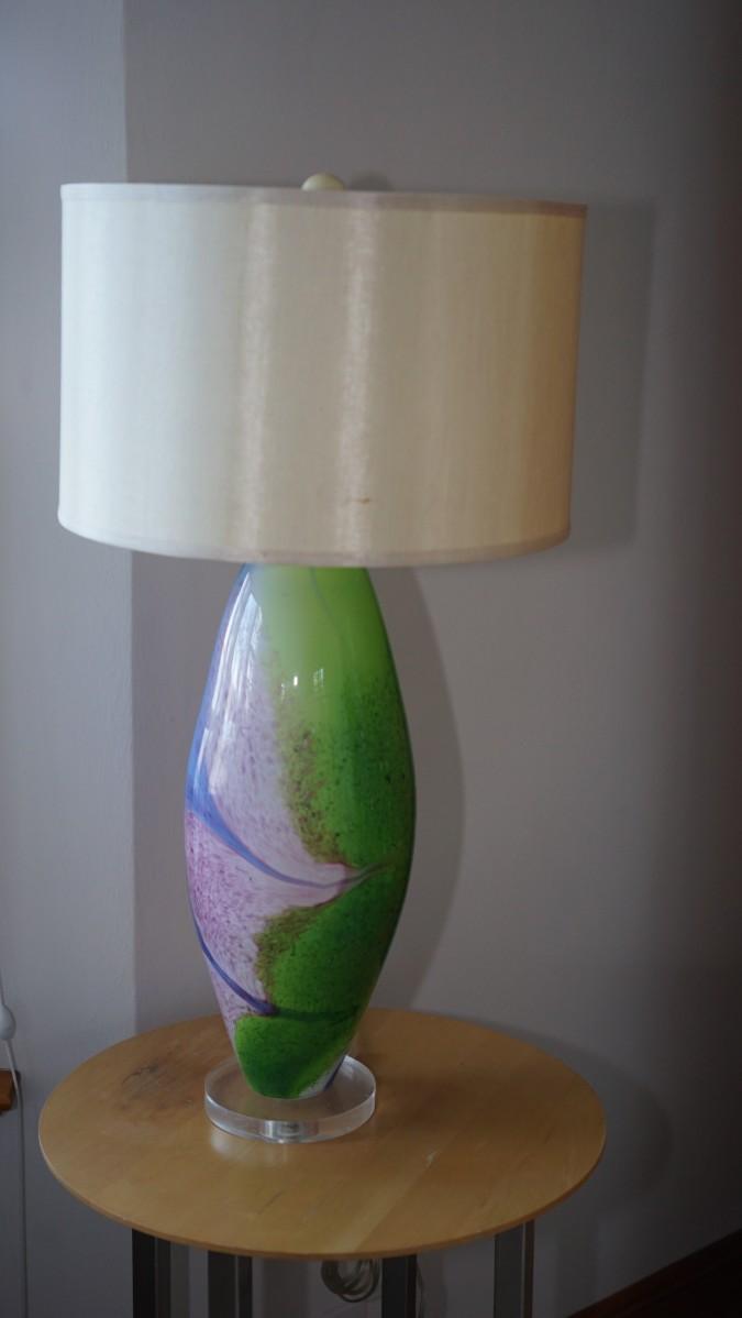 height 29" art glass table lamp. the colors blended of green with pink and purple accent with clear casing . rests on a round plexiglass base. fabric shade of natural color. the lamp is of quality. has a ivory colored round knob final to the shade. The center circumference is 23"