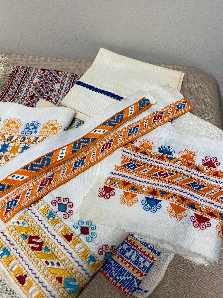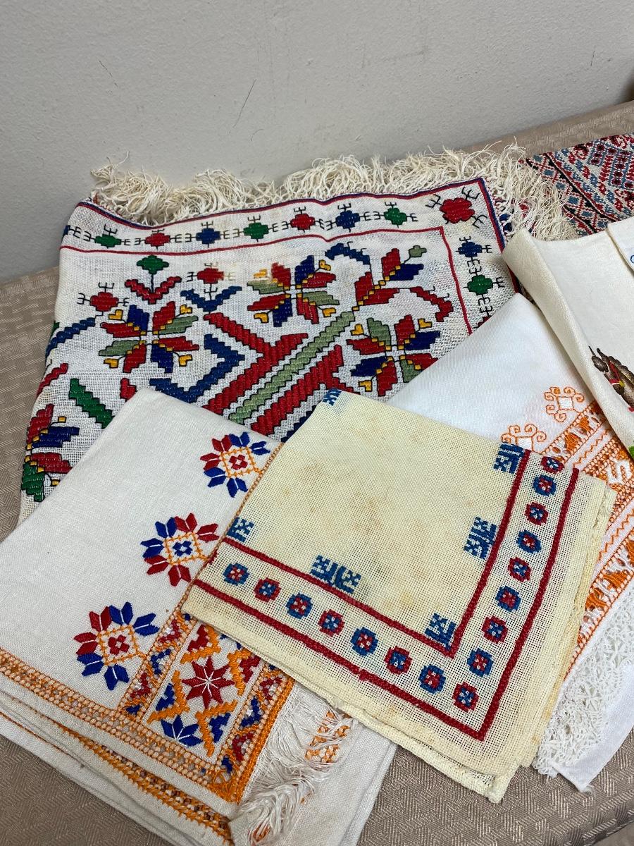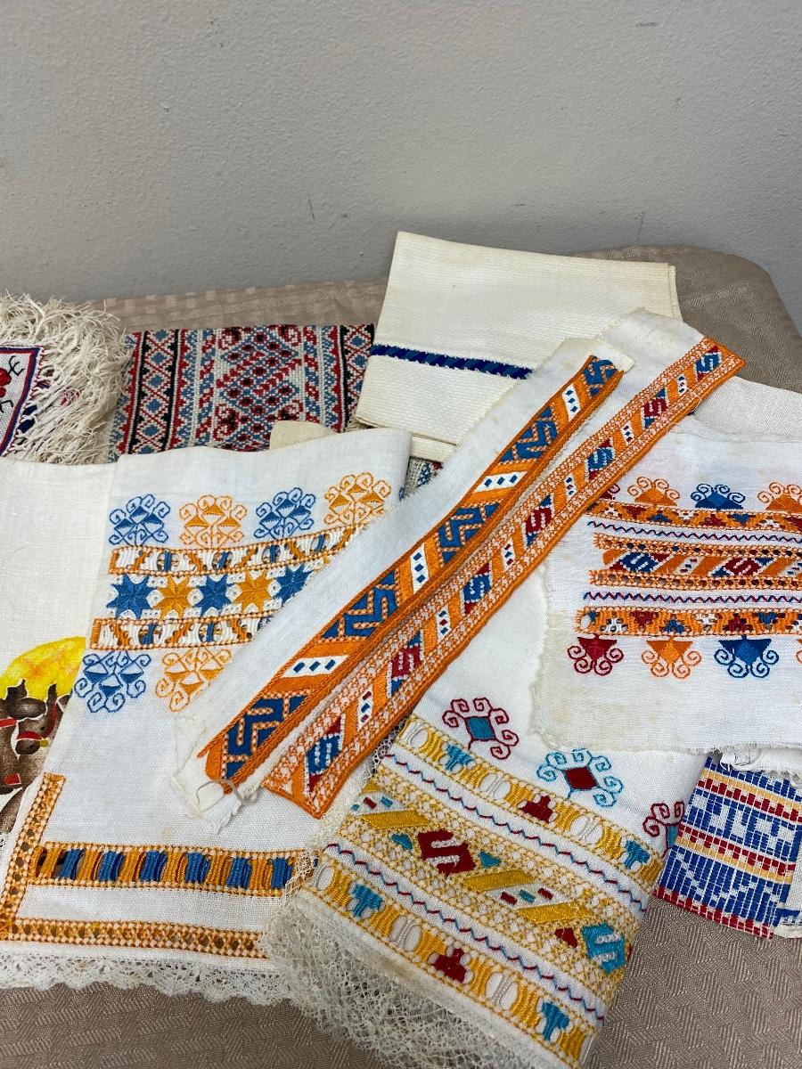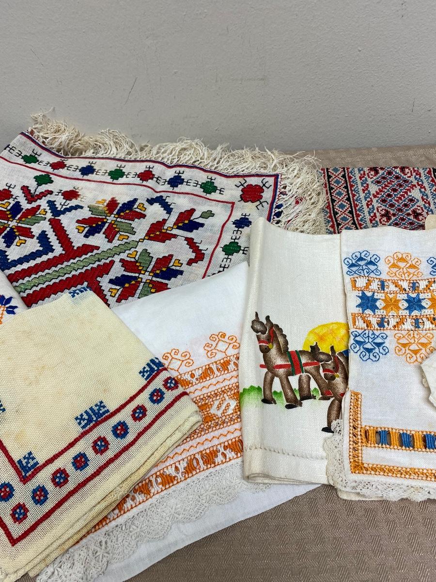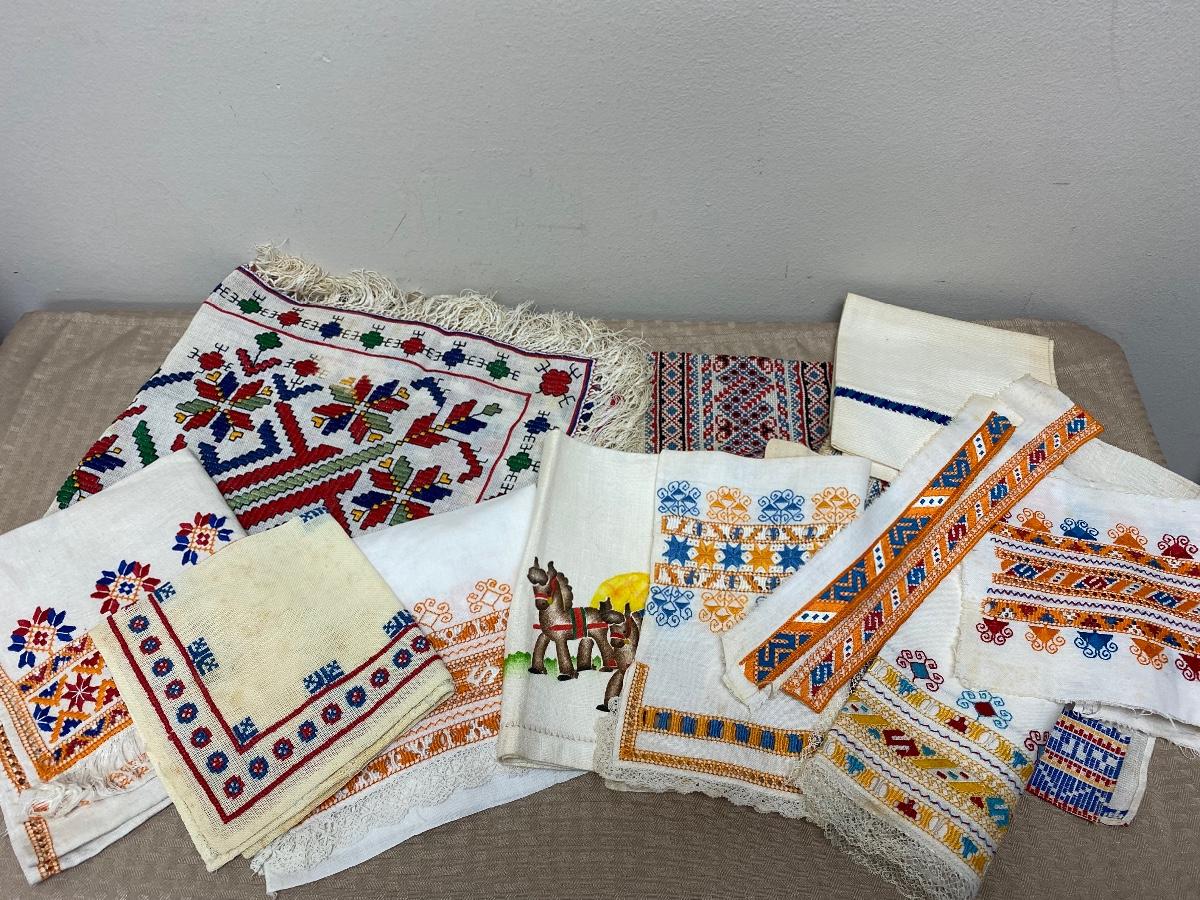 Vintage lot of colorful linens. Embroidered towels, napkins, and handkerchiefs included. No major spots or stains noticed. May have light discolor. This lot has a couple embroidered trim pieces included.
