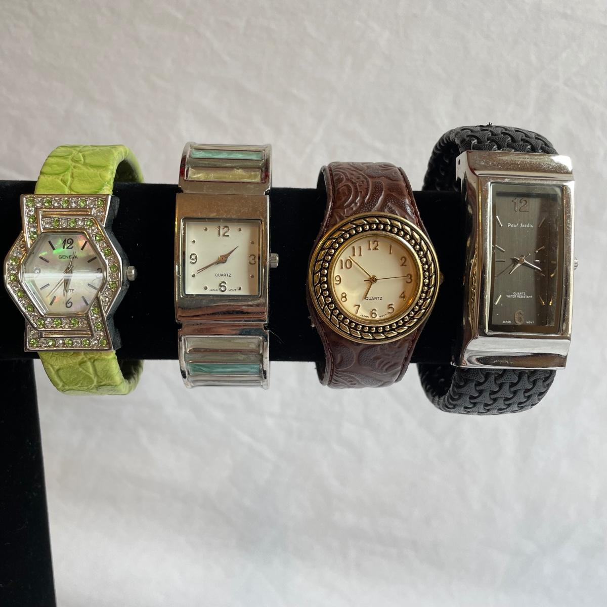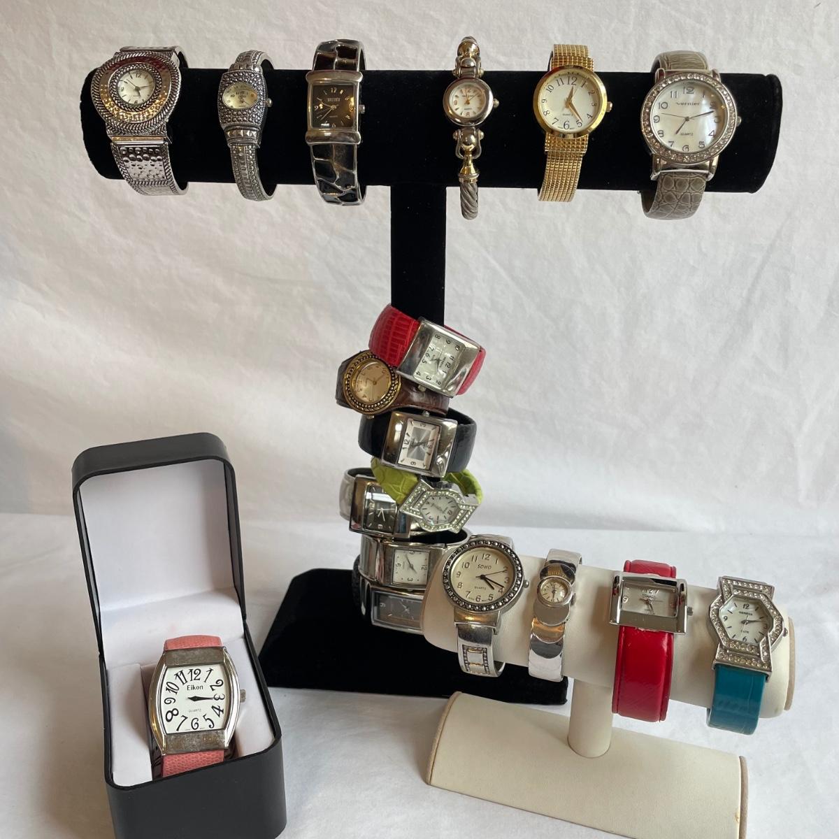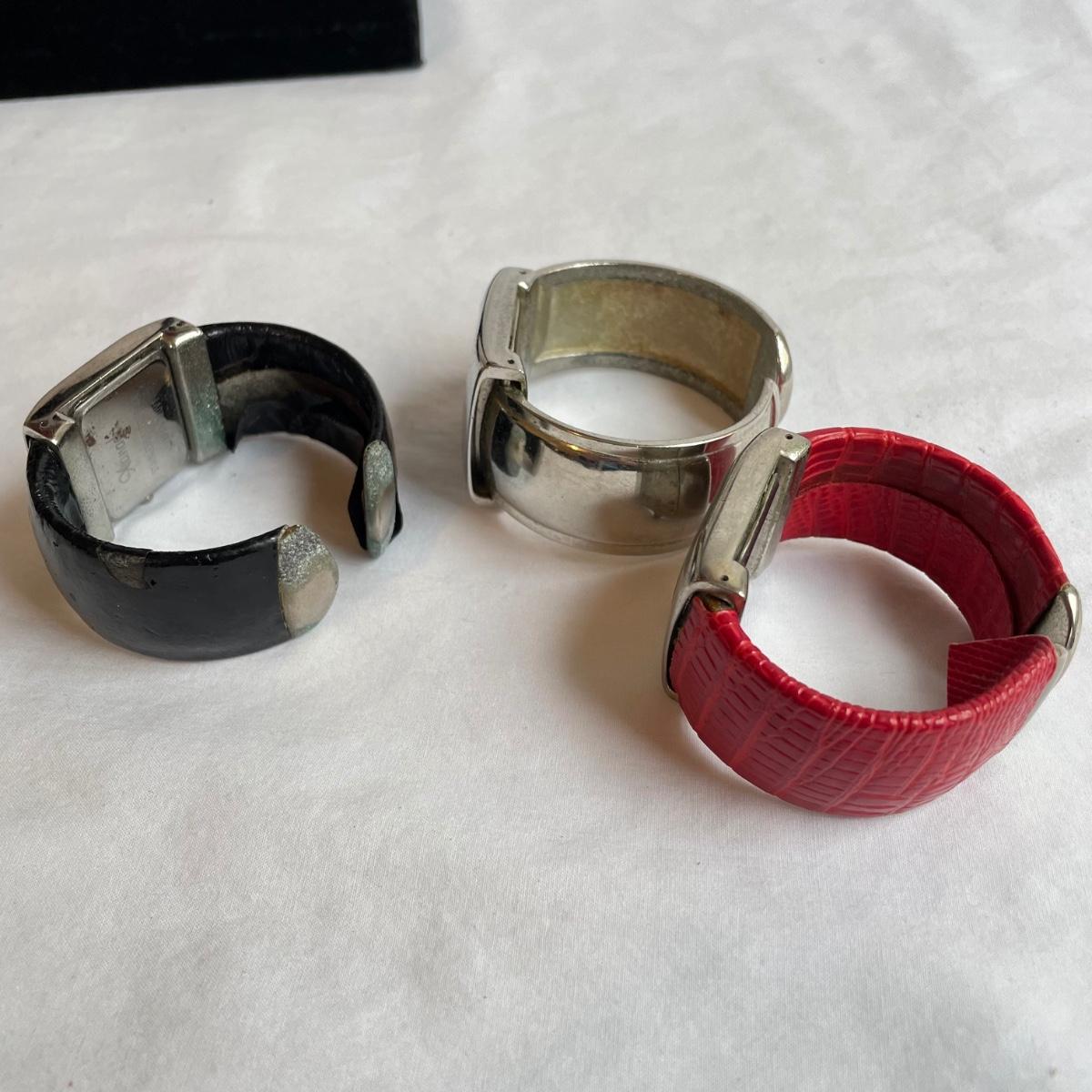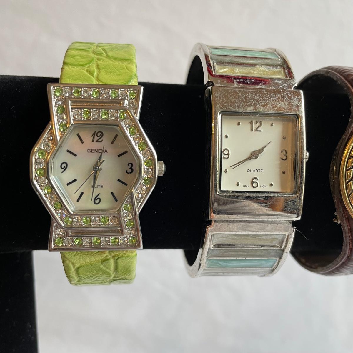 A very fun selection of cuffed watches in a variety of colors and styles. Brands include Geneva, Vernier, Kessaris, SoHo, Waltham, Mira and more. Some bands are made from a thick leather-like material and others are metal. There are examples of wear shown in photos, some need a quick glue to their band wrapping, others are missing a back plate. Watches were not tested. All sales are final. No returns or refunds. Please bid accordingly. Shipping Available.