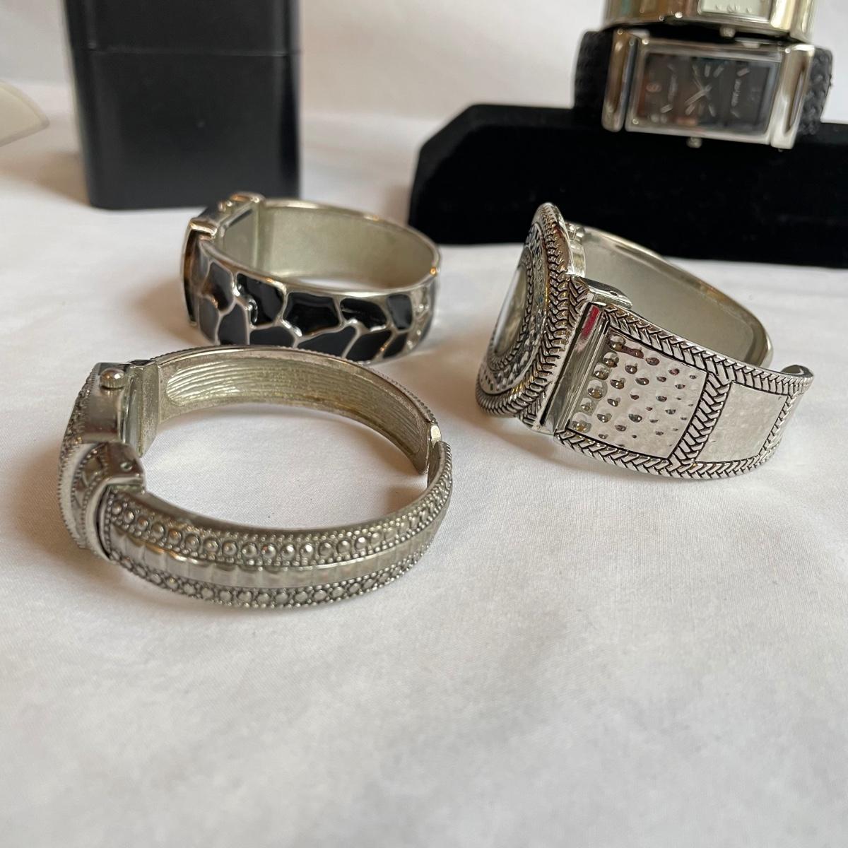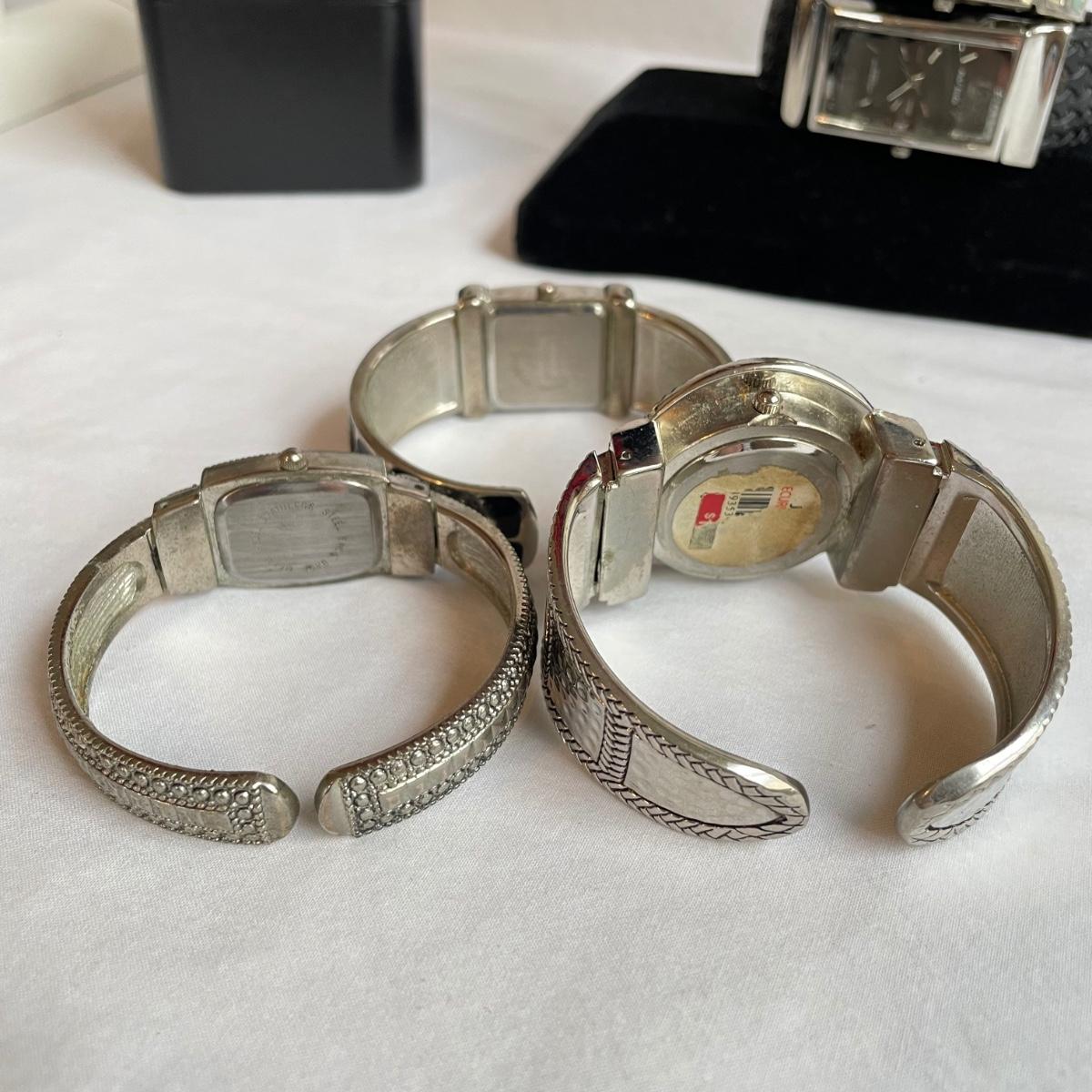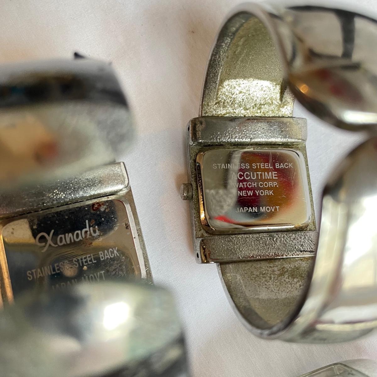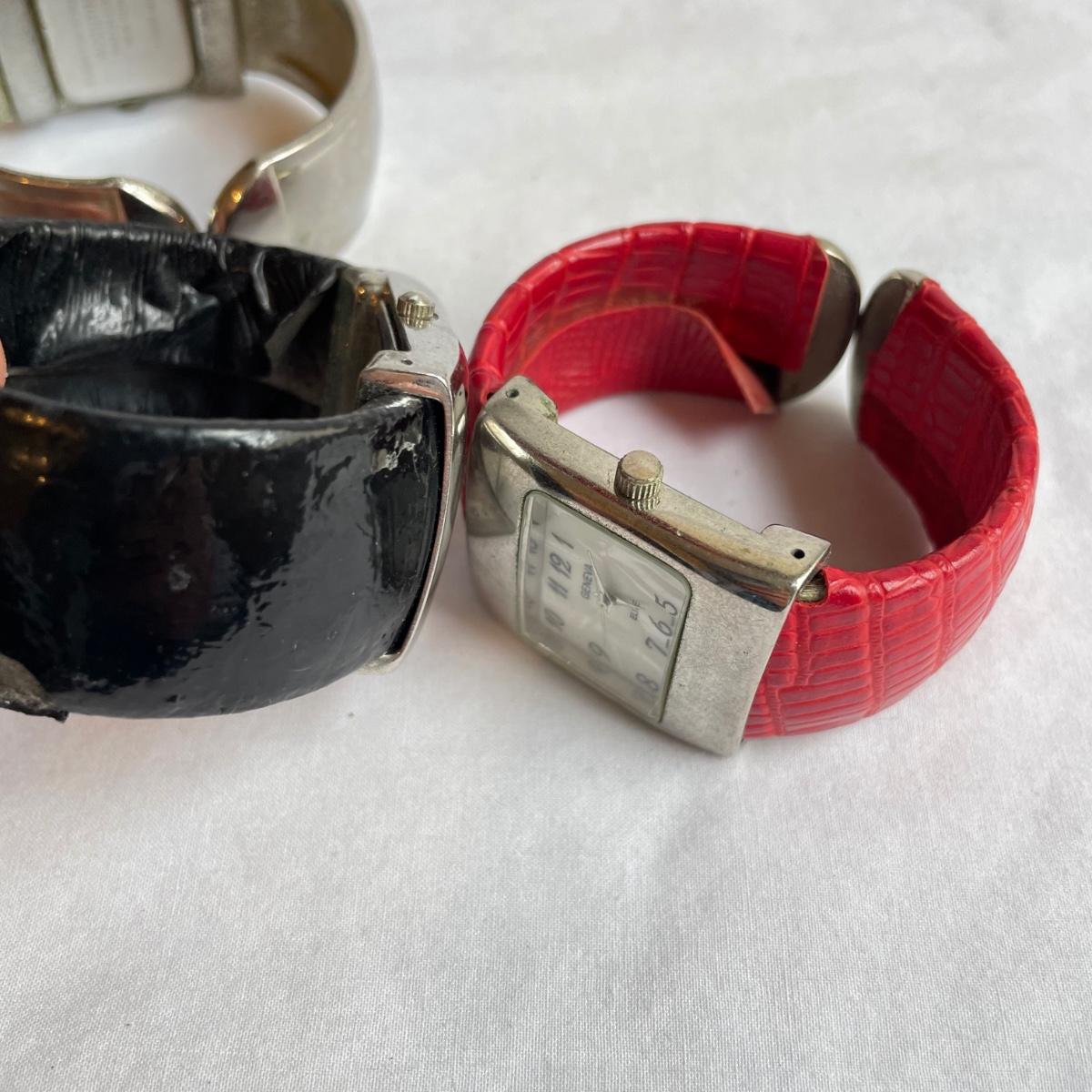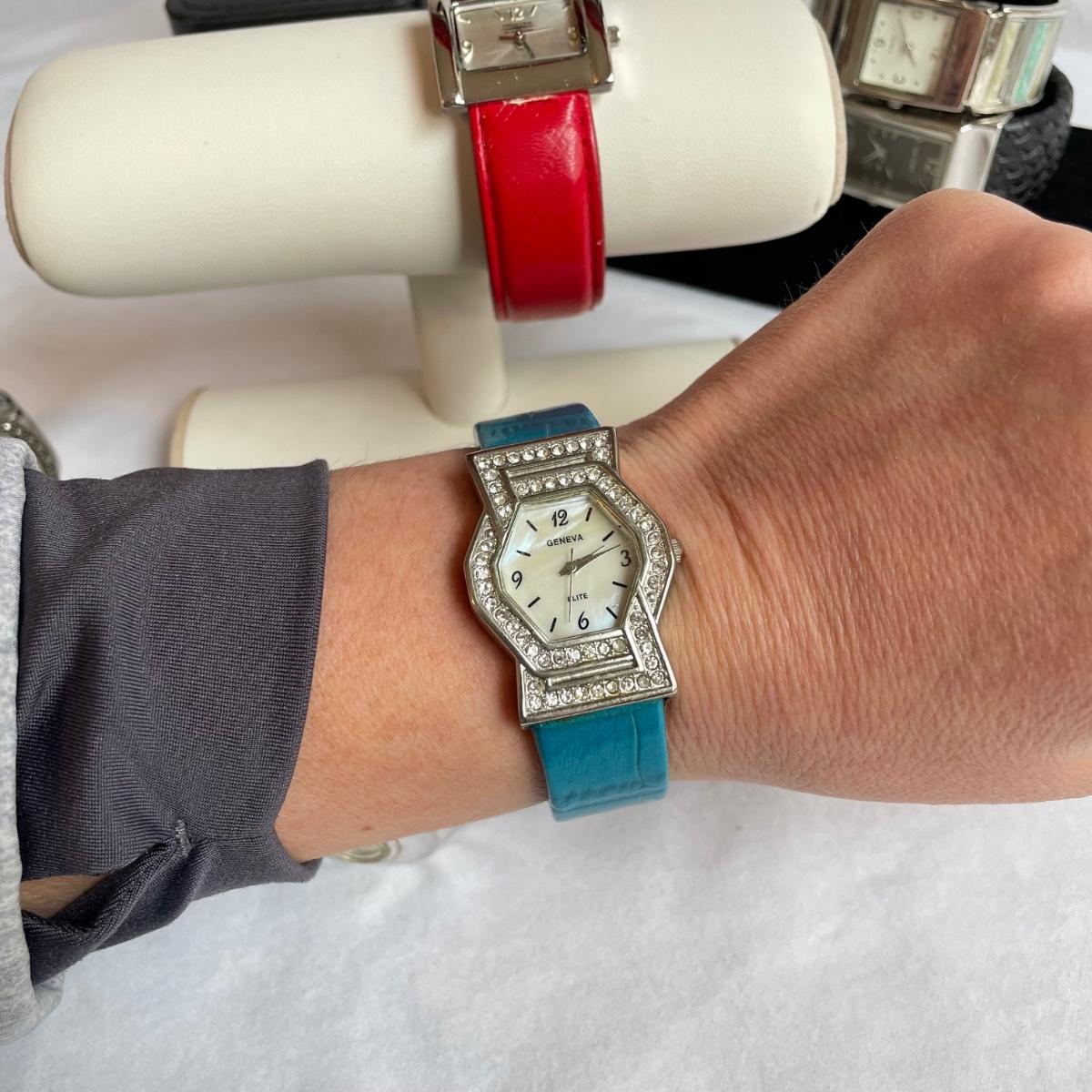 A very fun selection of cuffed watches in a variety of colors and styles. Brands include Geneva, Vernier, Kessaris, SoHo, Waltham, Mira and more. Some bands are made from a thick leather-like material and others are metal. There are examples of wear shown in photos, some need a quick glue to their band wrapping, others are missing a back plate. Watches were not tested. All sales are final. No returns or refunds. Please bid accordingly. Shipping Available.