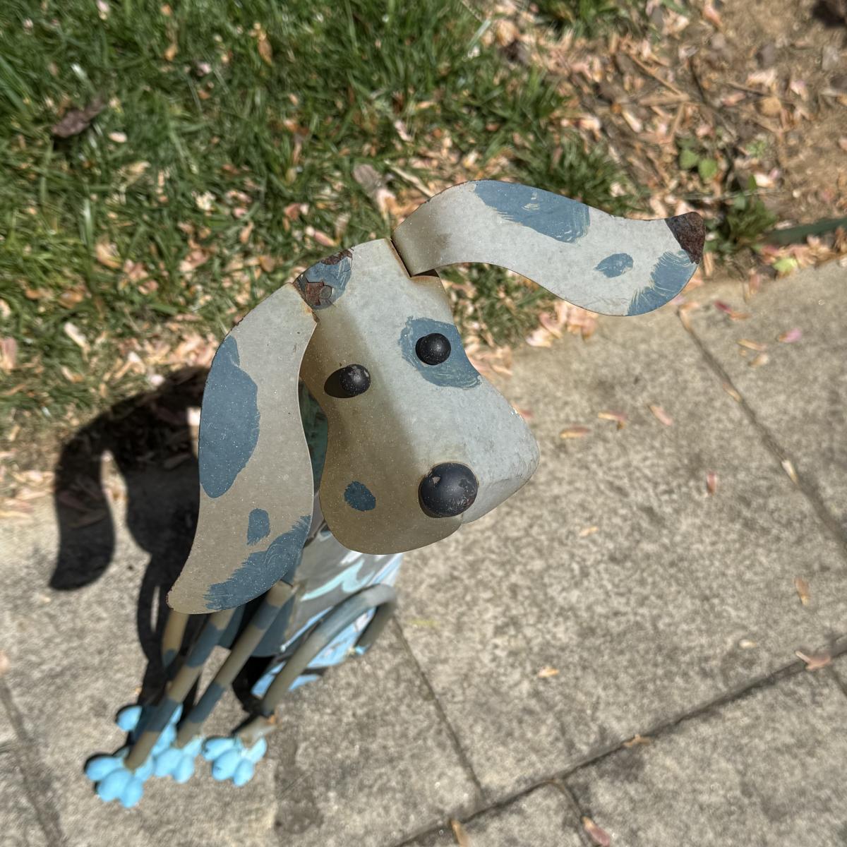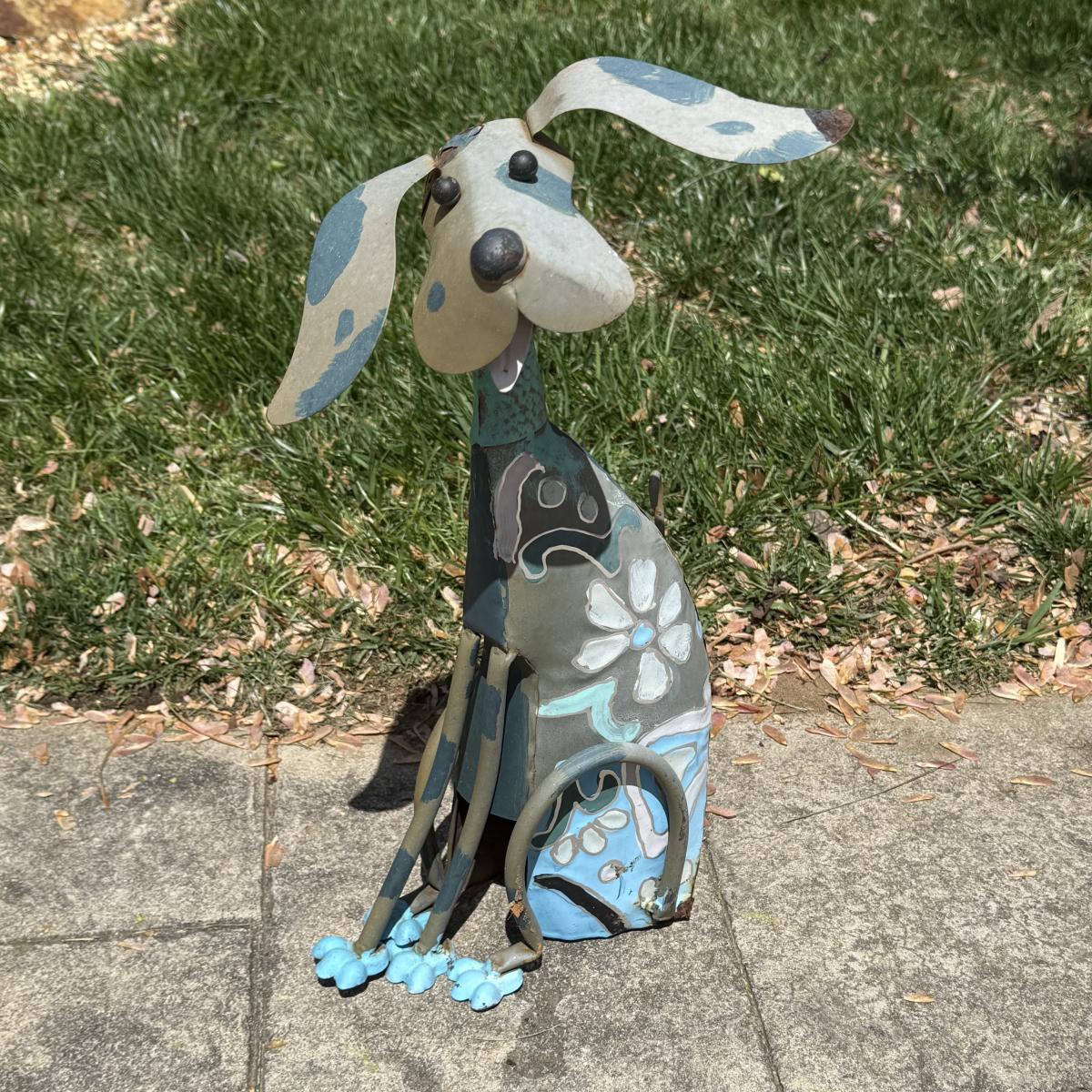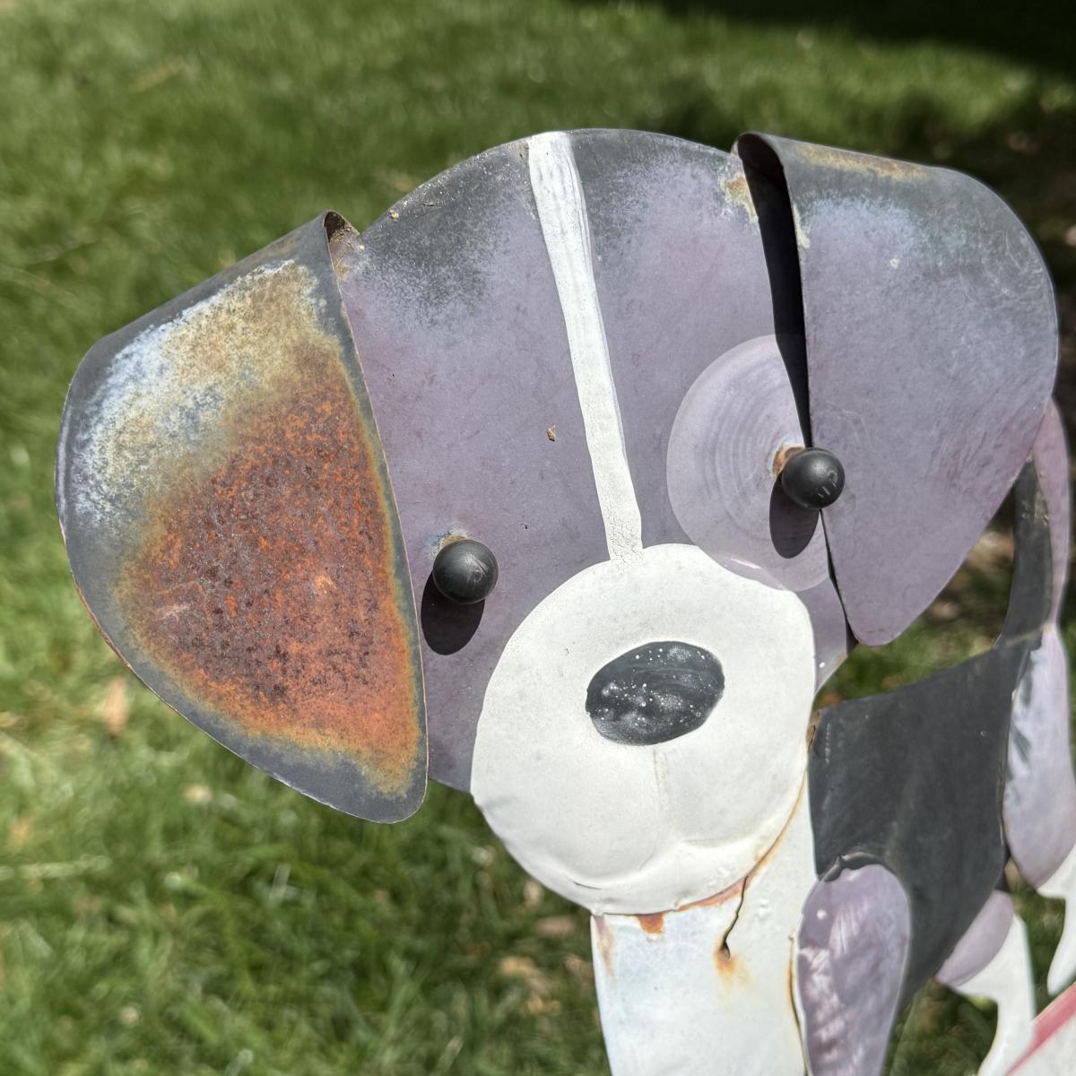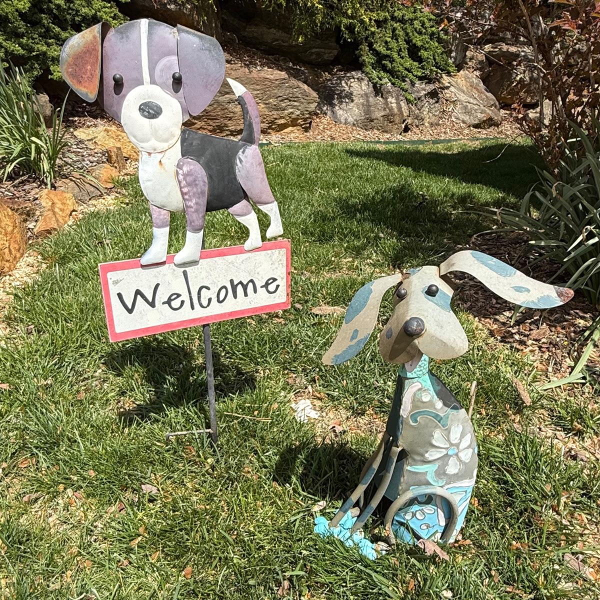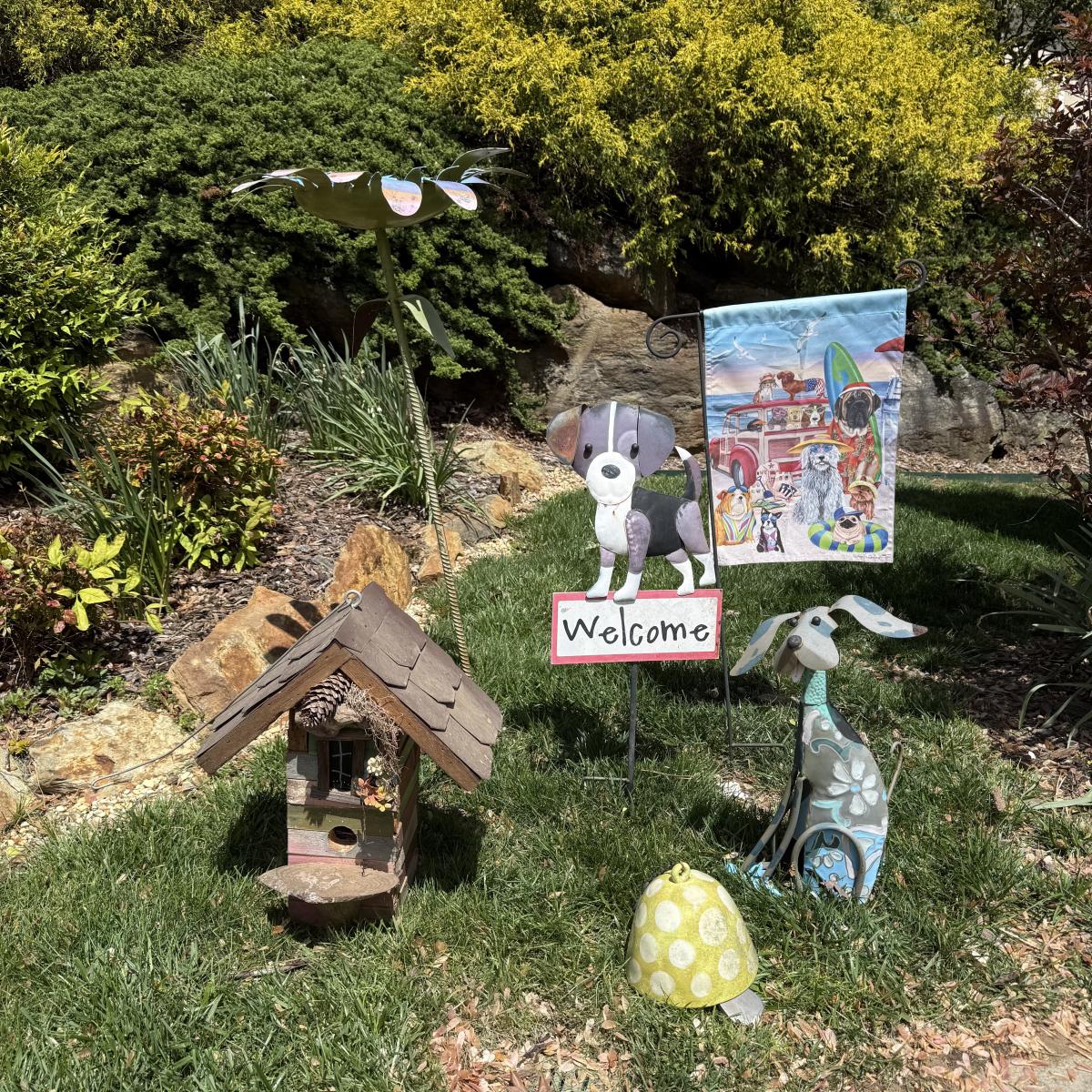 This fun collection of colorful garden decor items includes a birdhouse, a tall metal flower, two metal dogs, a mushroom cap bell, a glass wind chime, two flag stakes with four flags, and a wood and glass floral art piece. For reference, the tall metal flower is approximately 17.5”D x 48”H. The birdhouse is made of wood and has some natural elements, with plastic shingles. The mushroom bell is ceramic. Some rust and wear are found on some items. The wooden post of the glass/wood flower needs a stake added to keep it upright in the ground.