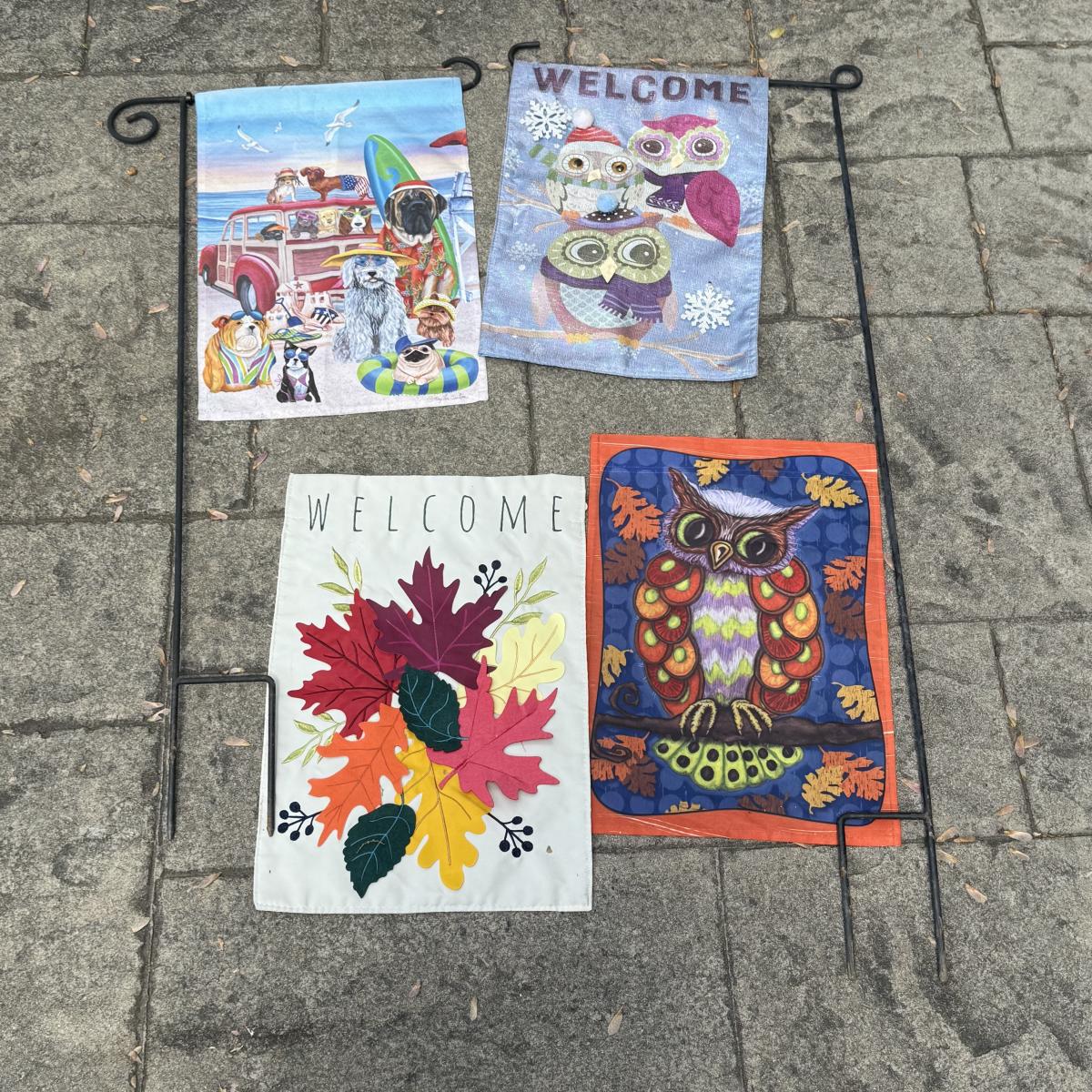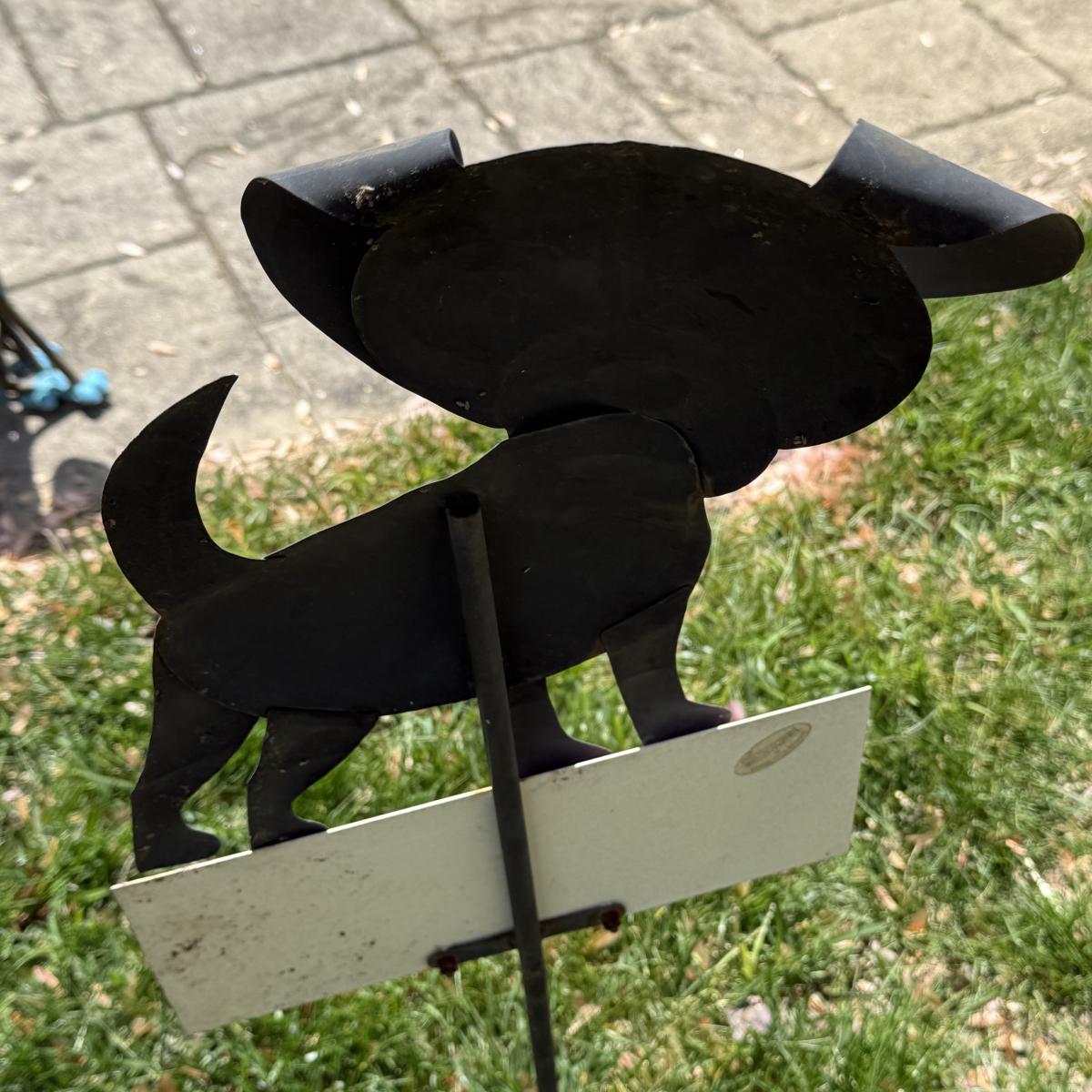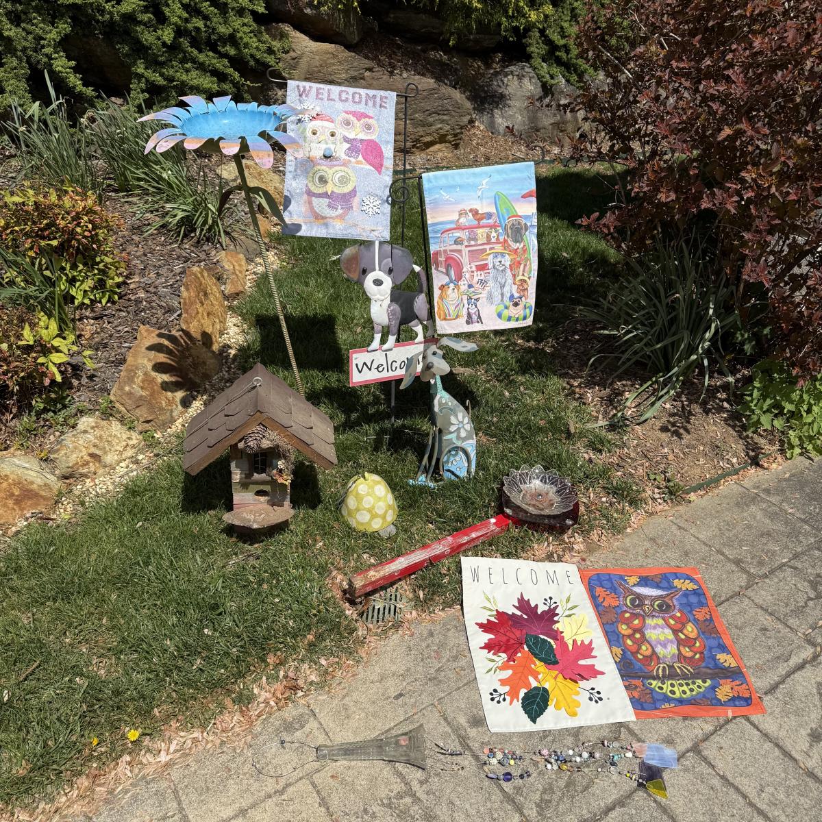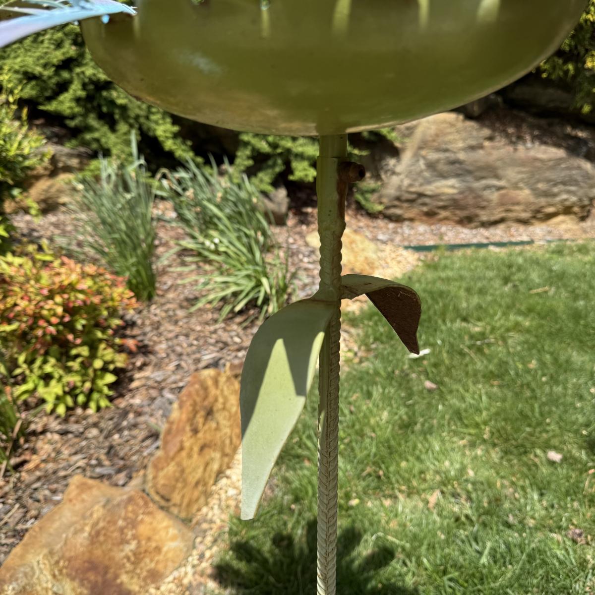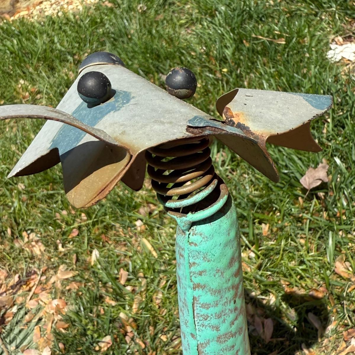 This fun collection of colorful garden decor items includes a birdhouse, a tall metal flower, two metal dogs, a mushroom cap bell, a glass wind chime, two flag stakes with four flags, and a wood and glass floral art piece. For reference, the tall metal flower is approximately 17.5”D x 48”H. The birdhouse is made of wood and has some natural elements, with plastic shingles. The mushroom bell is ceramic. Some rust and wear are found on some items. The wooden post of the glass/wood flower needs a stake added to keep it upright in the ground.