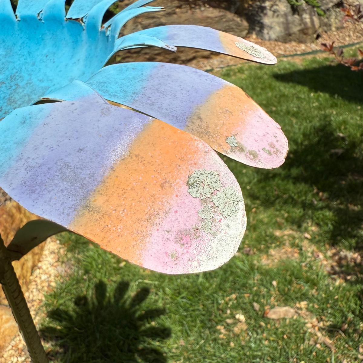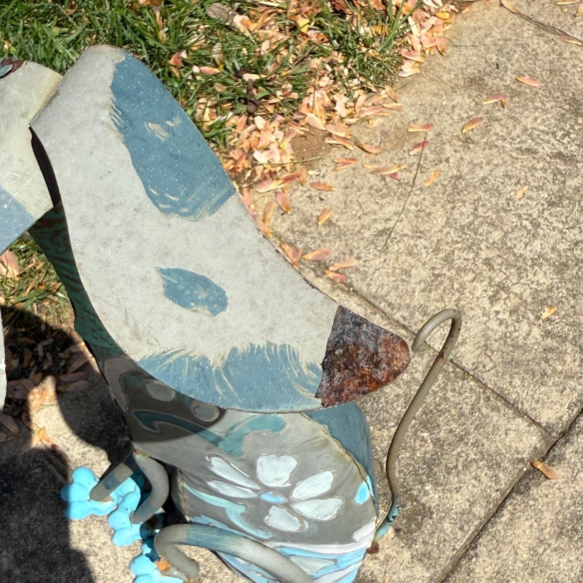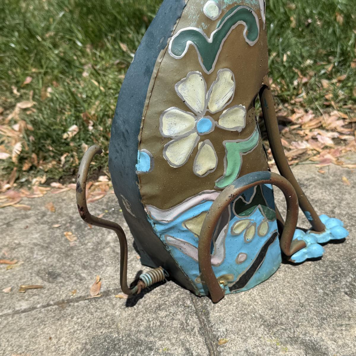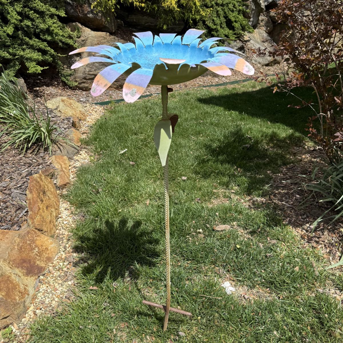 This fun collection of colorful garden decor items includes a birdhouse, a tall metal flower, two metal dogs, a mushroom cap bell, a glass wind chime, two flag stakes with four flags, and a wood and glass floral art piece. For reference, the tall metal flower is approximately 17.5”D x 48”H. The birdhouse is made of wood and has some natural elements, with plastic shingles. The mushroom bell is ceramic. Some rust and wear are found on some items. The wooden post of the glass/wood flower needs a stake added to keep it upright in the ground.