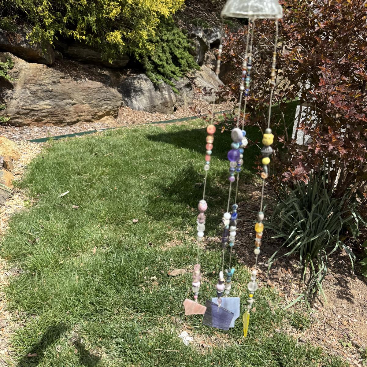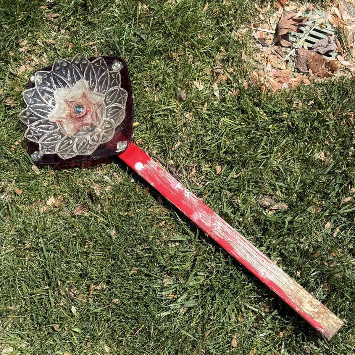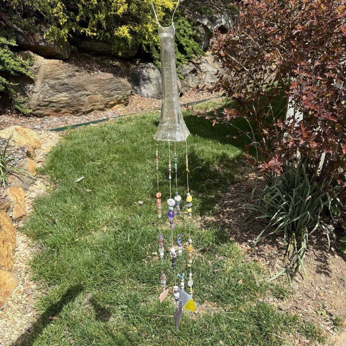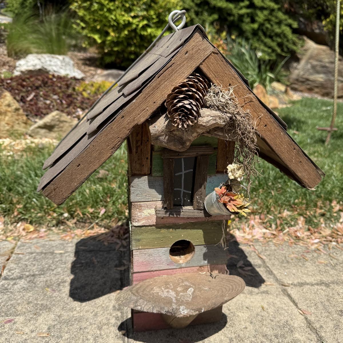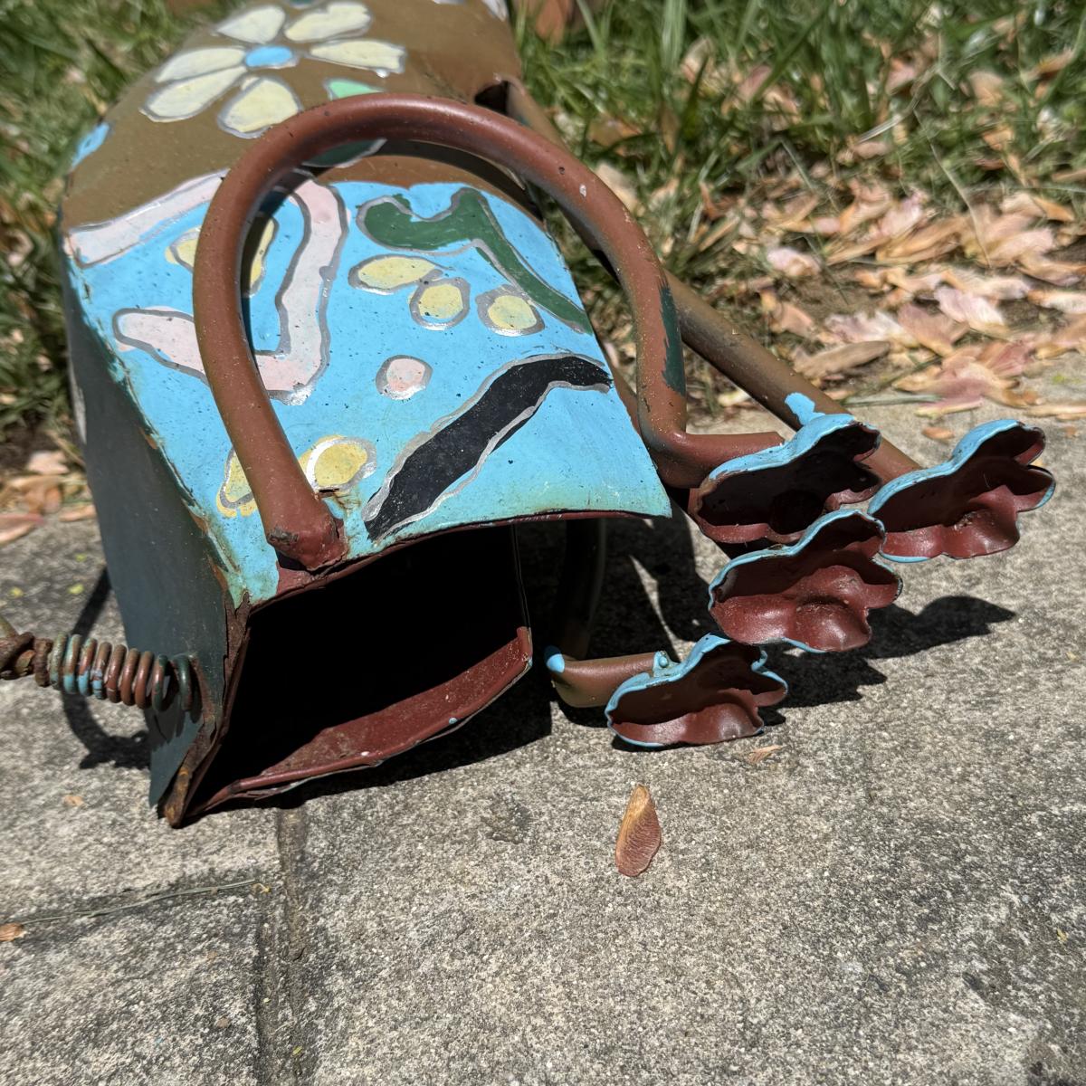 This fun collection of colorful garden decor items includes a birdhouse, a tall metal flower, two metal dogs, a mushroom cap bell, a glass wind chime, two flag stakes with four flags, and a wood and glass floral art piece. For reference, the tall metal flower is approximately 17.5”D x 48”H. The birdhouse is made of wood and has some natural elements, with plastic shingles. The mushroom bell is ceramic. Some rust and wear are found on some items. The wooden post of the glass/wood flower needs a stake added to keep it upright in the ground.