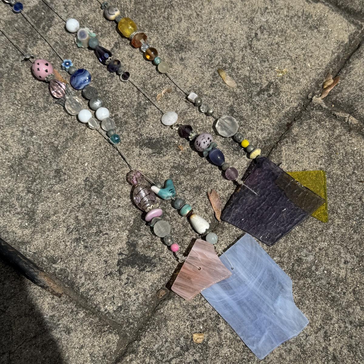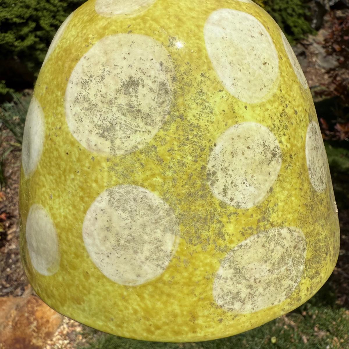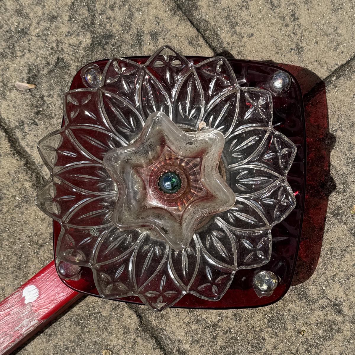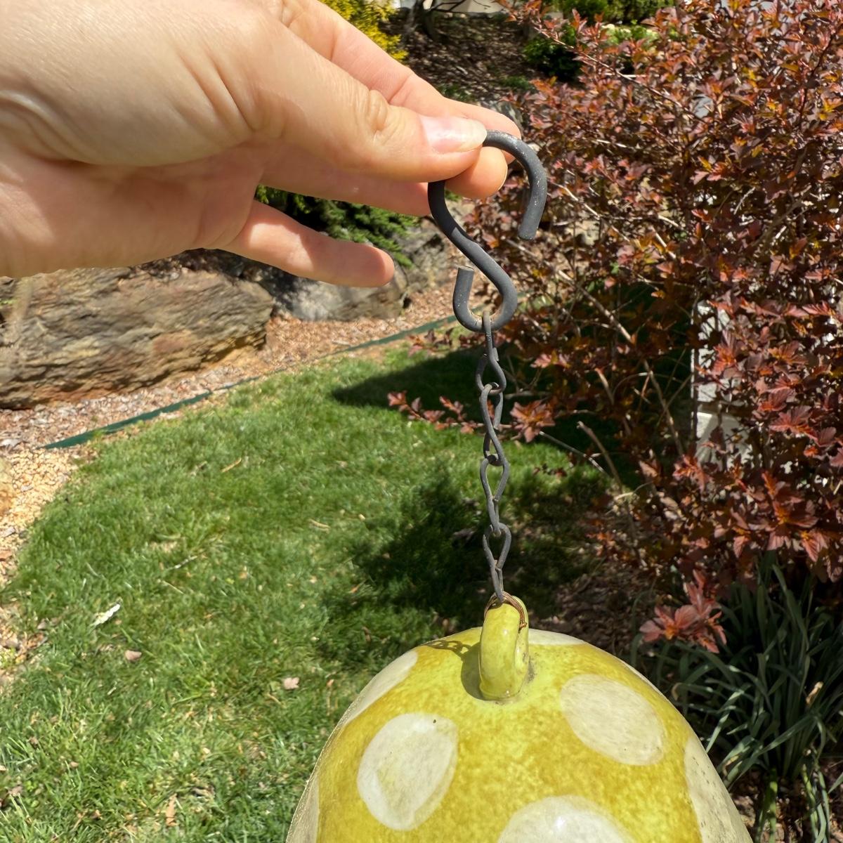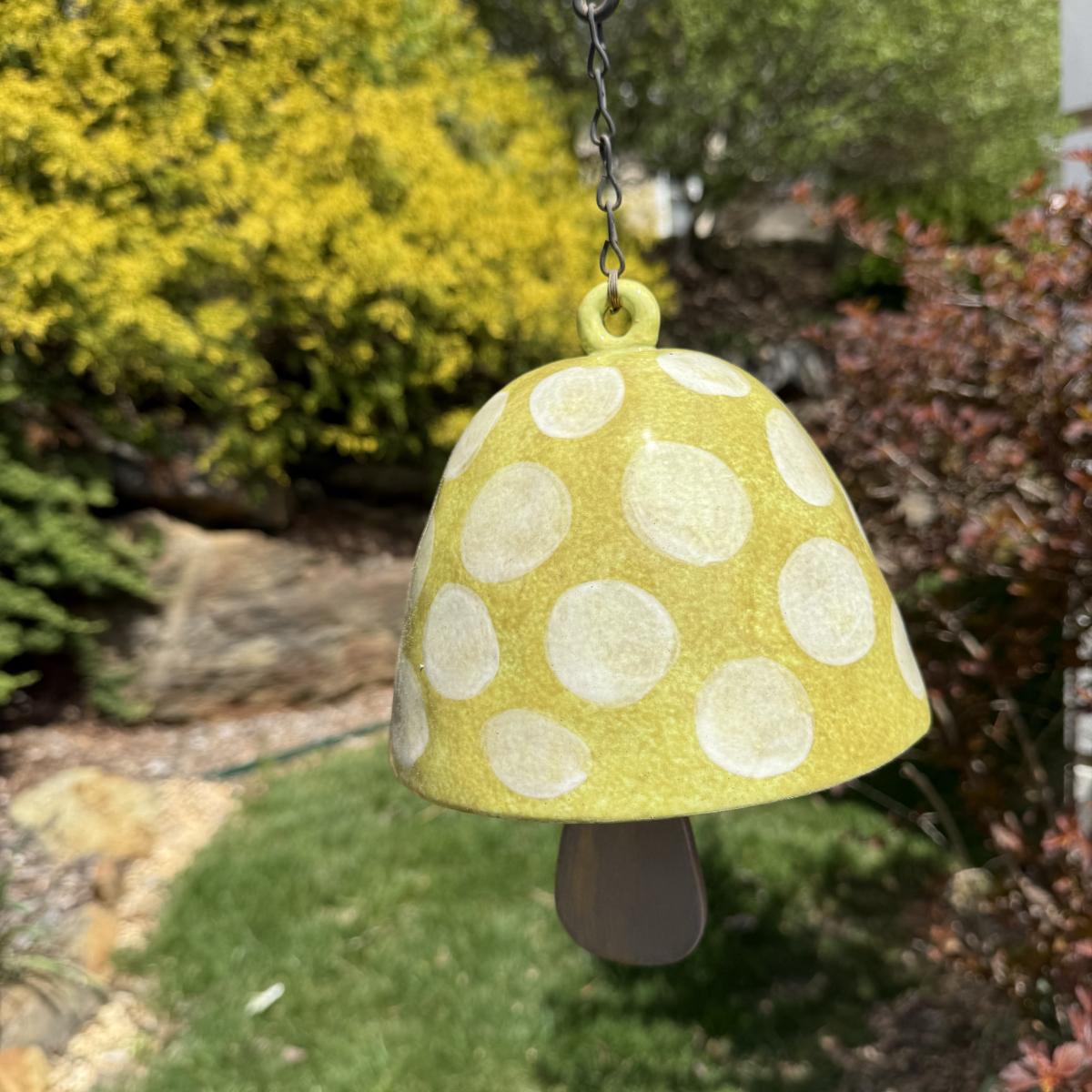 This fun collection of colorful garden decor items includes a birdhouse, a tall metal flower, two metal dogs, a mushroom cap bell, a glass wind chime, two flag stakes with four flags, and a wood and glass floral art piece. For reference, the tall metal flower is approximately 17.5”D x 48”H. The birdhouse is made of wood and has some natural elements, with plastic shingles. The mushroom bell is ceramic. Some rust and wear are found on some items. The wooden post of the glass/wood flower needs a stake added to keep it upright in the ground.