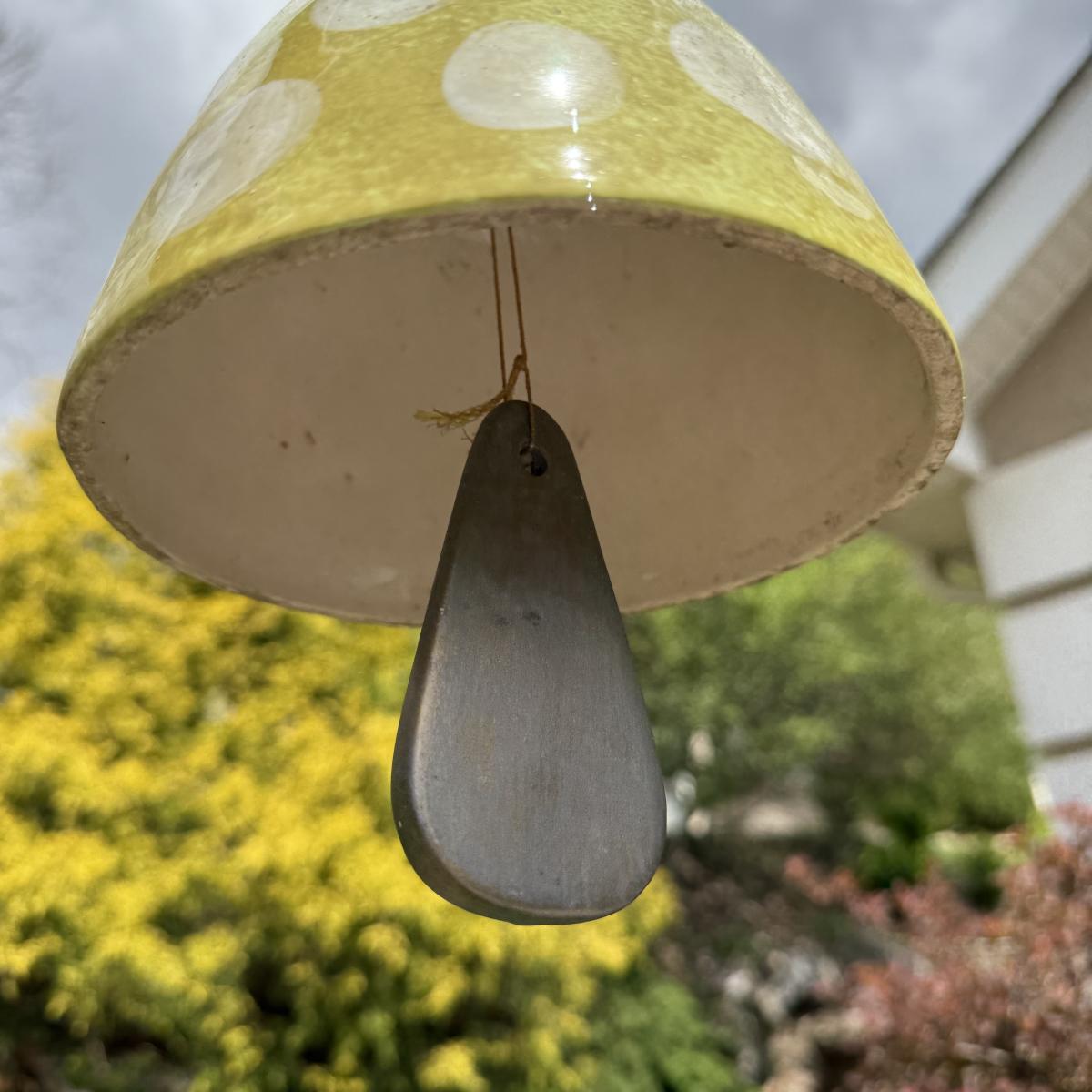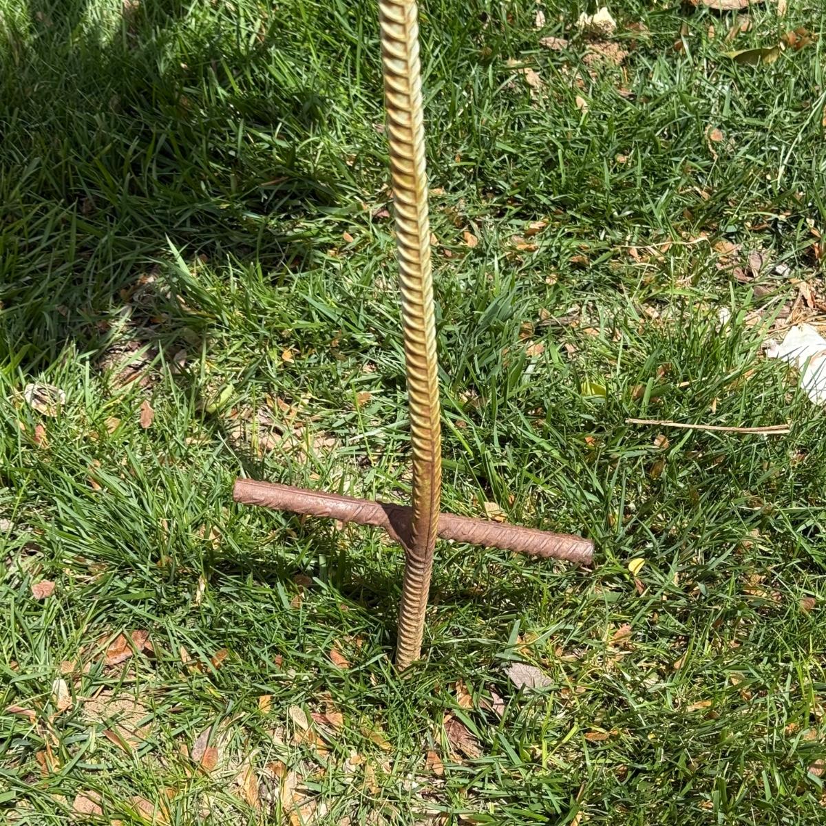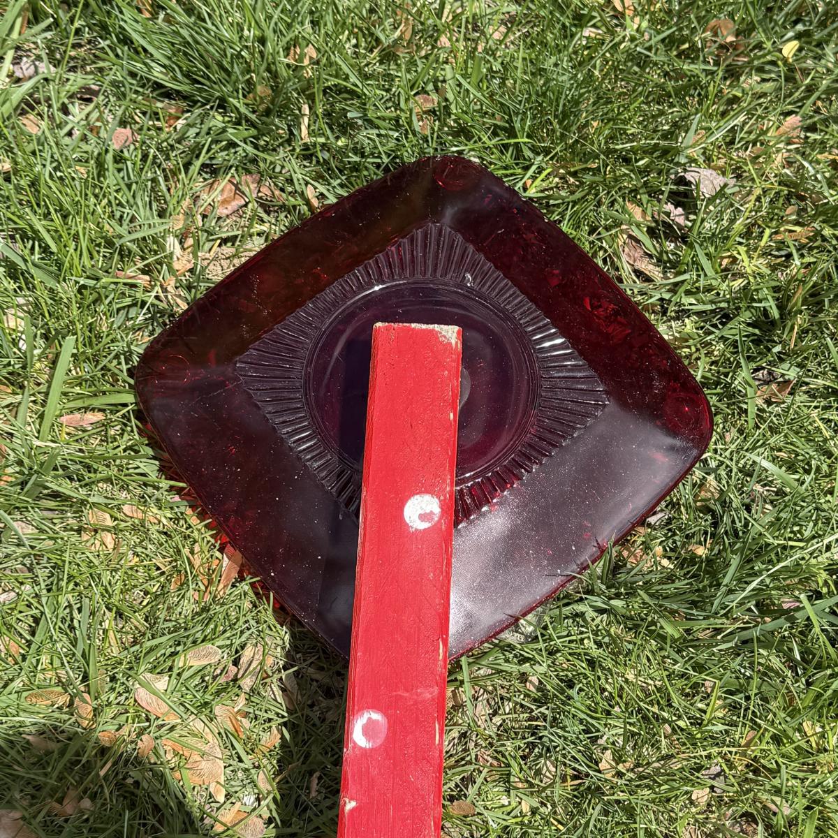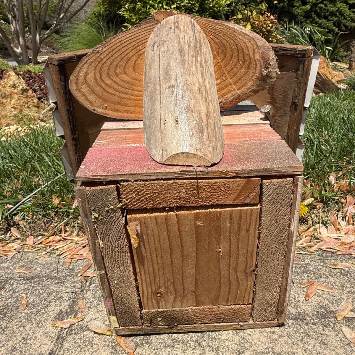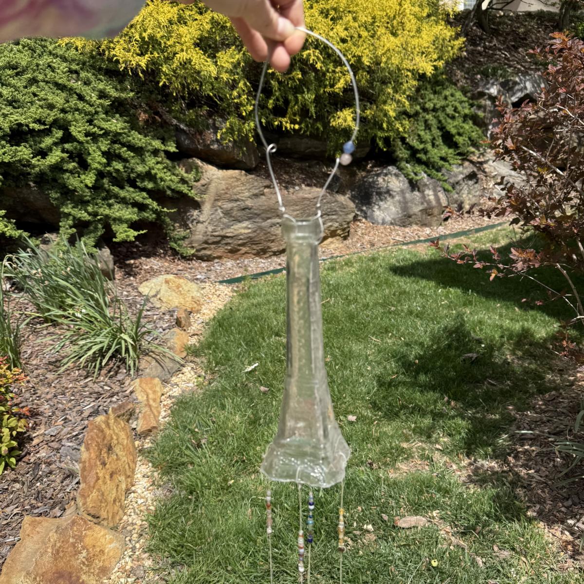 This fun collection of colorful garden decor items includes a birdhouse, a tall metal flower, two metal dogs, a mushroom cap bell, a glass wind chime, two flag stakes with four flags, and a wood and glass floral art piece. For reference, the tall metal flower is approximately 17.5”D x 48”H. The birdhouse is made of wood and has some natural elements, with plastic shingles. The mushroom bell is ceramic. Some rust and wear are found on some items. The wooden post of the glass/wood flower needs a stake added to keep it upright in the ground.