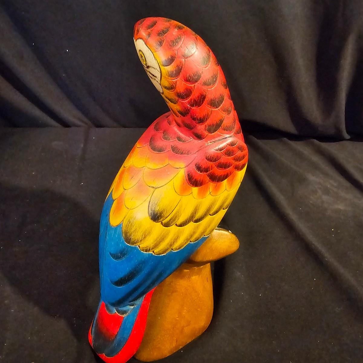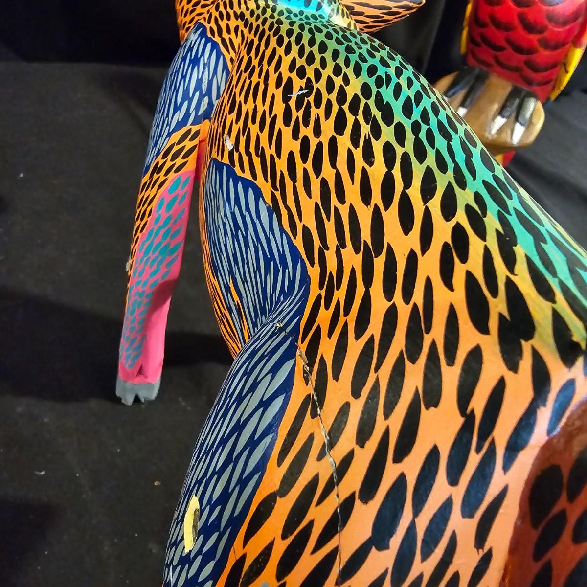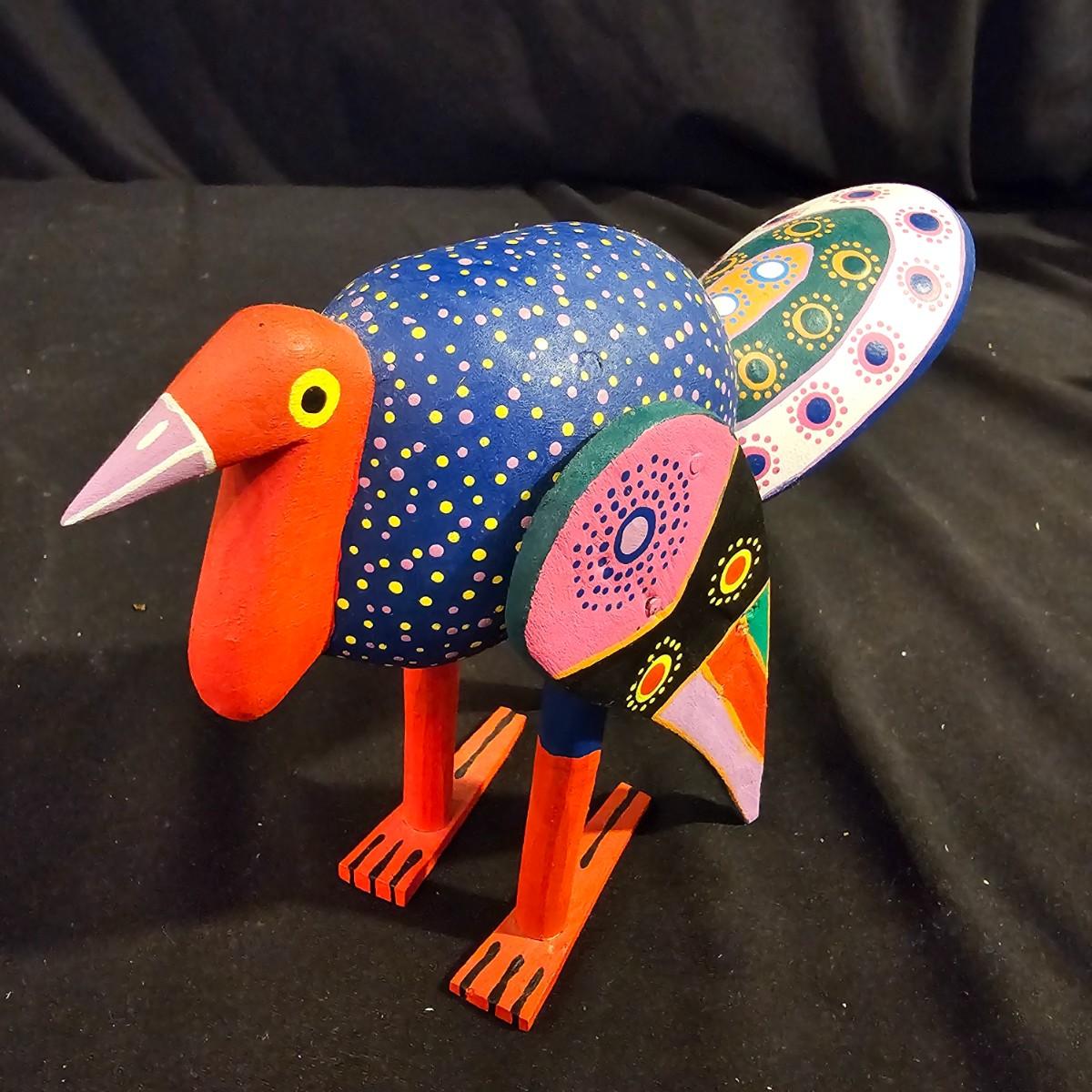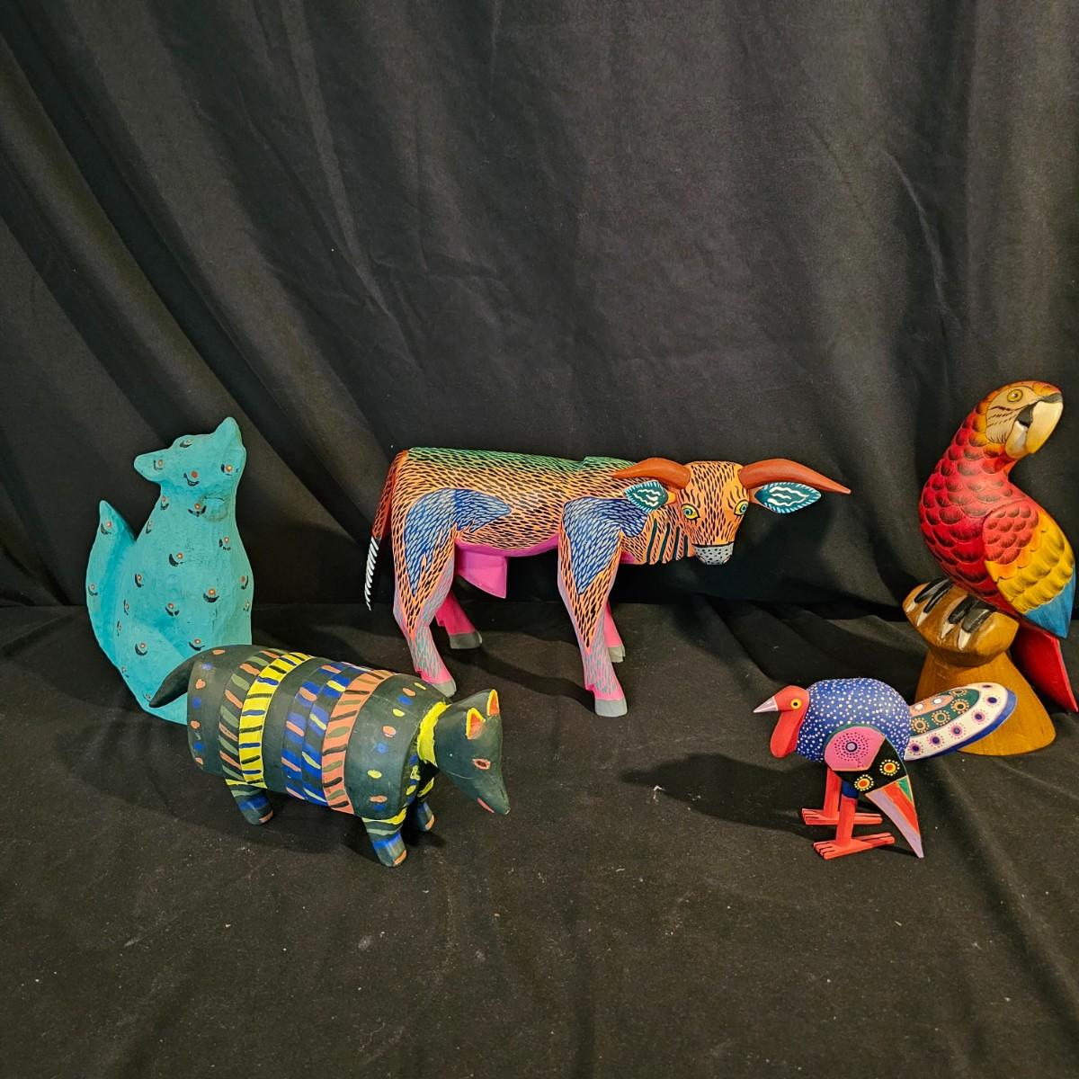Five unique wooden animal figures, all hand painted. Most are signed, see images. Friendly bull is 16" x 5" x 9" H, has small nick on back leg showing attachment point. Parrot is 6" x 4" x 11"H, appears to be hollow. Small turkey is 6.5" x 2.5" x 5"H. See photos for details. Shipping available.