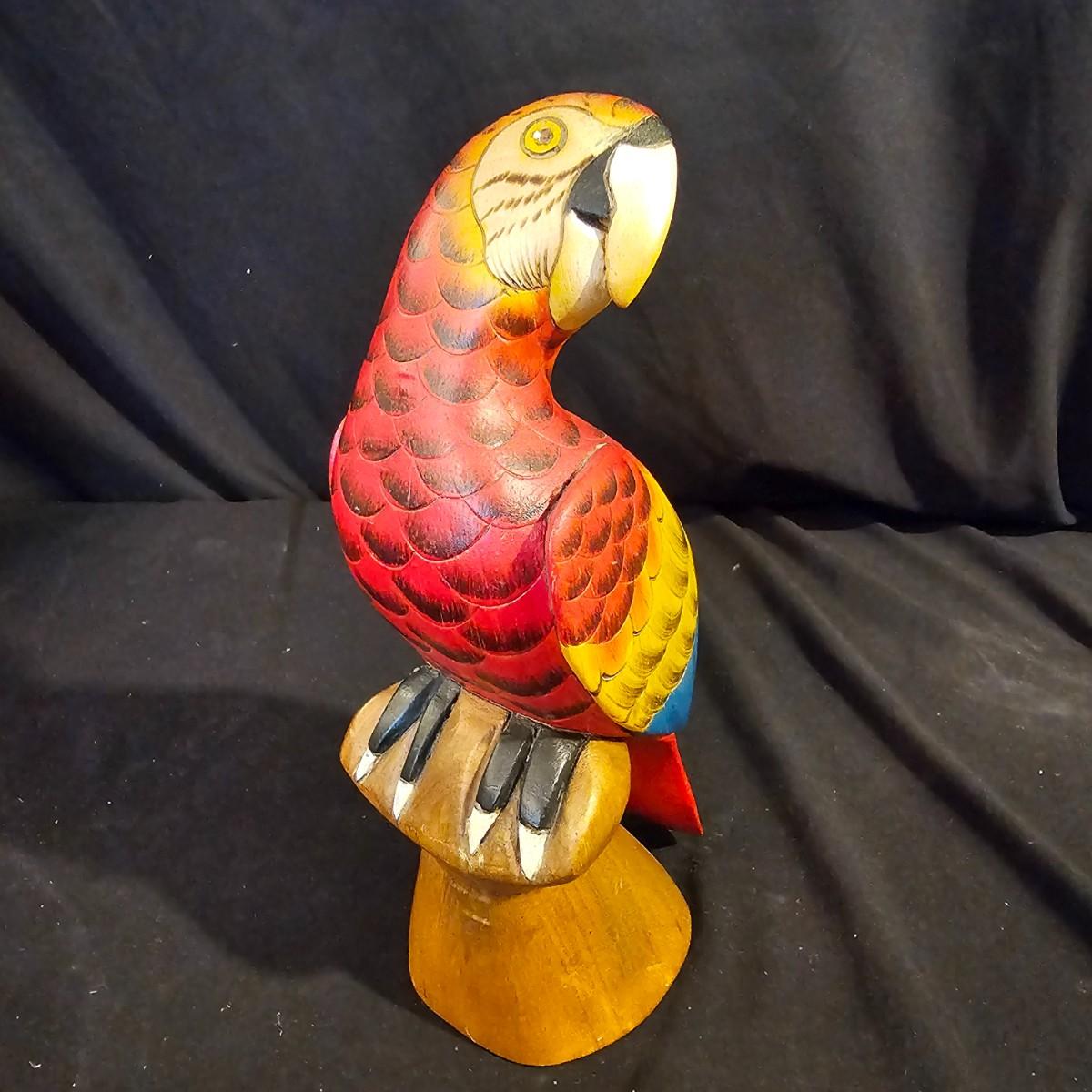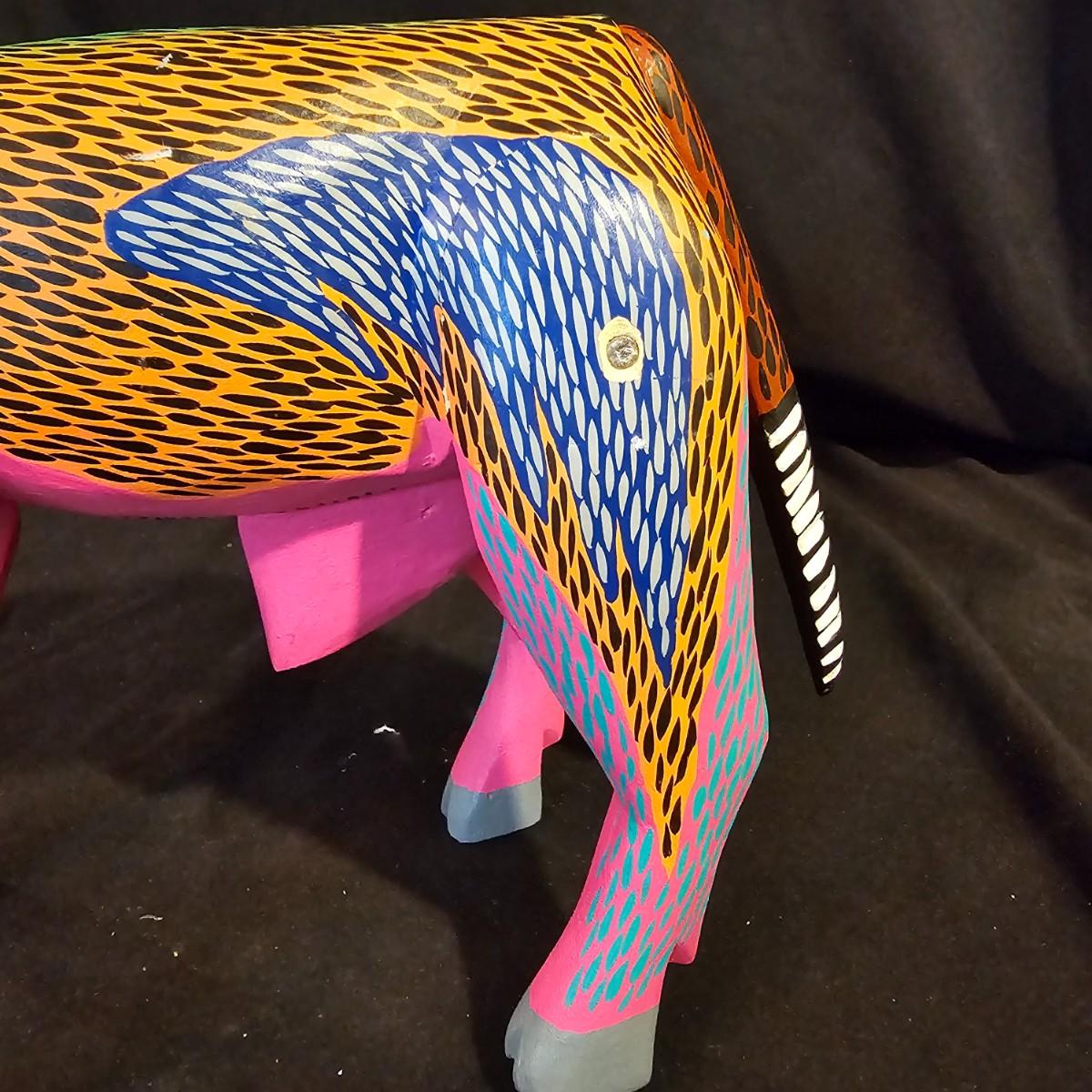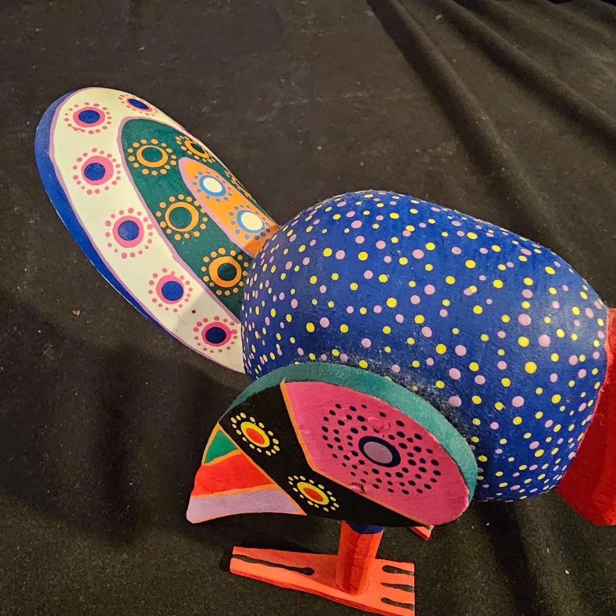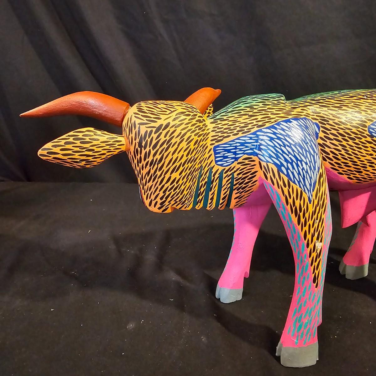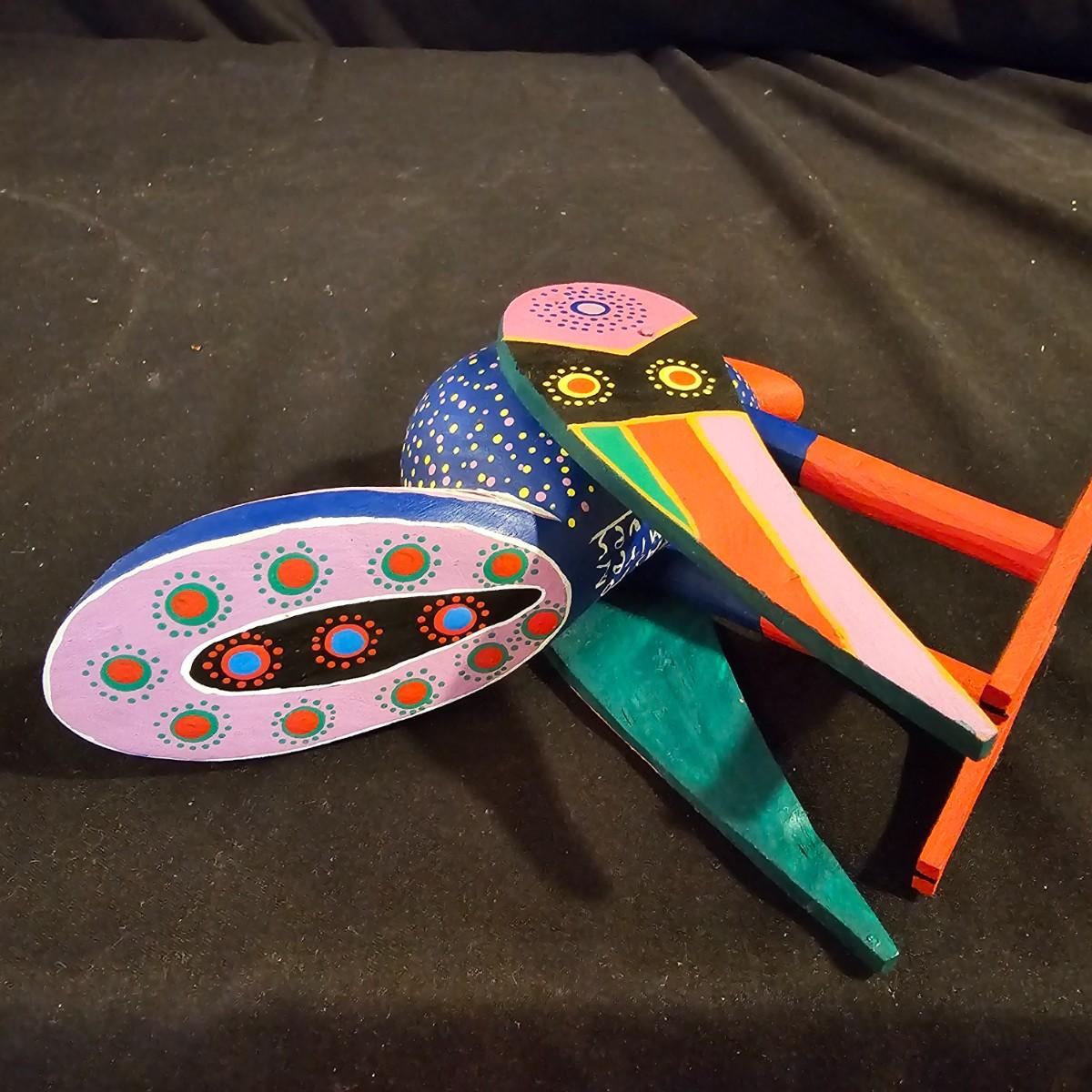 Five unique wooden animal figures, all hand painted. Most are signed, see images. Friendly bull is 16" x 5" x 9" H, has small nick on back leg showing attachment point. Parrot is 6" x 4" x 11"H, appears to be hollow. Small turkey is 6.5" x 2.5" x 5"H. See photos for details. Shipping available.