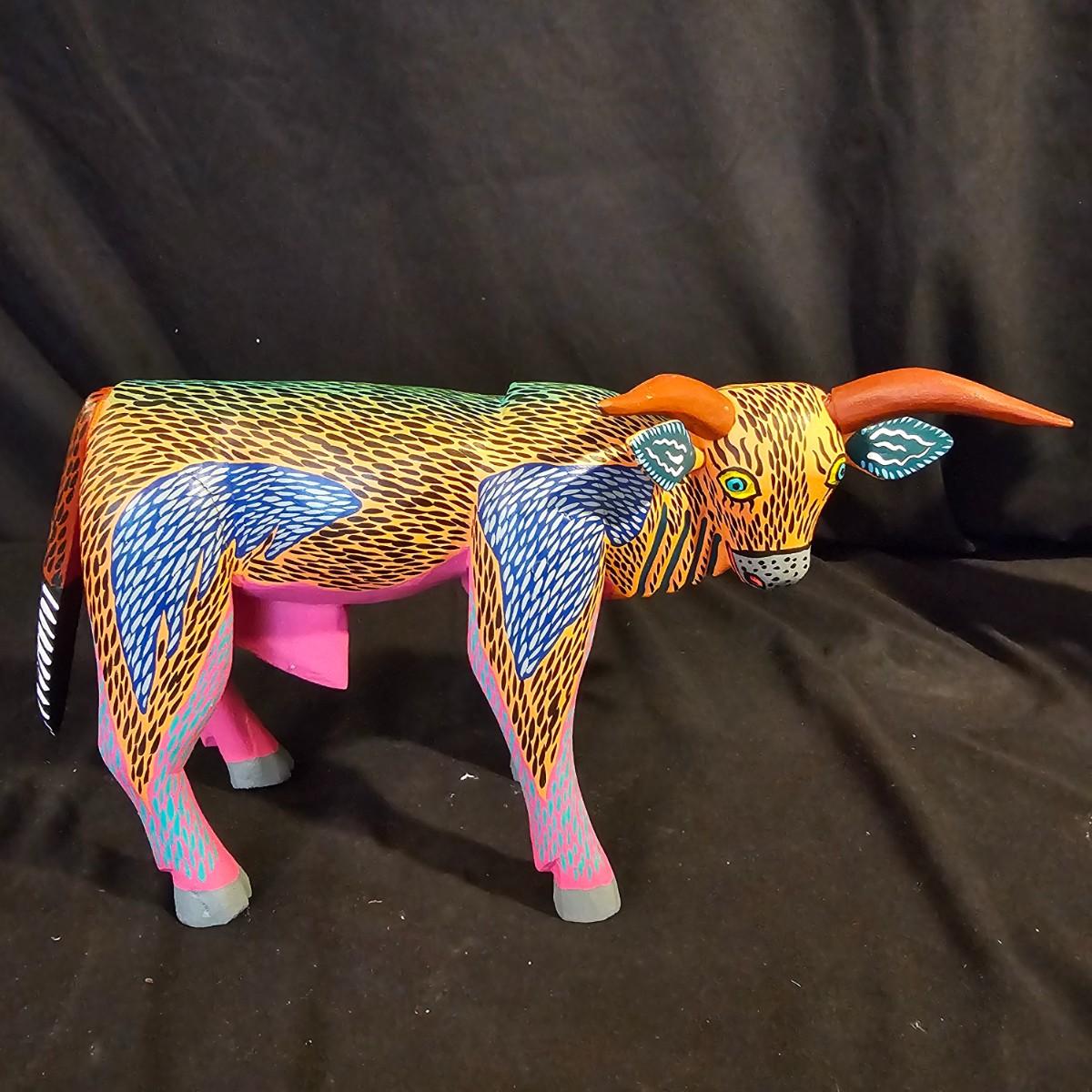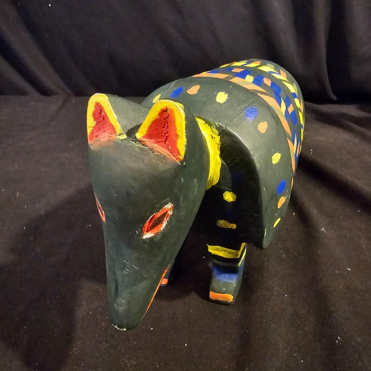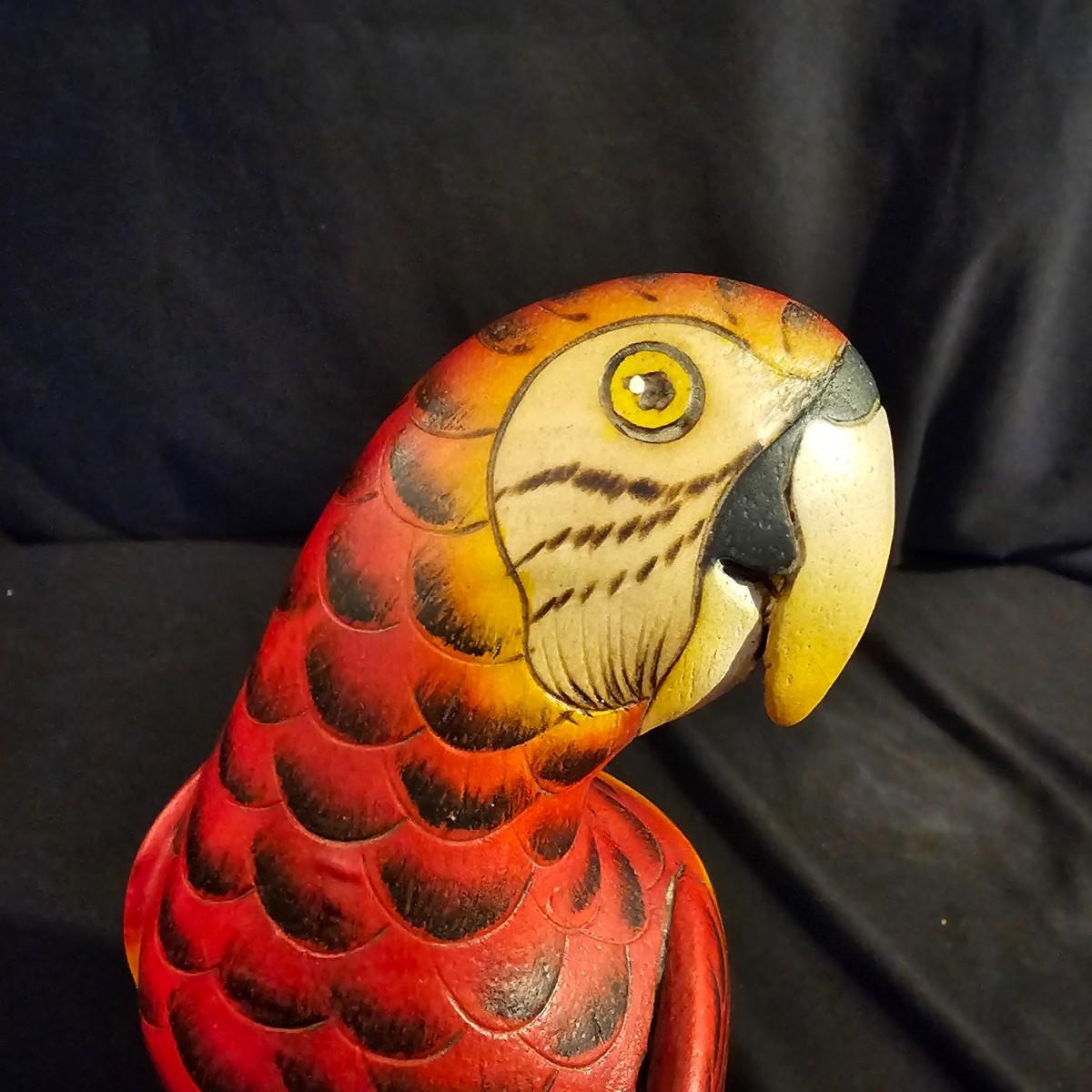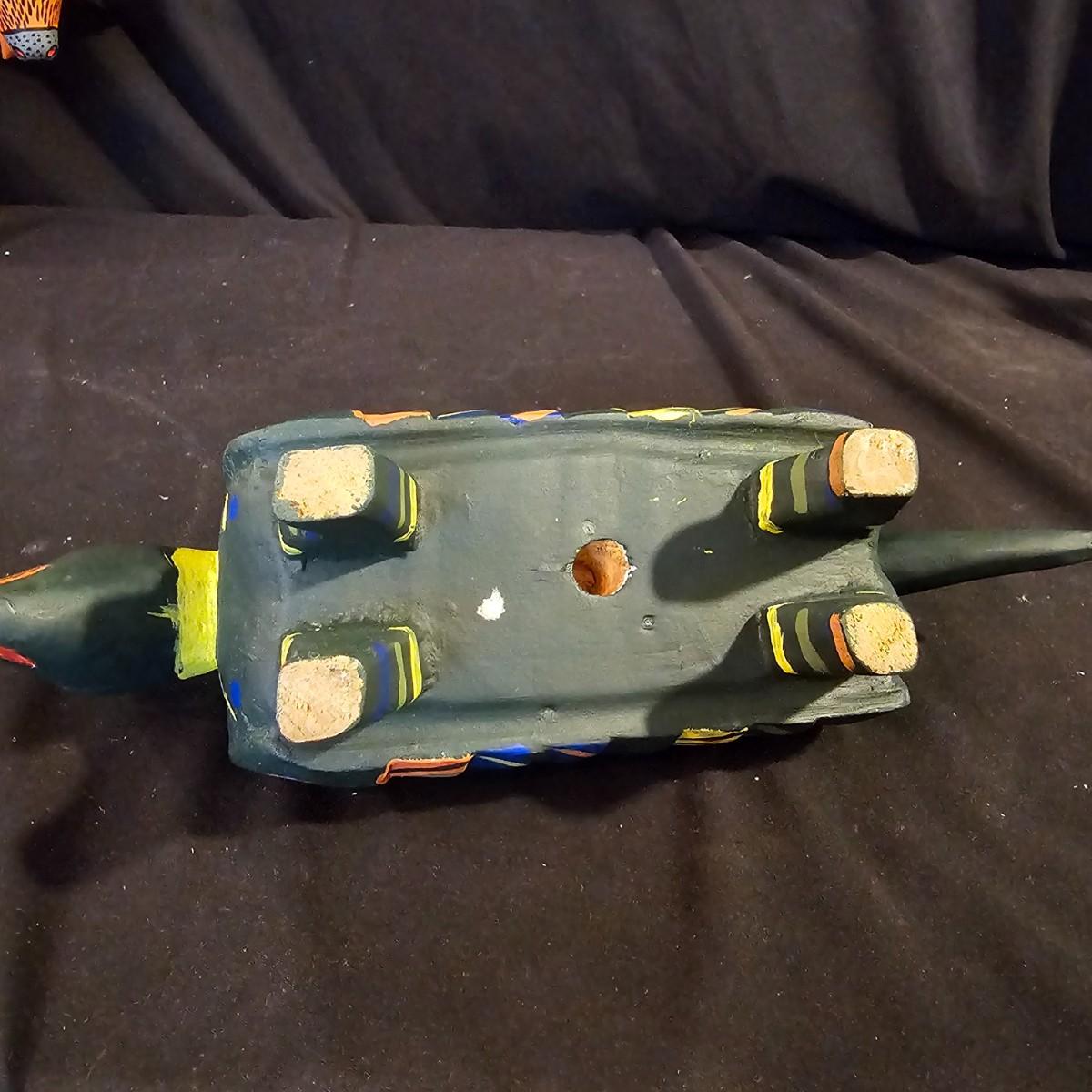Five unique wooden animal figures, all hand painted. Most are signed, see images. Friendly bull is 16" x 5" x 9" H, has small nick on back leg showing attachment point. Parrot is 6" x 4" x 11"H, appears to be hollow. Small turkey is 6.5" x 2.5" x 5"H. See photos for details. Shipping available.