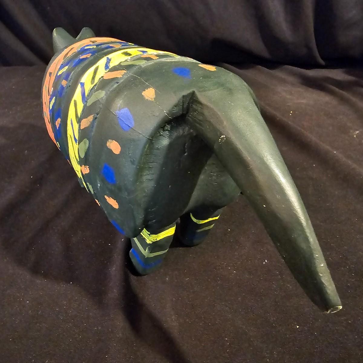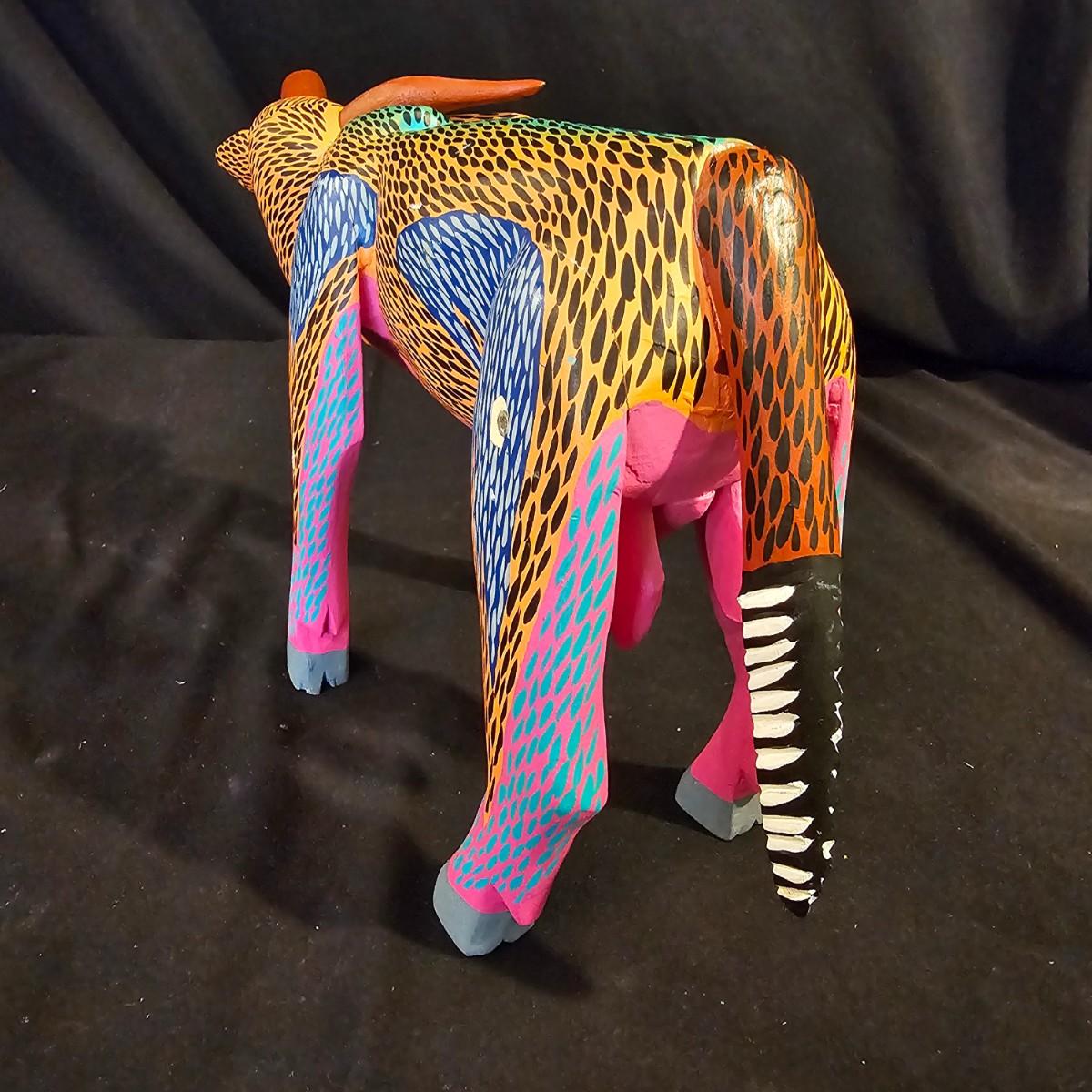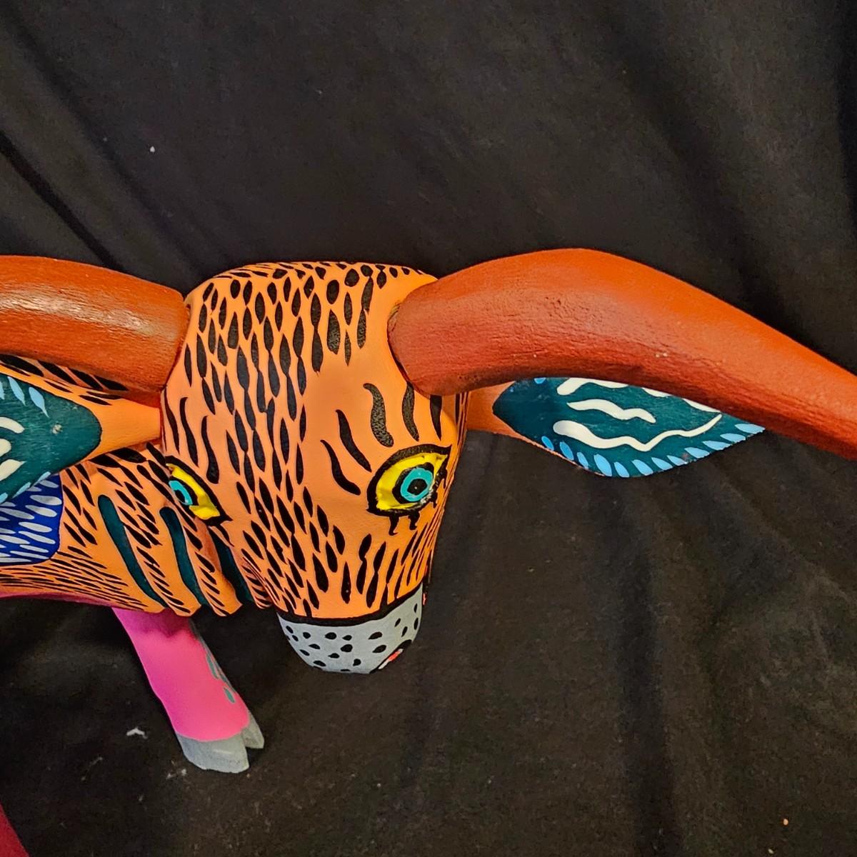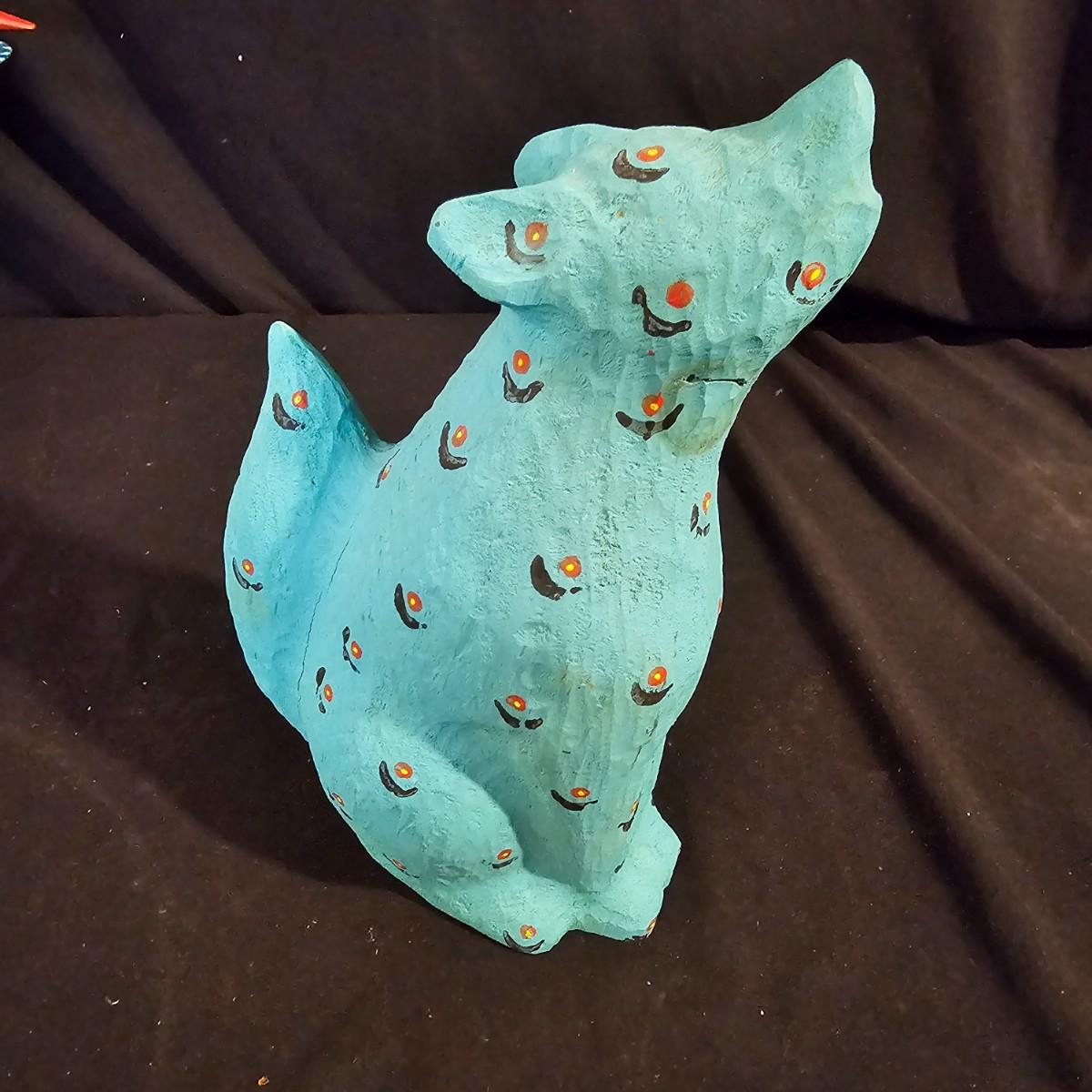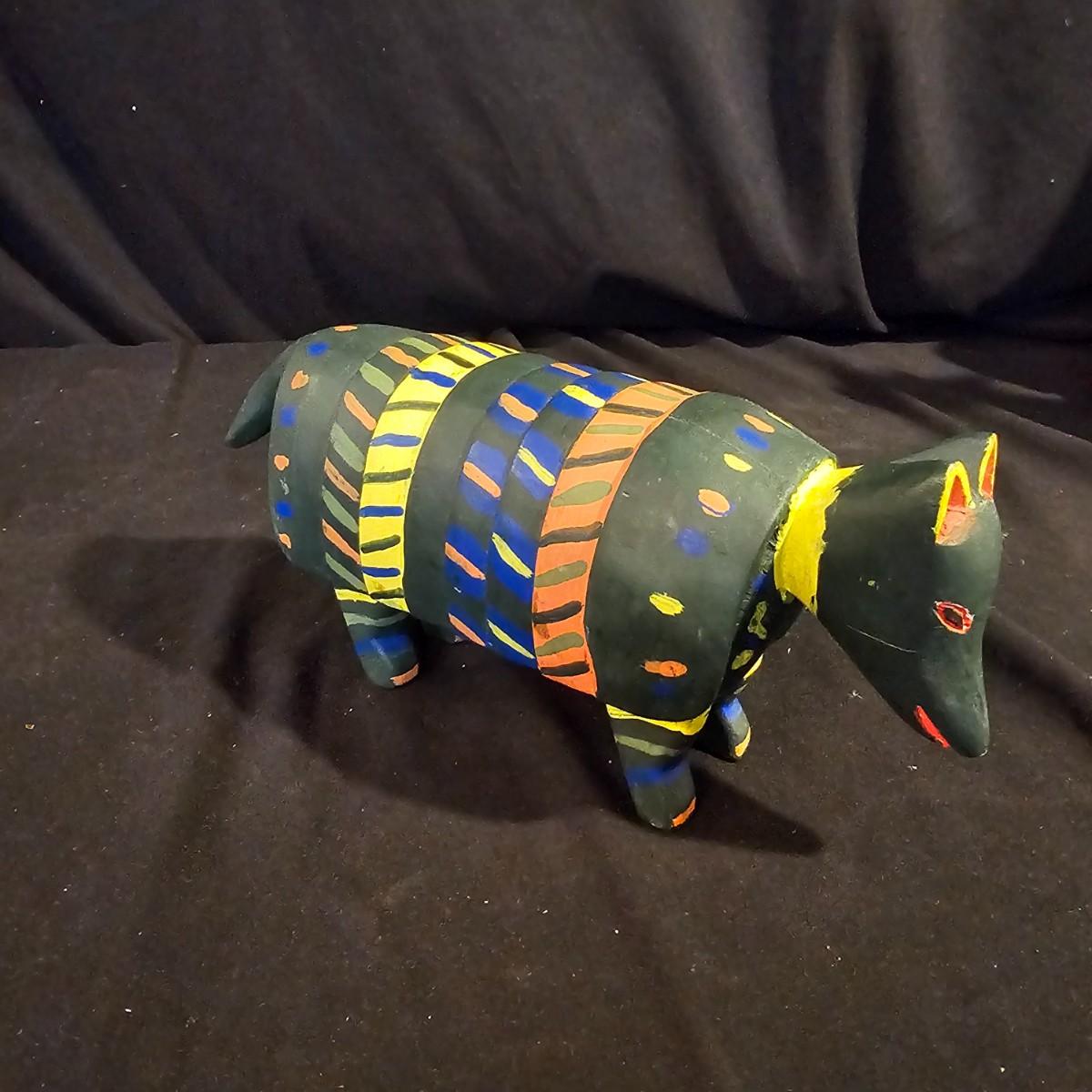 Five unique wooden animal figures, all hand painted. Most are signed, see images. Friendly bull is 16" x 5" x 9" H, has small nick on back leg showing attachment point. Parrot is 6" x 4" x 11"H, appears to be hollow. Small turkey is 6.5" x 2.5" x 5"H. See photos for details. Shipping available.