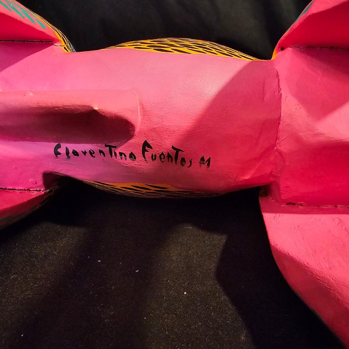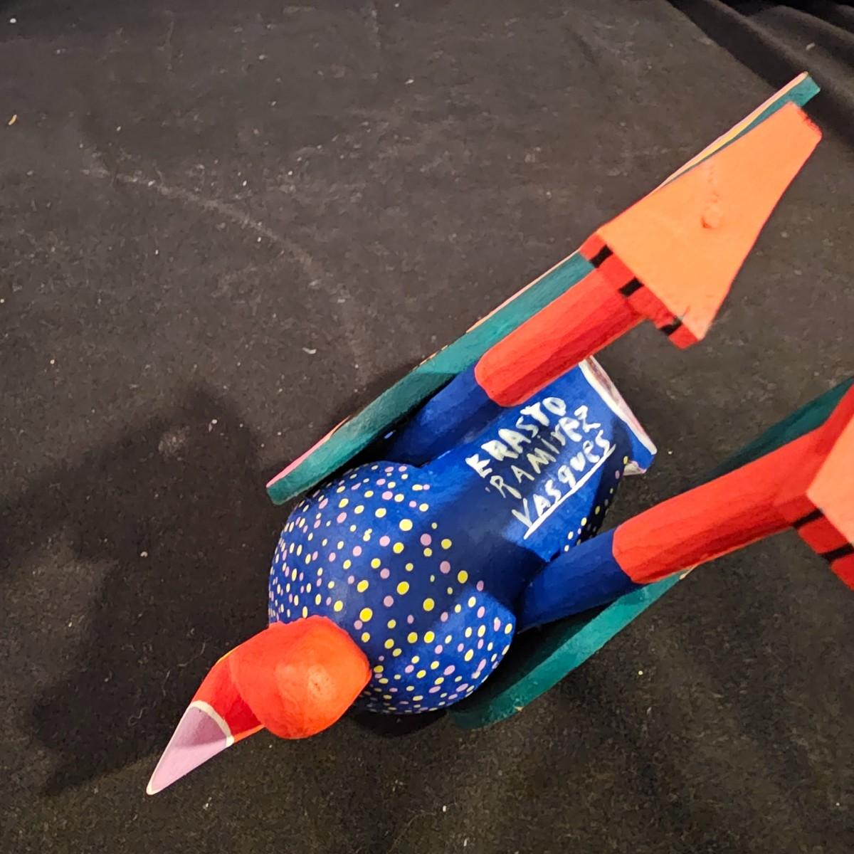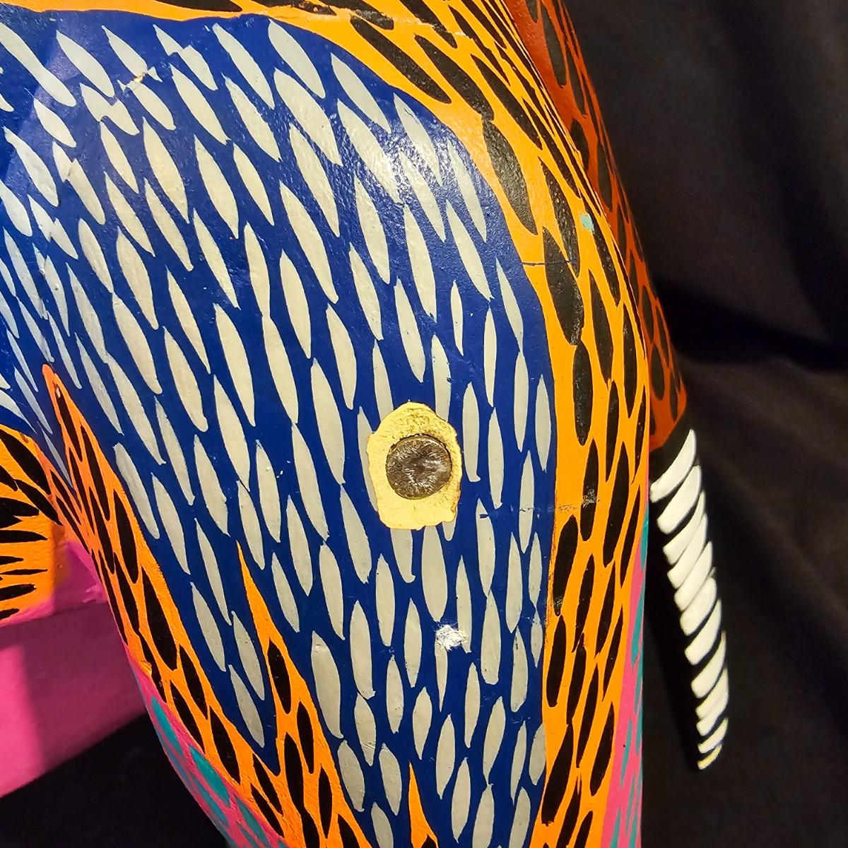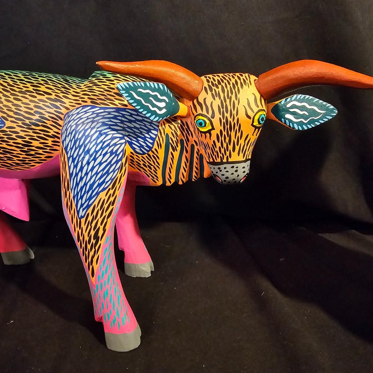 Five unique wooden animal figures, all hand painted. Most are signed, see images. Friendly bull is 16" x 5" x 9" H, has small nick on back leg showing attachment point. Parrot is 6" x 4" x 11"H, appears to be hollow. Small turkey is 6.5" x 2.5" x 5"H. See photos for details. Shipping available.