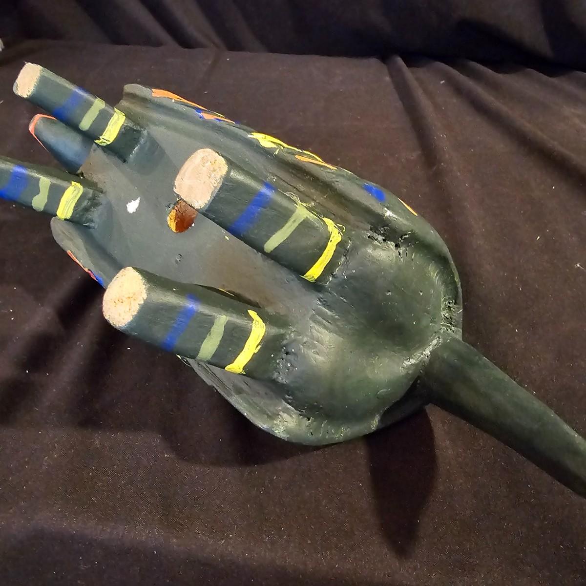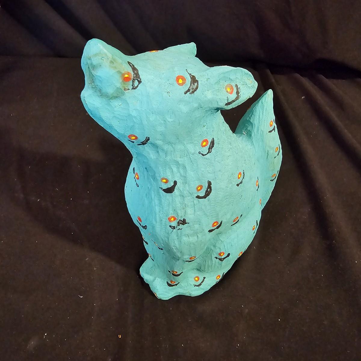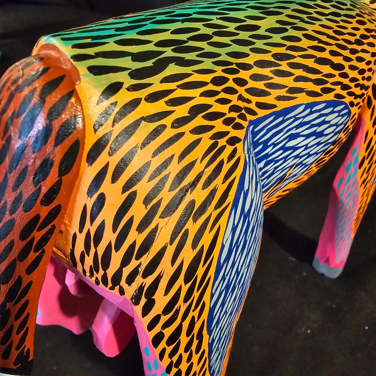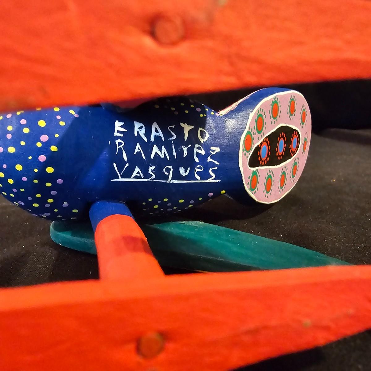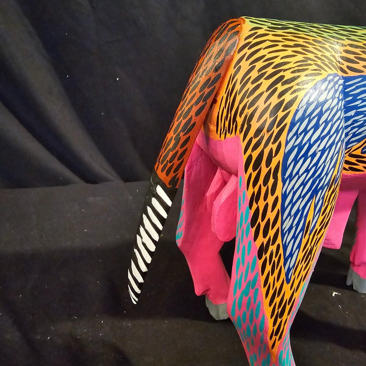 Five unique wooden animal figures, all hand painted. Most are signed, see images. Friendly bull is 16" x 5" x 9" H, has small nick on back leg showing attachment point. Parrot is 6" x 4" x 11"H, appears to be hollow. Small turkey is 6.5" x 2.5" x 5"H. See photos for details. Shipping available.