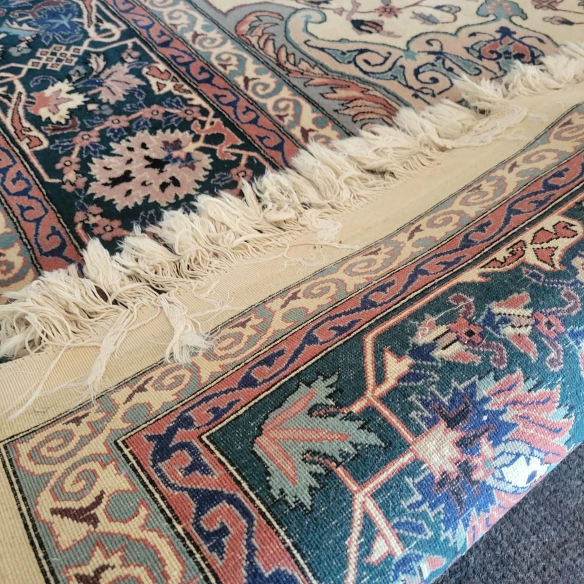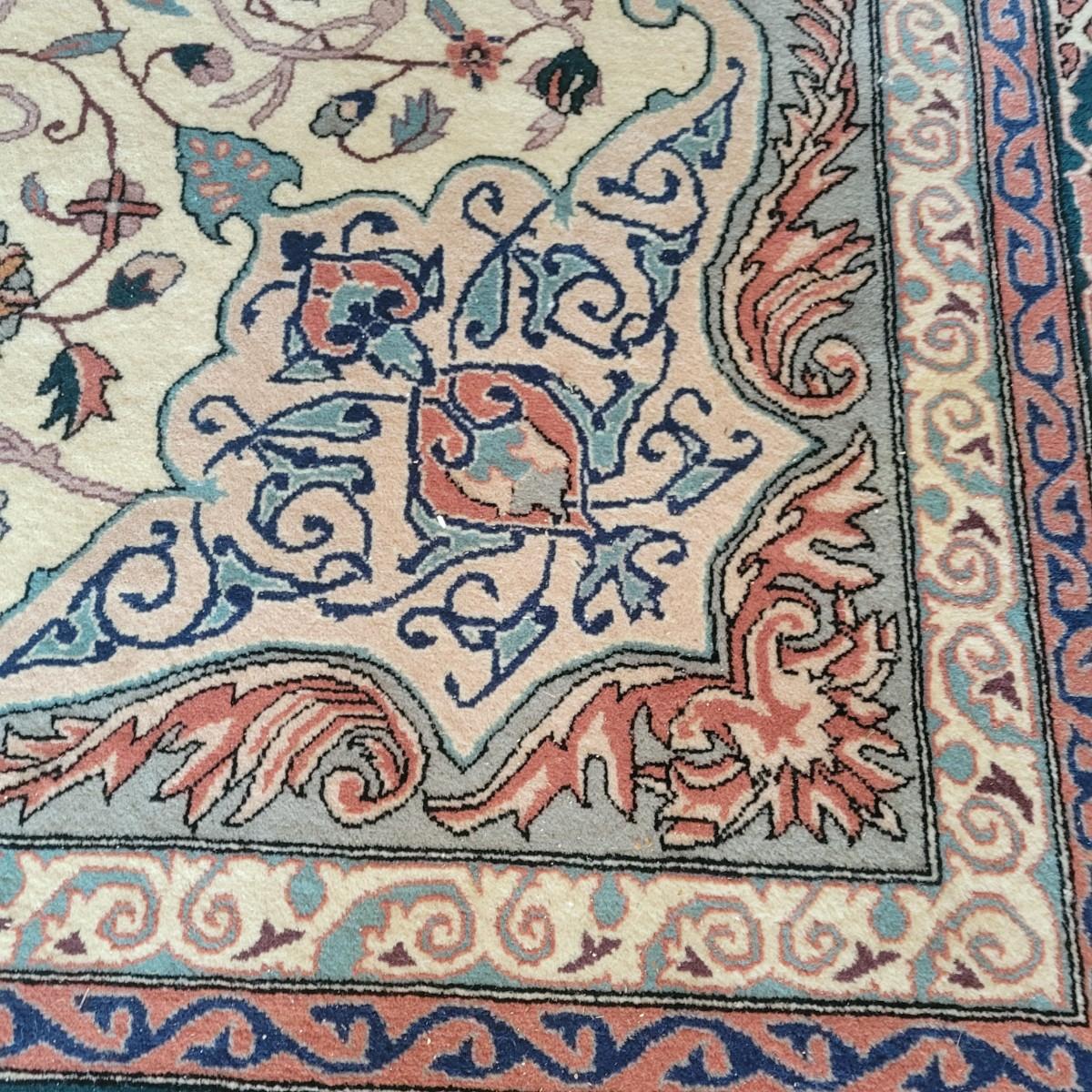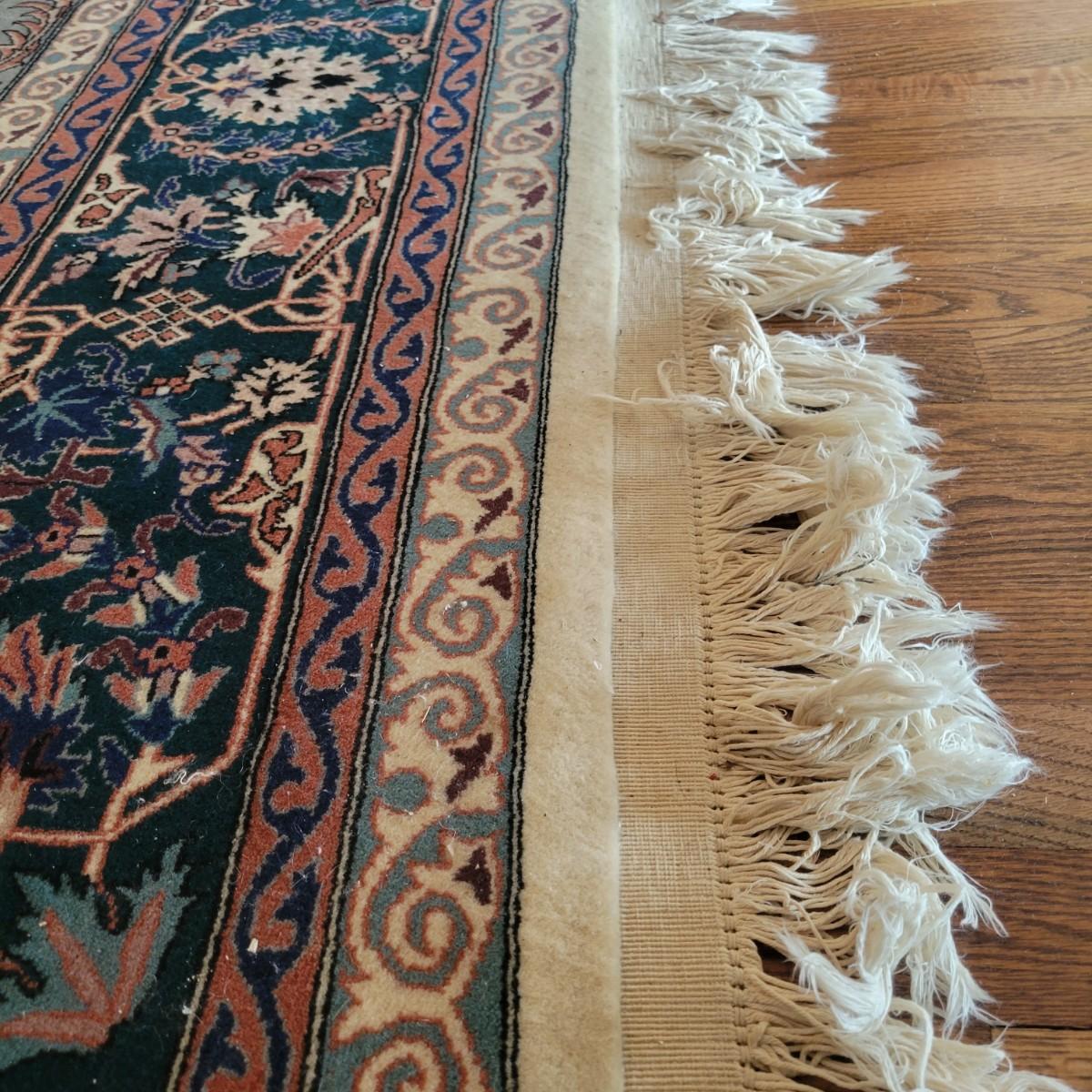 A large wool area rug in good condition with some minor staining on the tassels. This rug features vibrant hues of green, burgundy, orange and cream in a floral motif. It measures approximately 155" x 110". Local pickup only. Winning bidder will need to bring assistance to move due to weight and bulkiness.