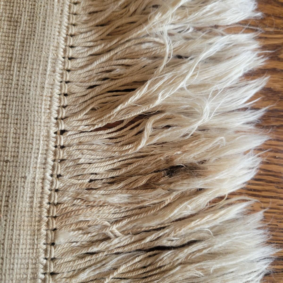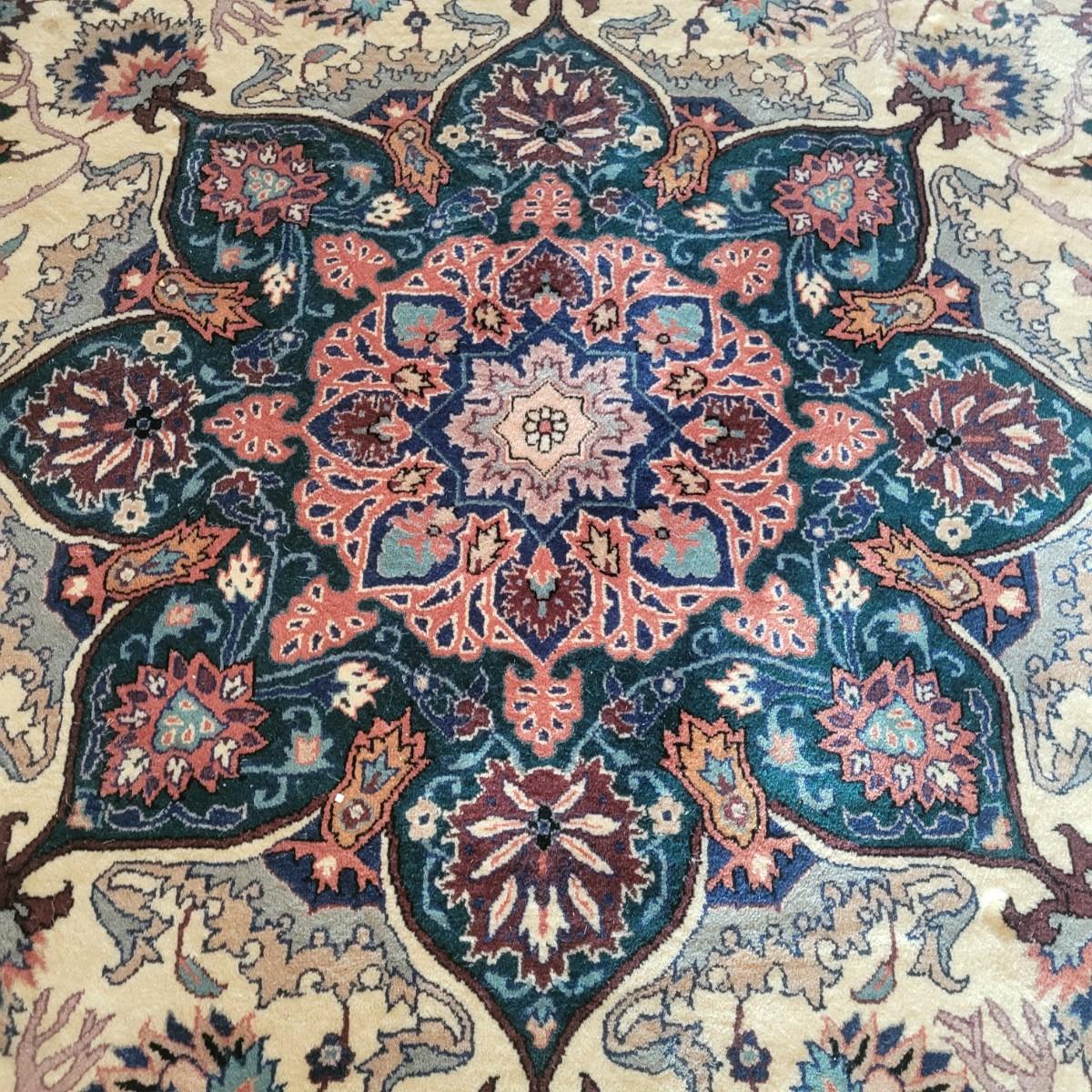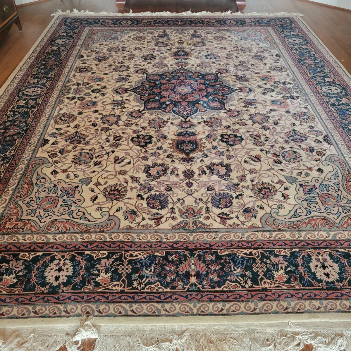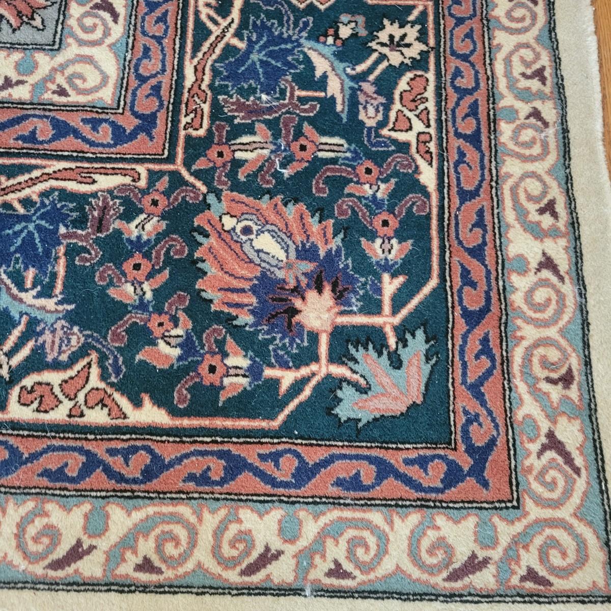 A large wool area rug in good condition with some minor staining on the tassels. This rug features vibrant hues of green, burgundy, orange and cream in a floral motif. It measures approximately 155" x 110". Local pickup only. Winning bidder will need to bring assistance to move due to weight and bulkiness.
