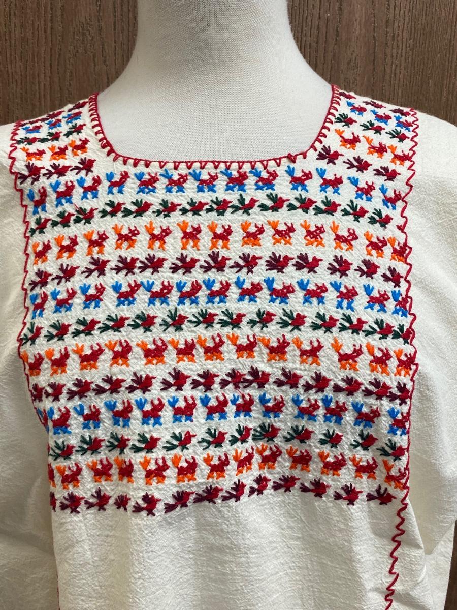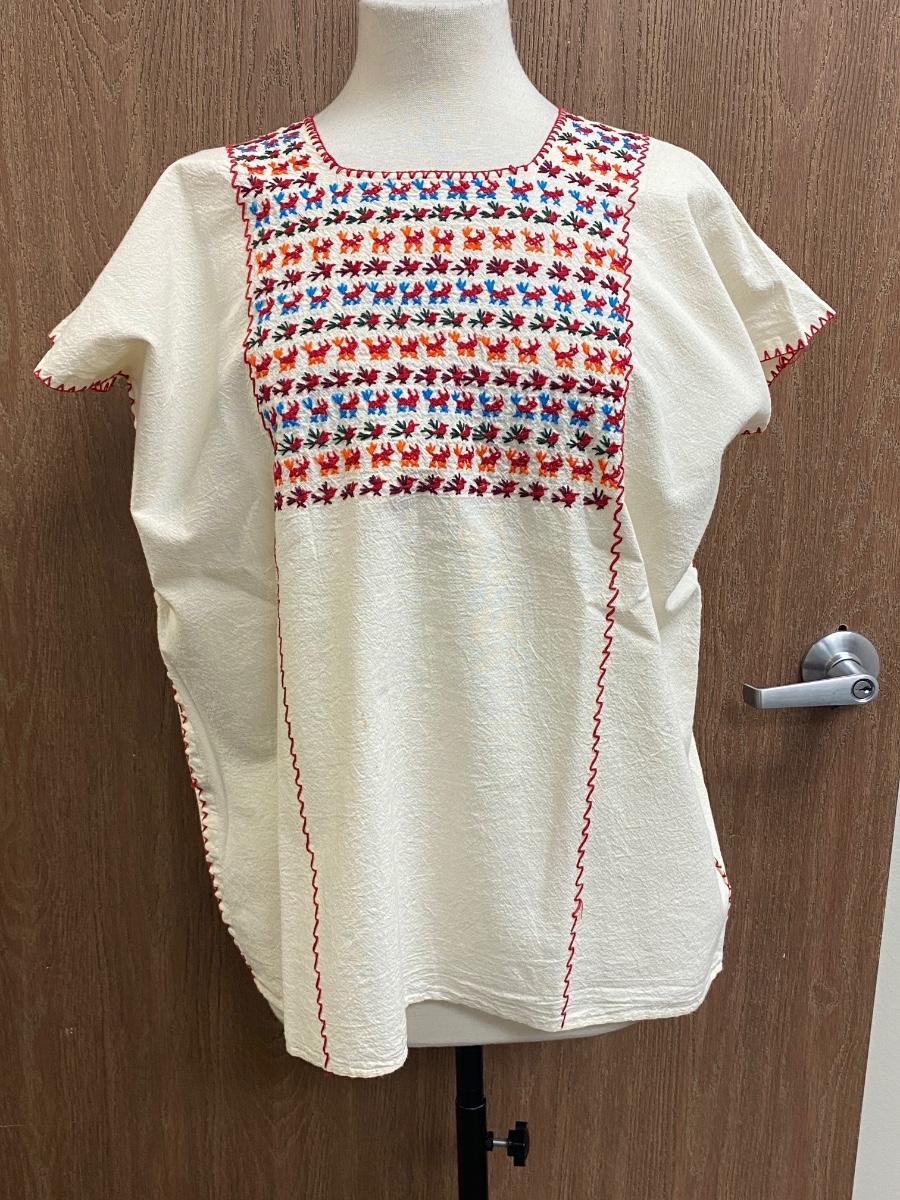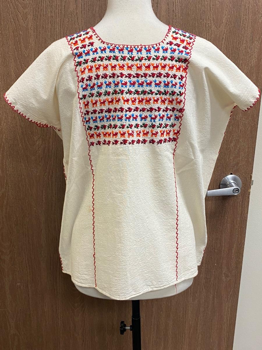 Colorfully embroidered ethnic tunic blouse. Mexican embroidered blouse works great as a cover up as well. There may be light spots and discolor, no holes. Front and back are identical patterns. No tags. Would probably fit as a medium nicely.