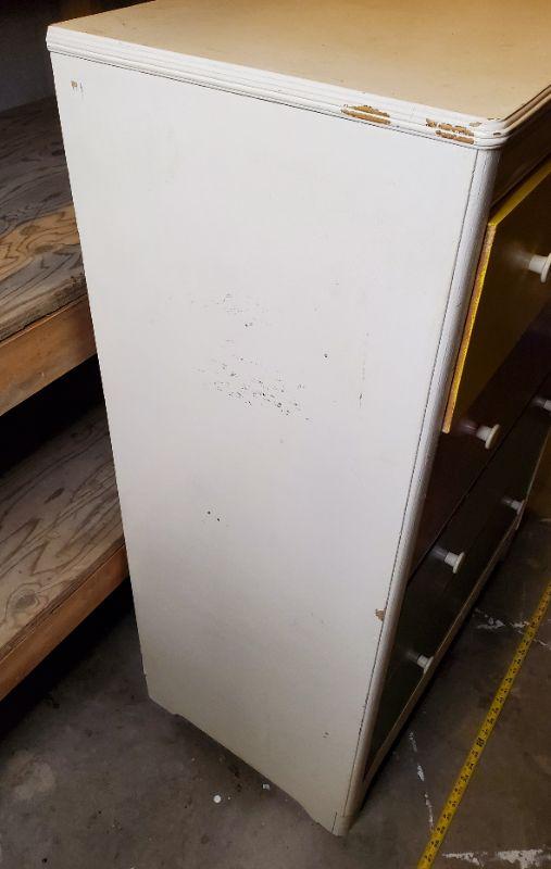 Does show signs of use, could still be used as is or repurposed! Good overall solid condition with dovetail detail on the drawers!