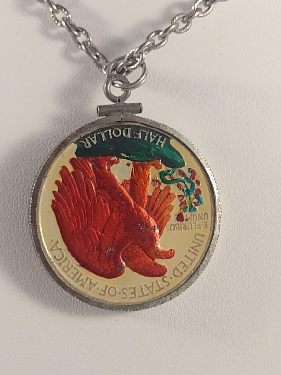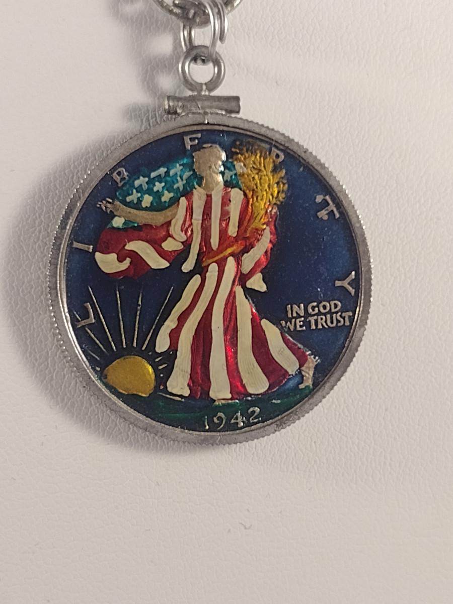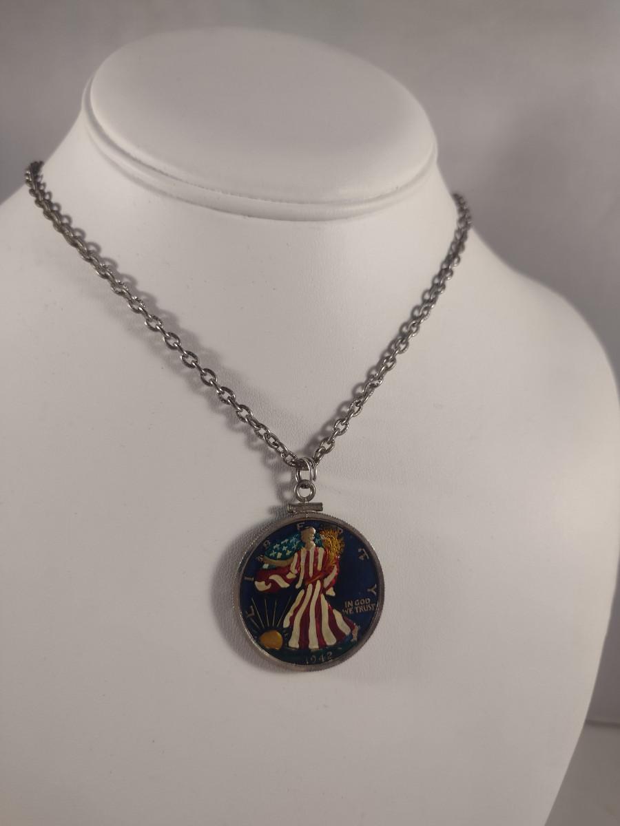 Colorized 1942 Walking Liberty Half Dollar Coin Pendant- Sterling Silver (#7). Item has chain for wearing- approx 24", but it is not marked Sterling.