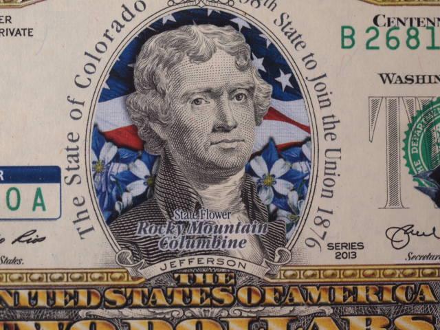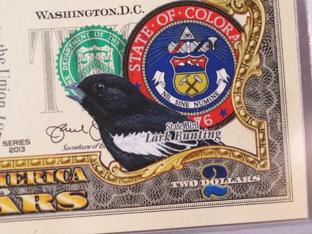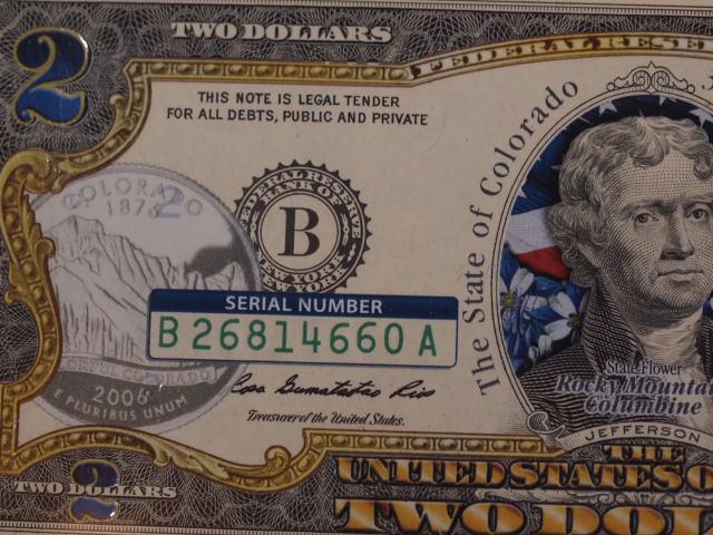 Colorized Series 2013 State of Colorado $2 dollar Federal Reserve Note Celebrating the 2006 State Silver Dollar and THE State Flower The Rocky Mountain Columbine. Admitted to the union in 1876 as the 38th State the State Fish is the Golden Trout