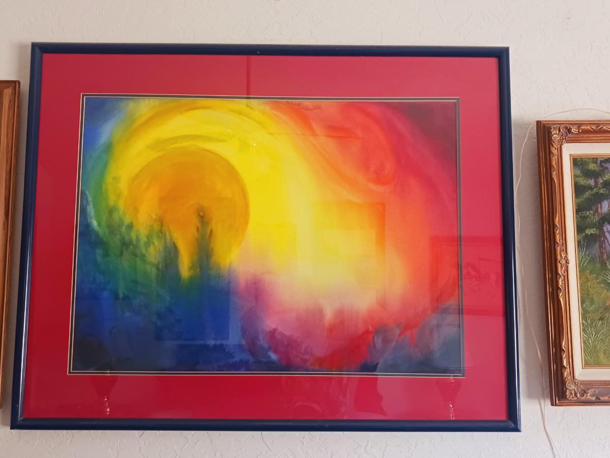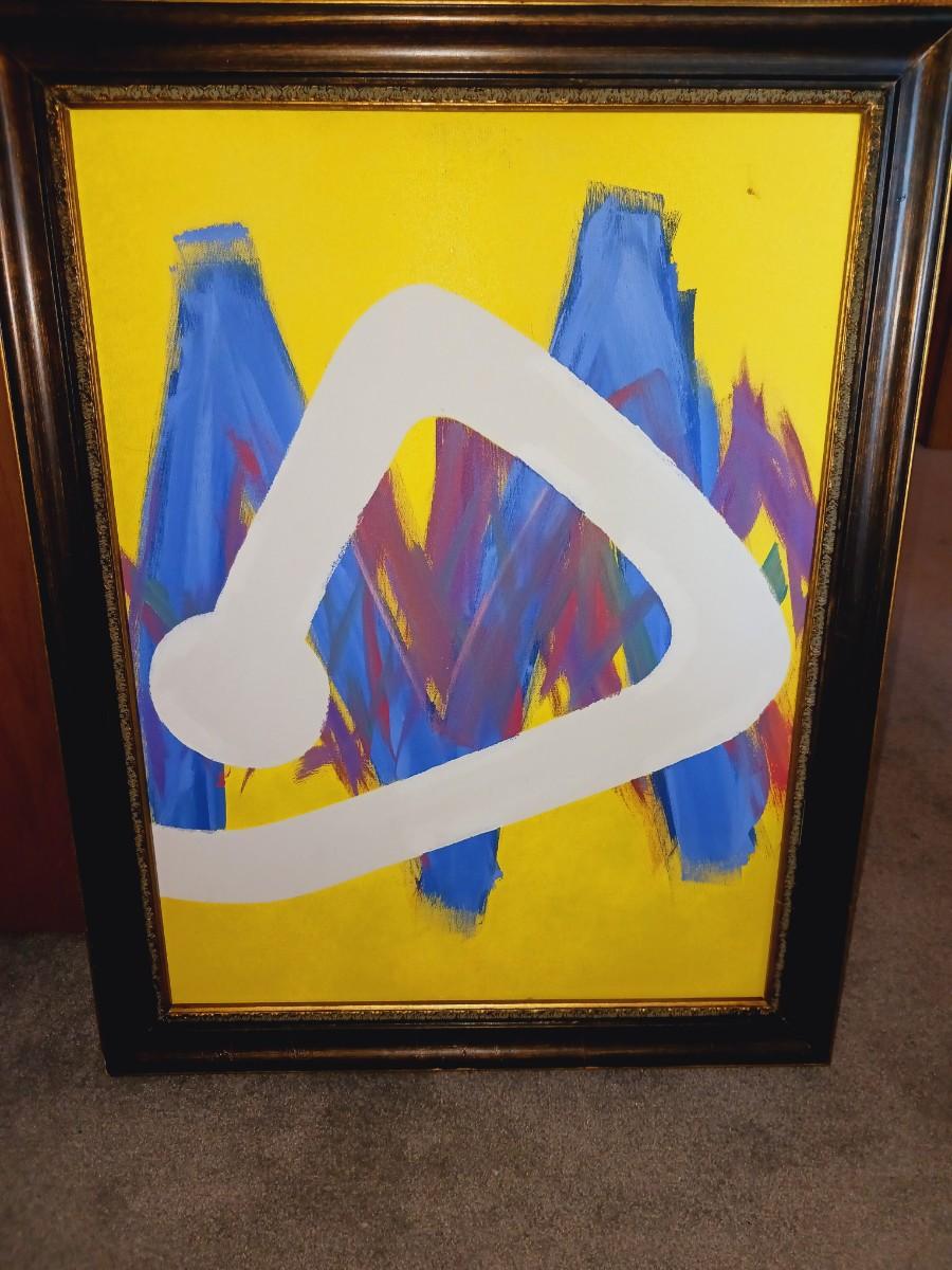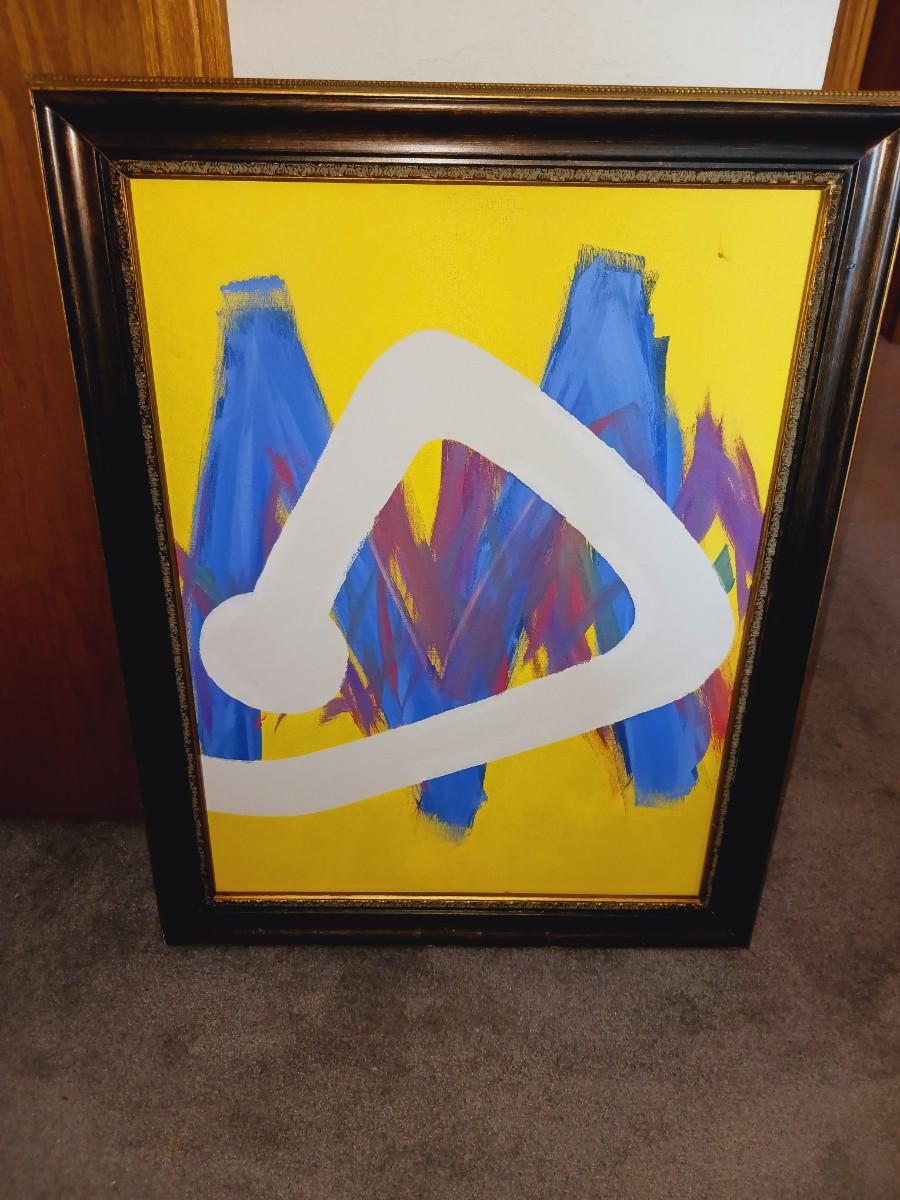 COLORFUL FRAMED PICTURE AND AN ABSTRACT OIL ON CANVAS