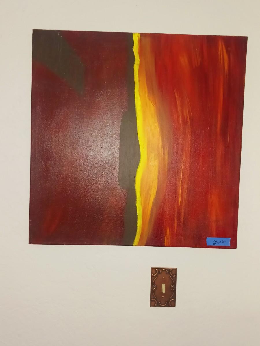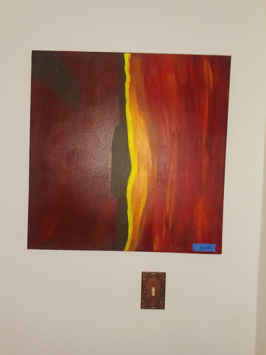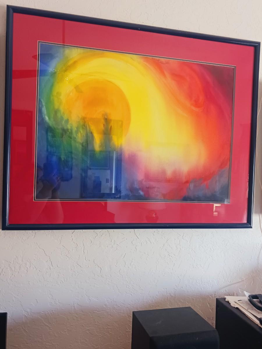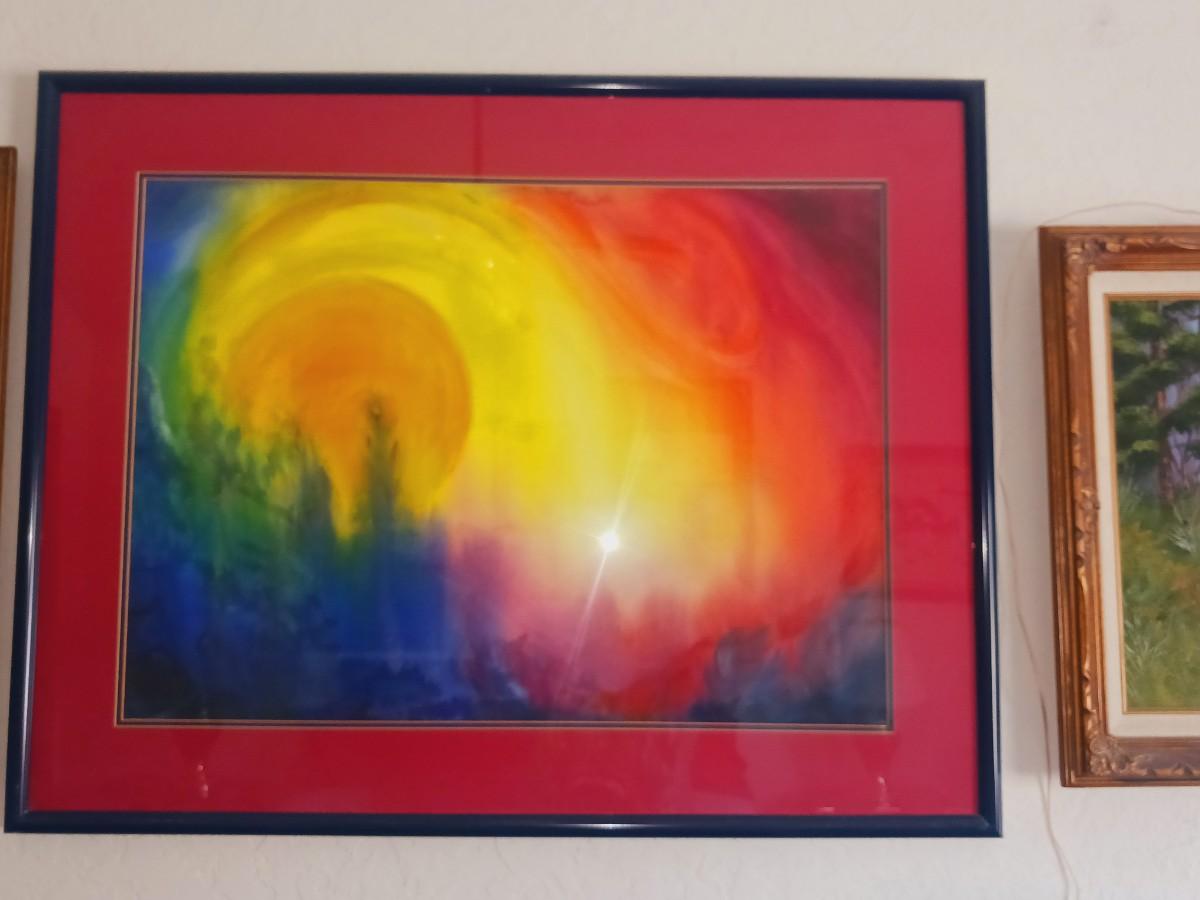 COLORFUL FRAMED PICTURE AND AN ABSTRACT OIL ON CANVAS