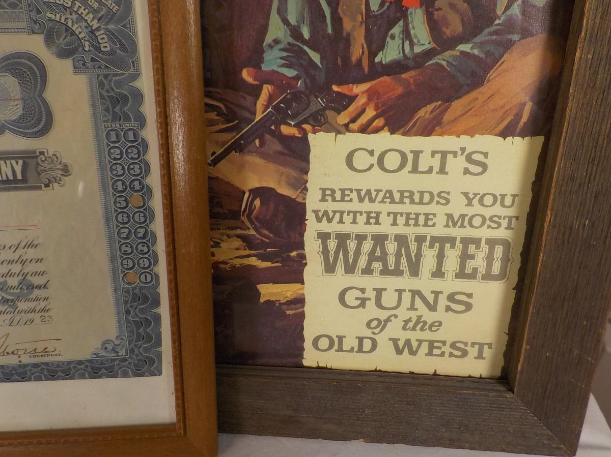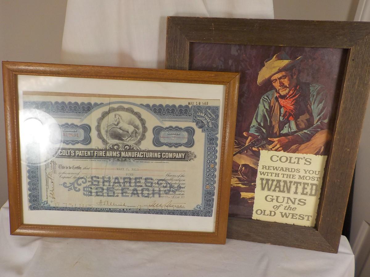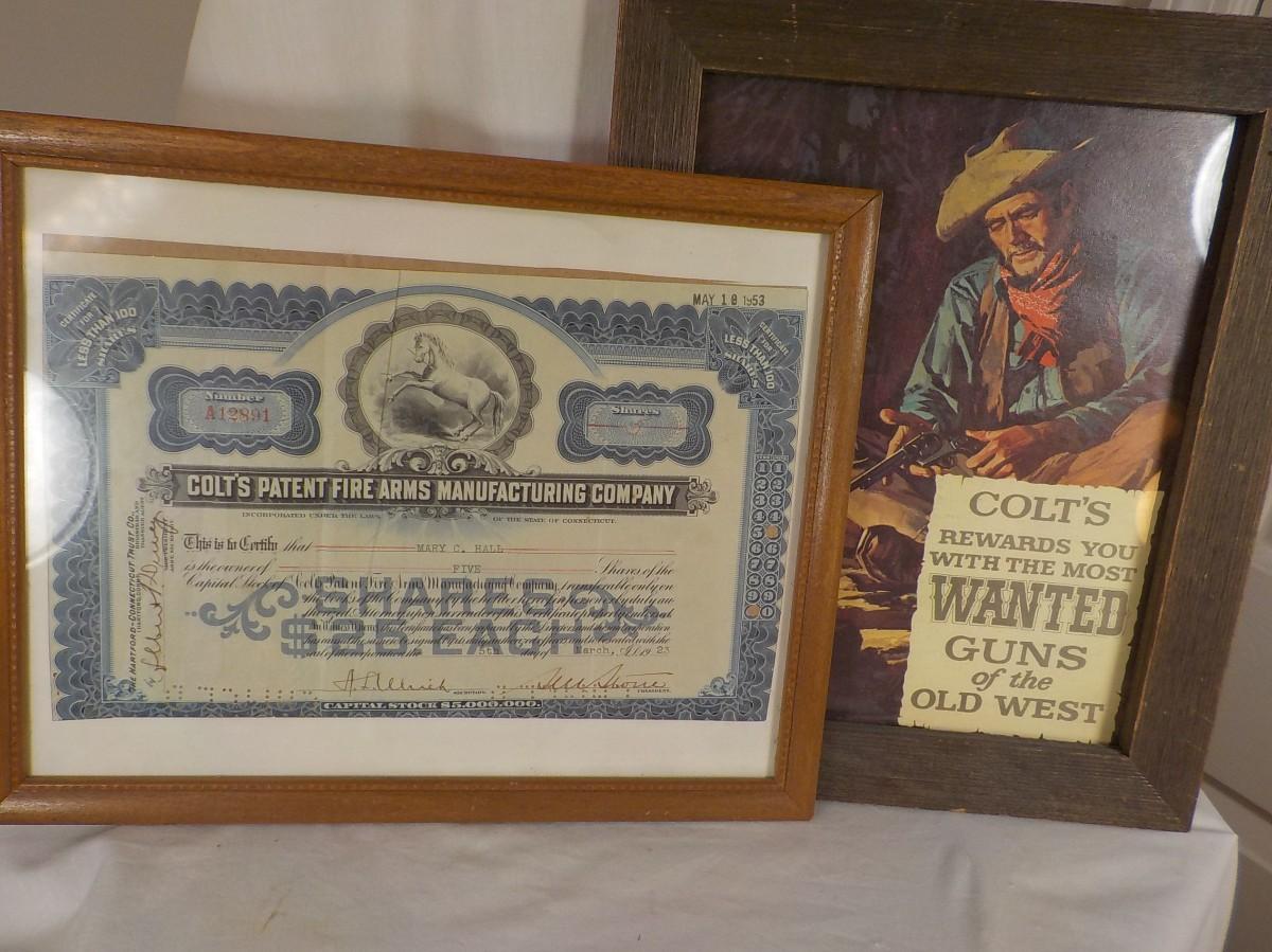 " Colt's Gun Mfg. Co. Stock Certifcate (canceled) and Colt ad. est. $30 to $70.