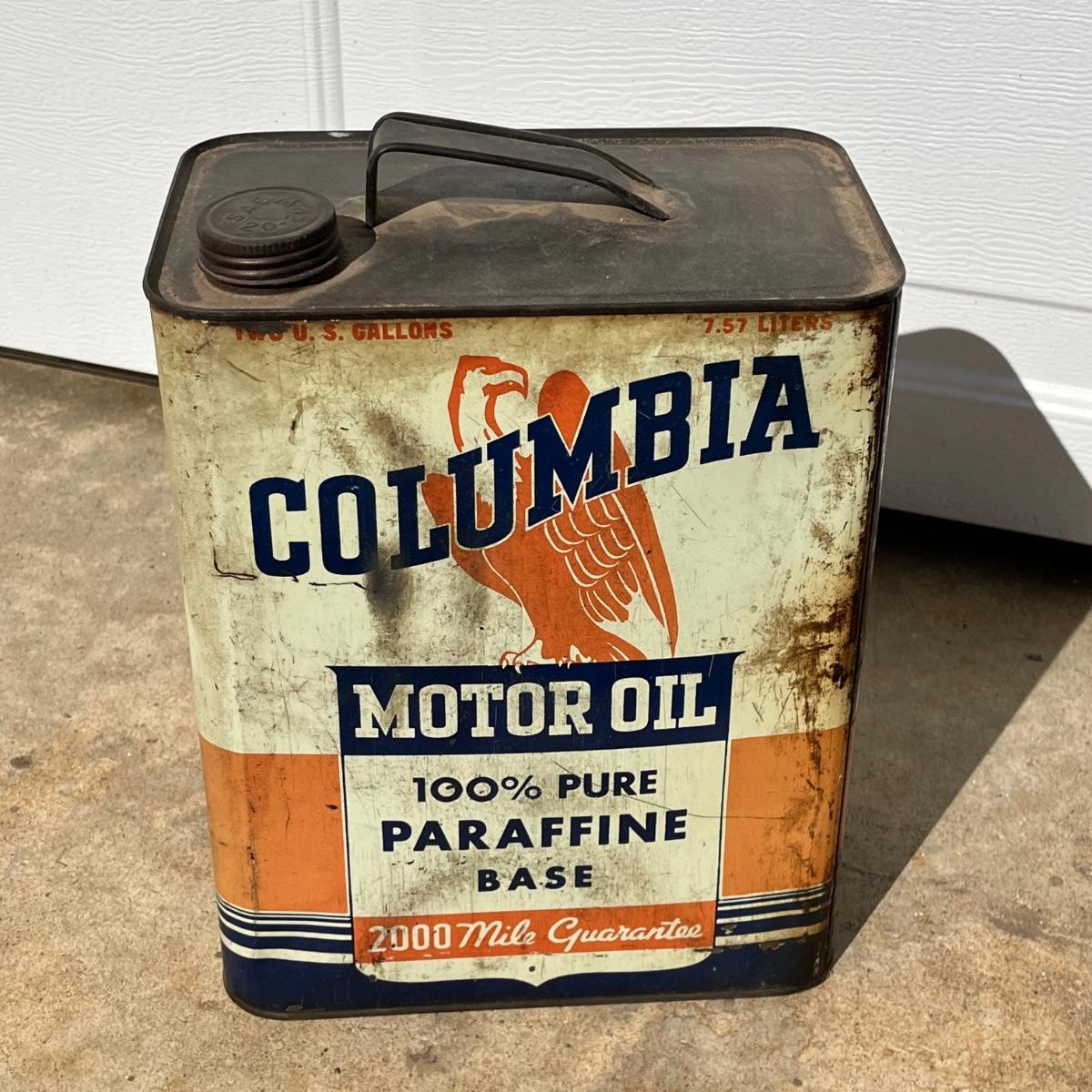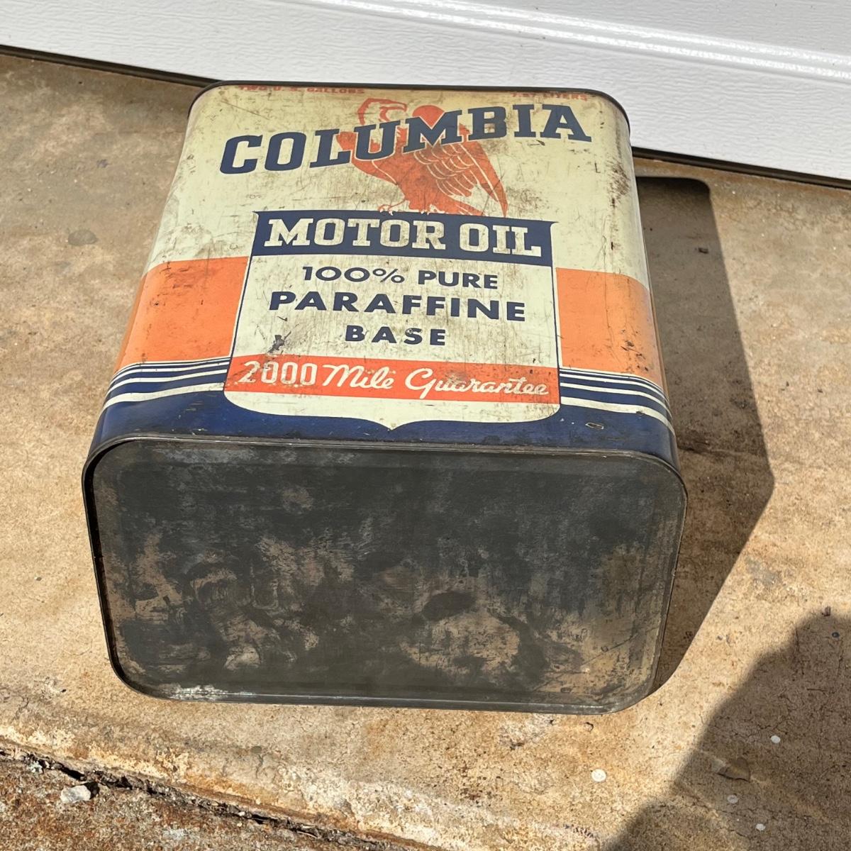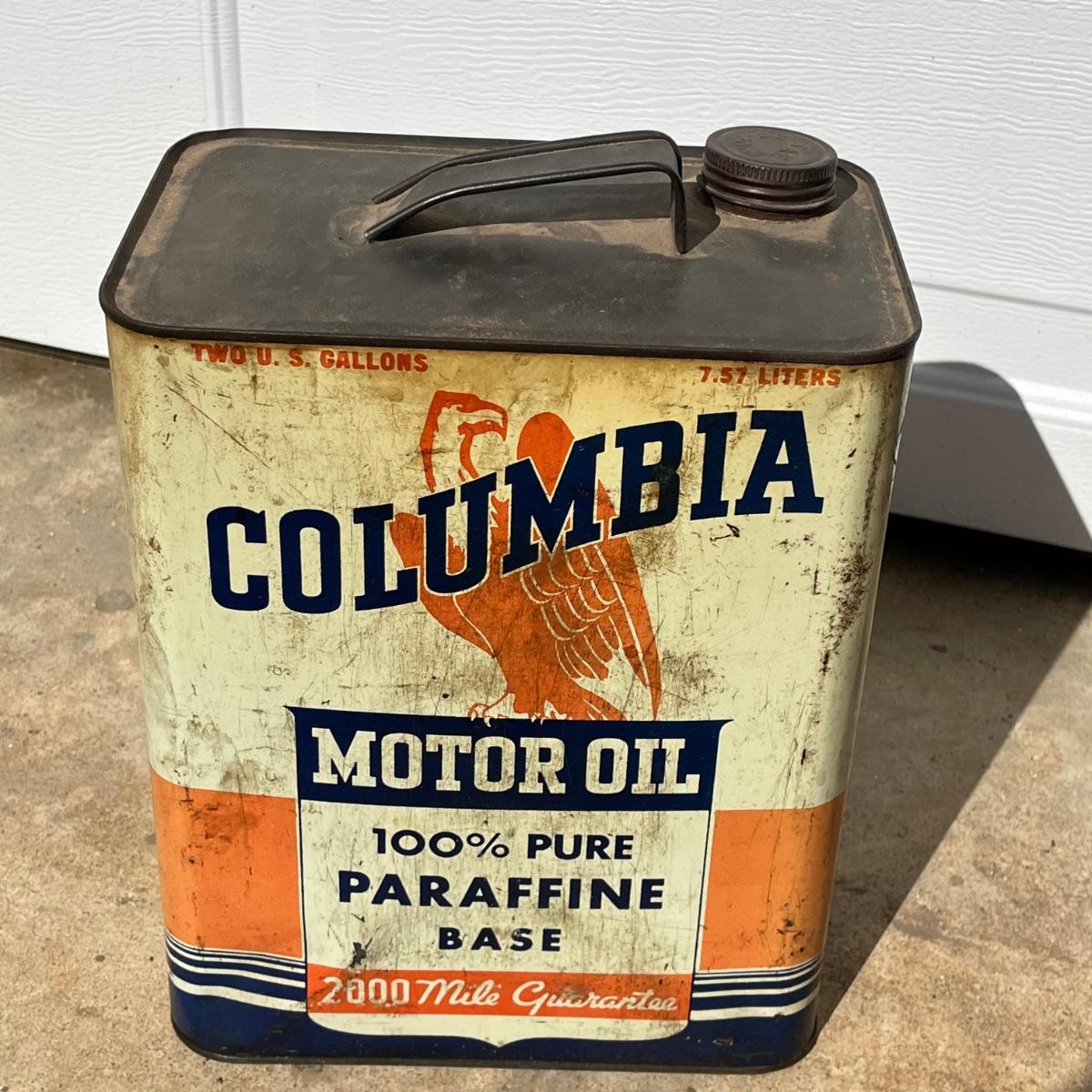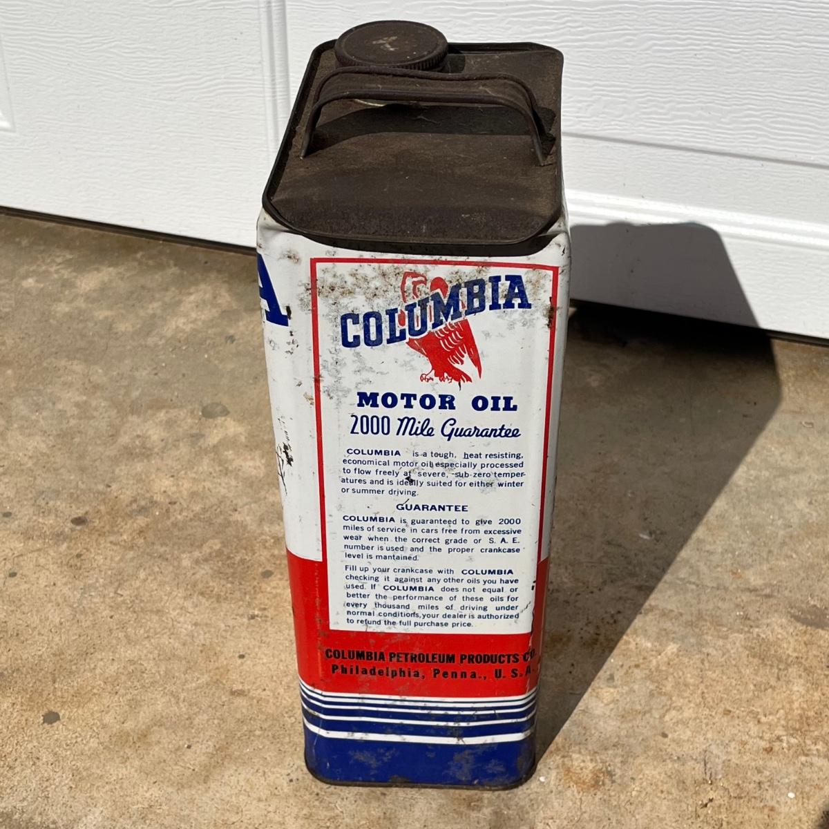 Lot includes a Columbia motor oil two gallon and a five quart oil can. Both cans have dents and scratches.