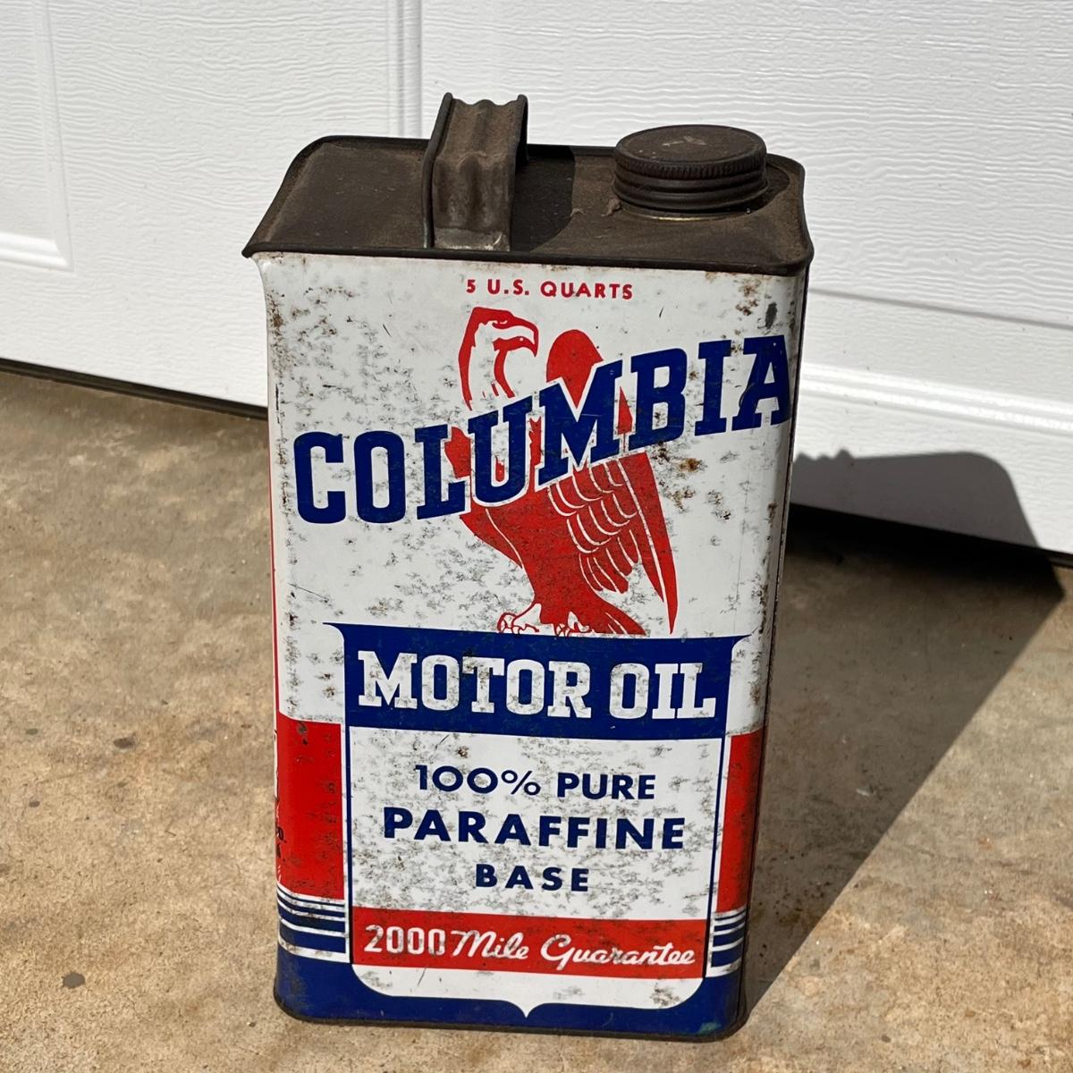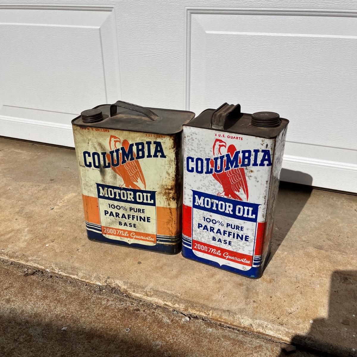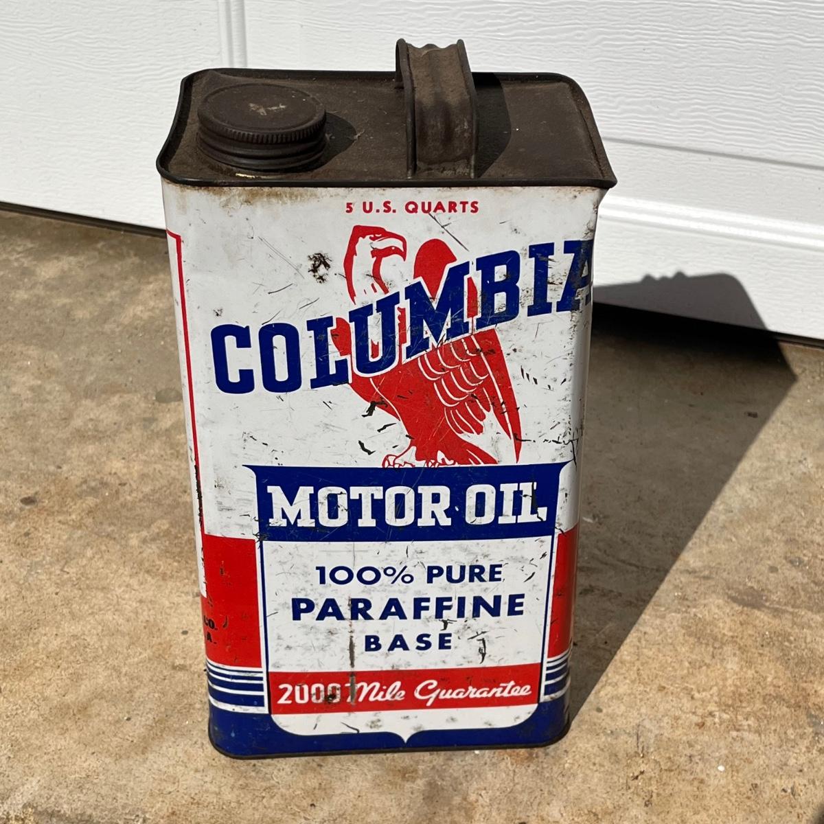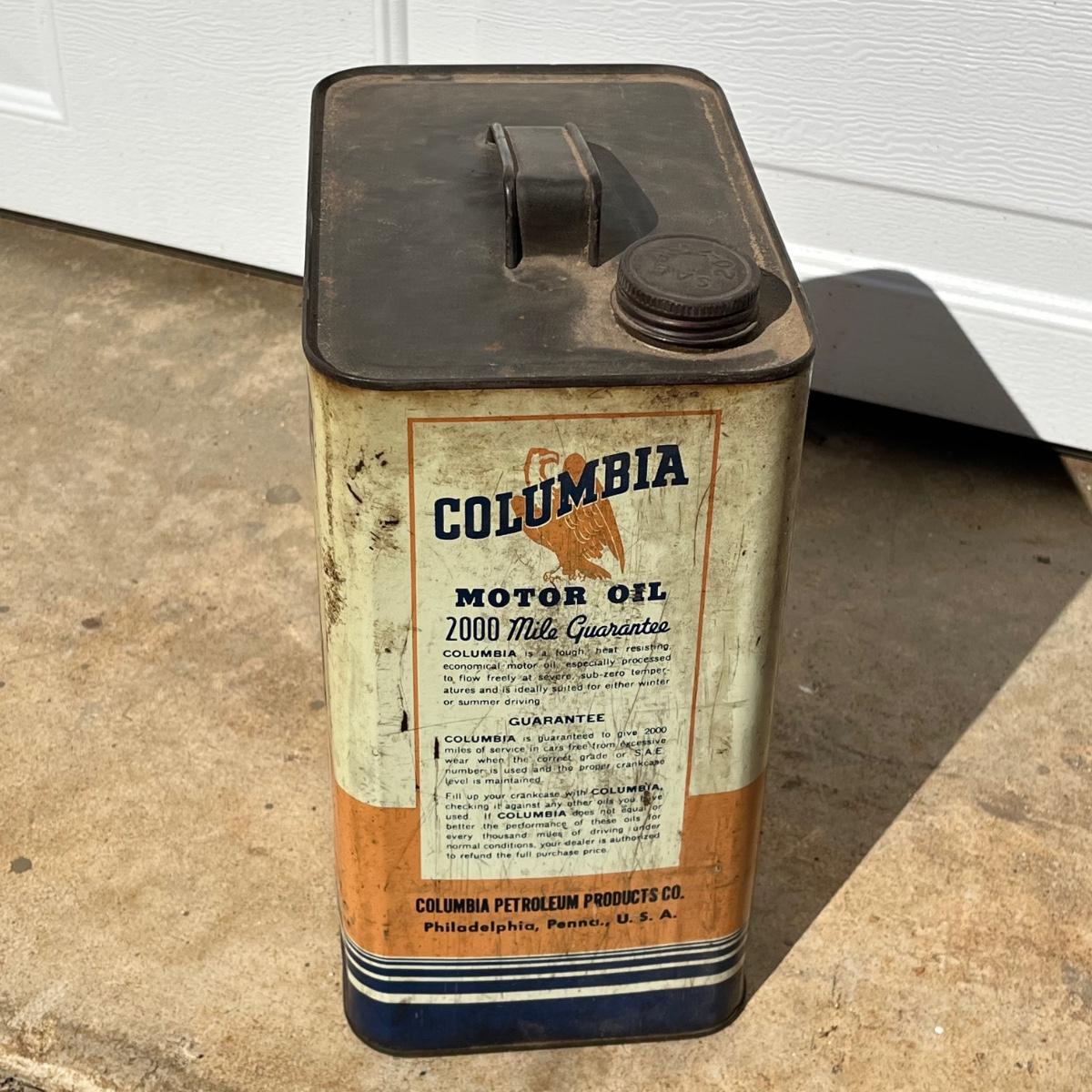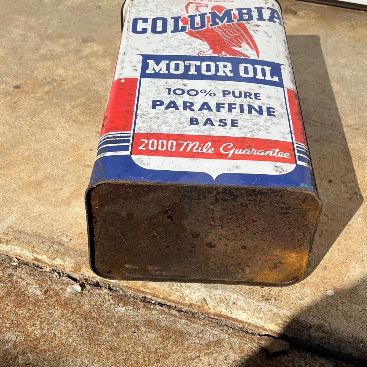 Lot includes a Columbia motor oil two gallon and a five quart oil can. Both cans have dents and scratches.
