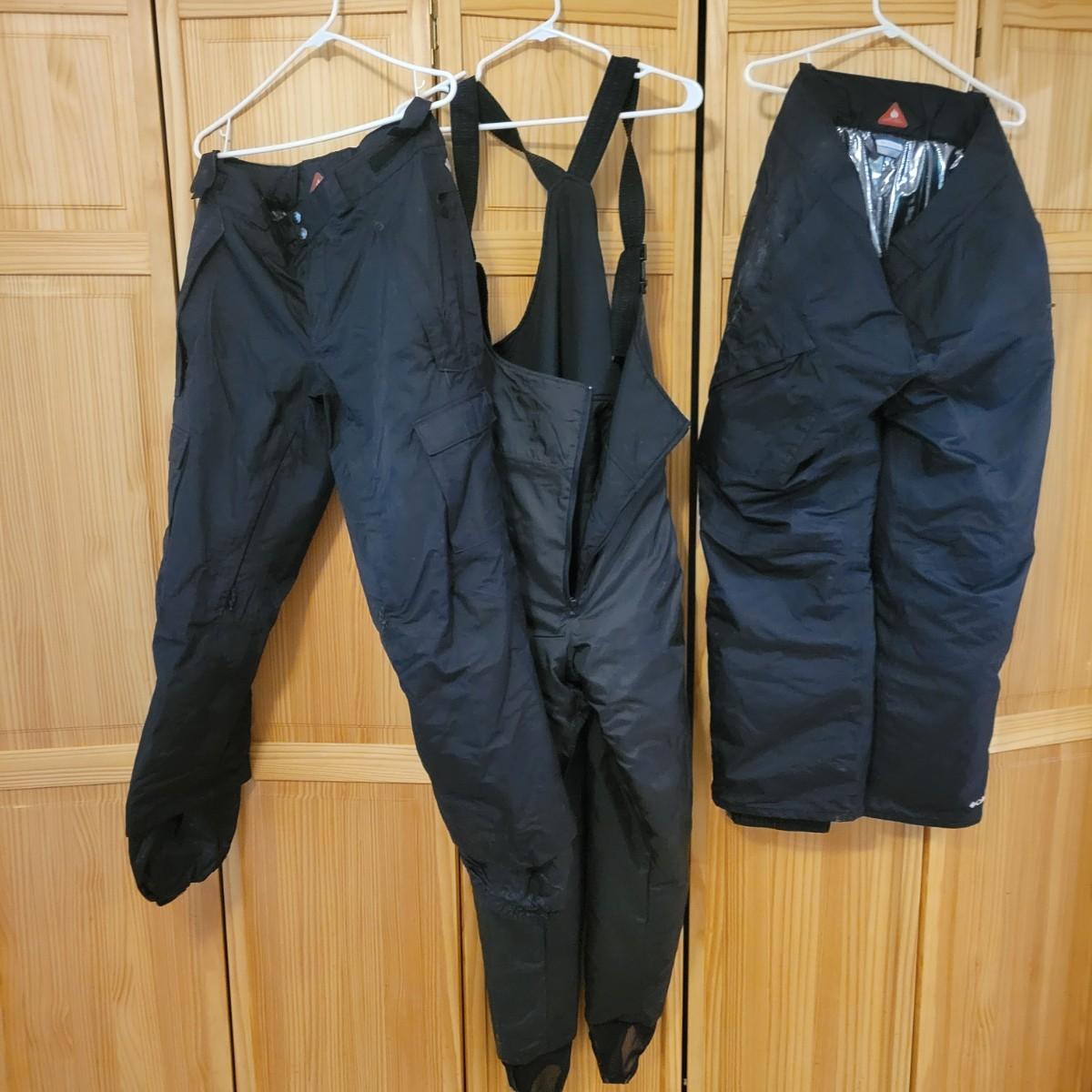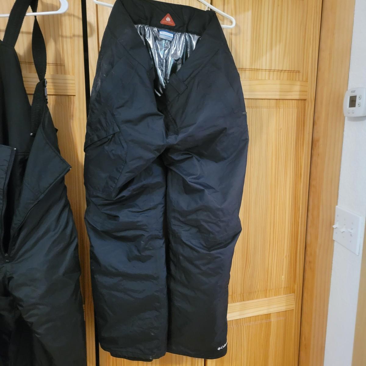Two pairs of Columbia ski pants that have the reflective omniheat liner. One pair is a size M and the other is a XL. This lot also includes a Black Bear ski bin that doesn't have a size tag, but appears to be a size M. Shipping available