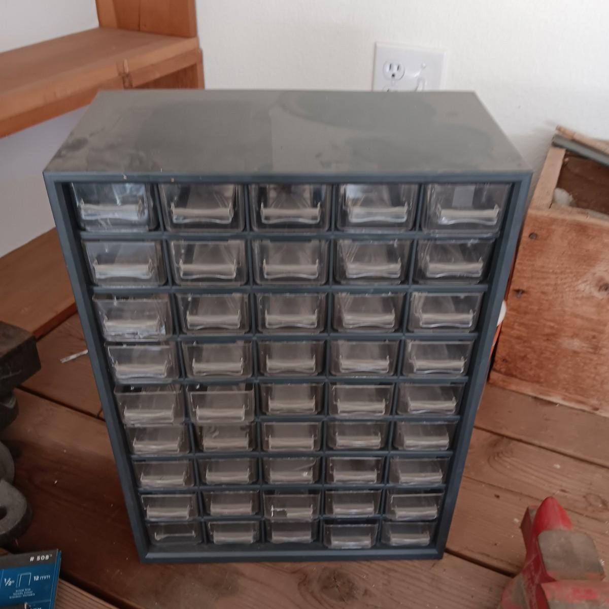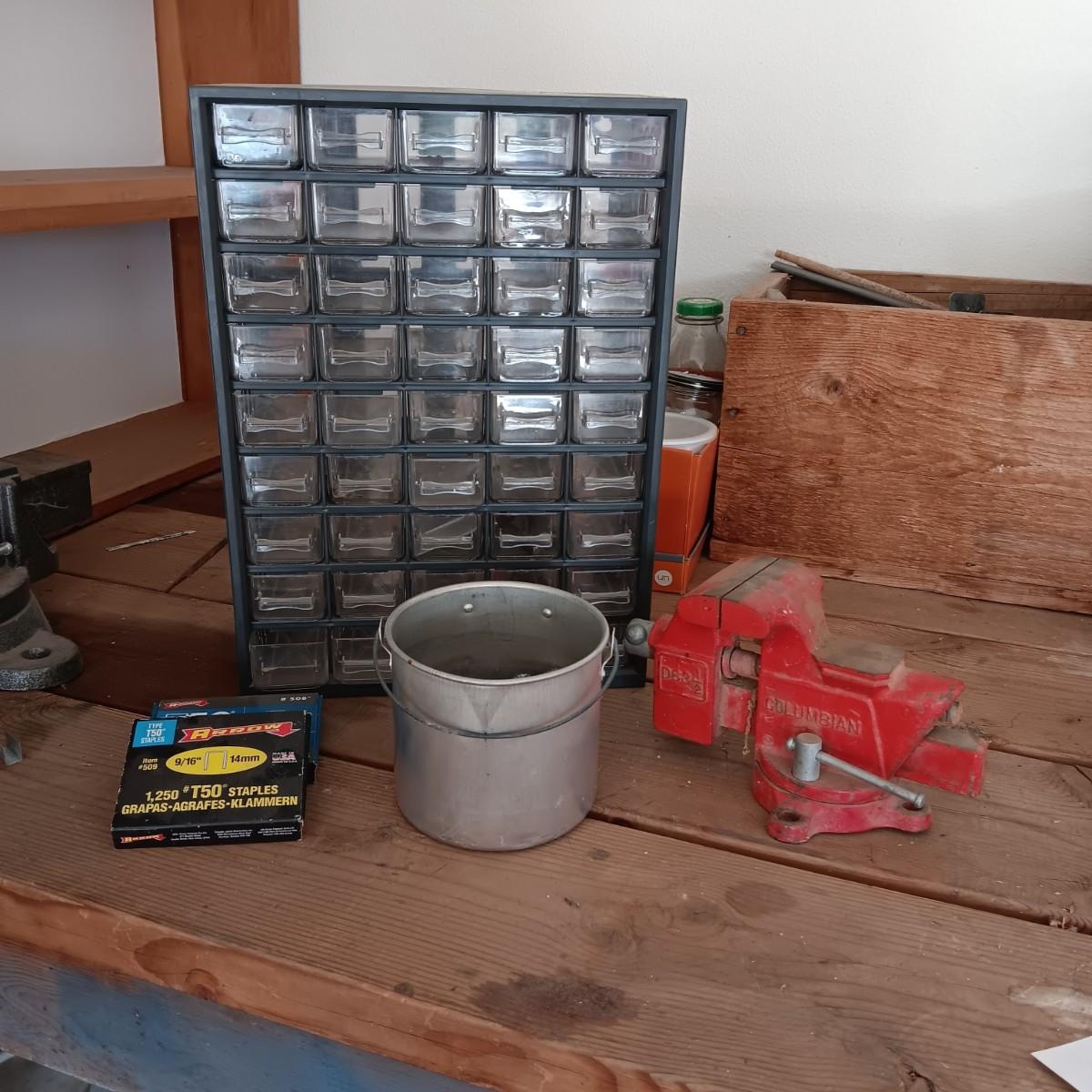 COLUMBIAN D63 1/2 SWIVEL BENCH VISE, DRAWER ORGANIZER AND SOME HARDWARE