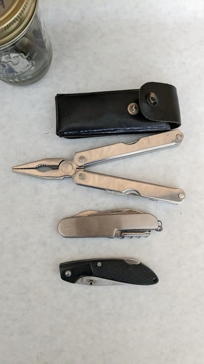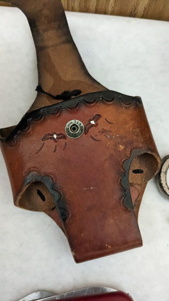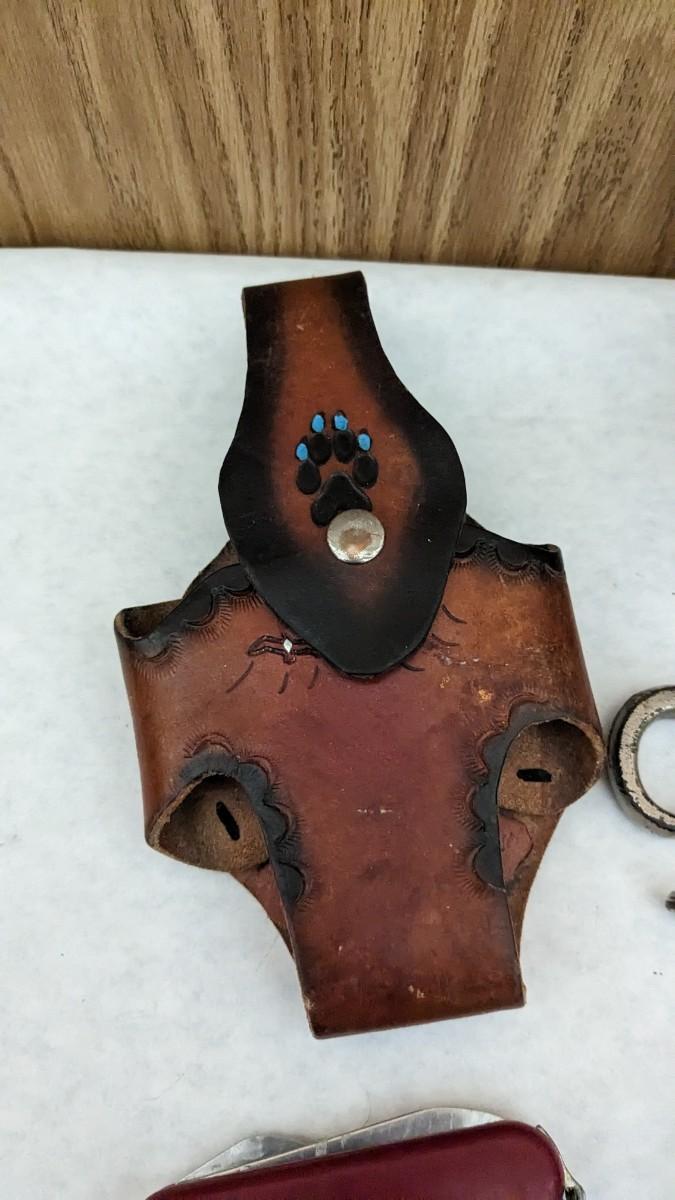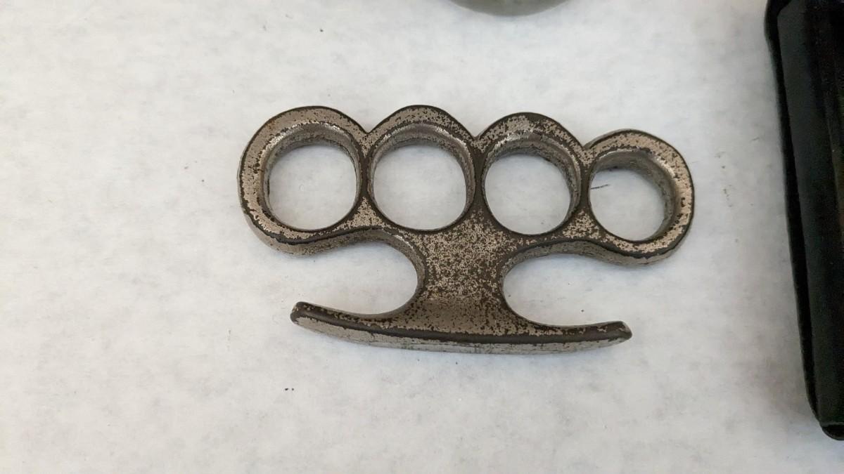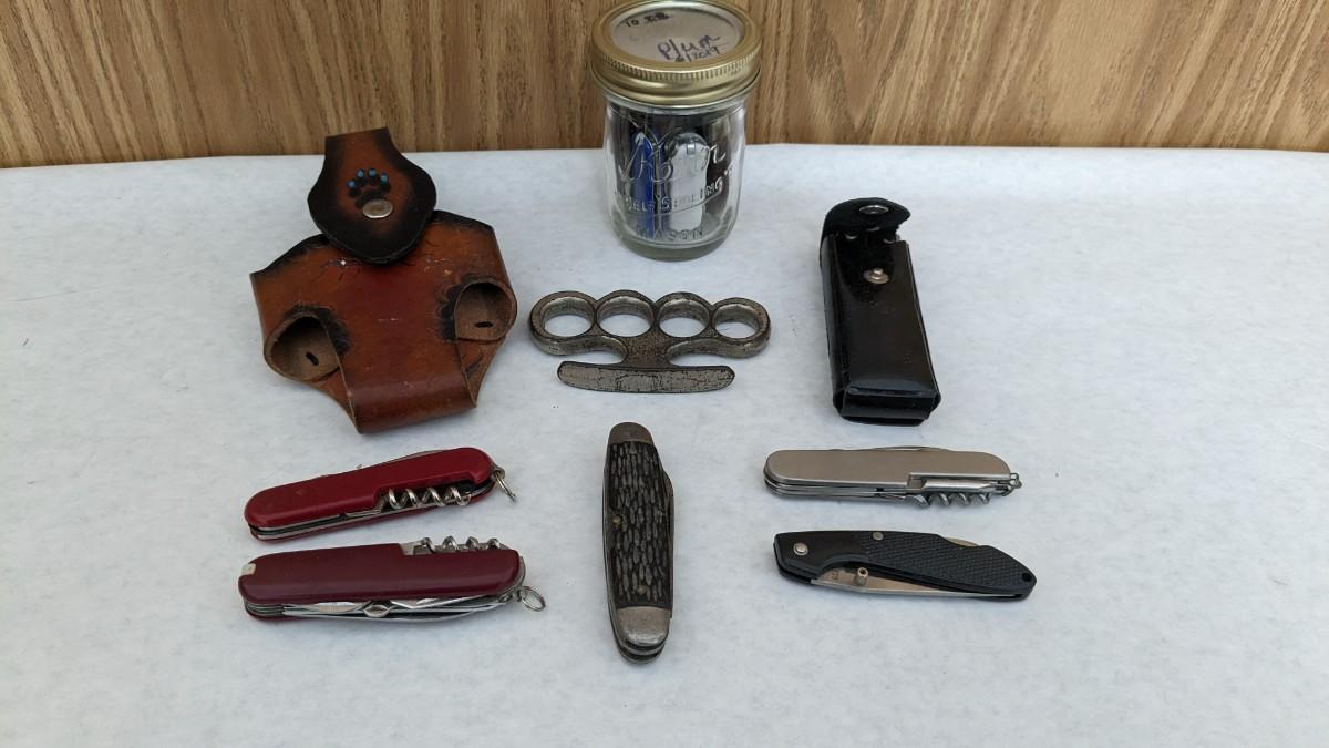 if you're looking to bring a knife to the gun fight, this is the lot for you. A great assortment of multi decade pocket knives, multi tools, a nice tooled leather holster, and great set of vintage iron knuckles. bdrm2