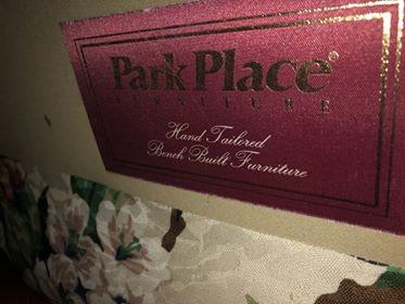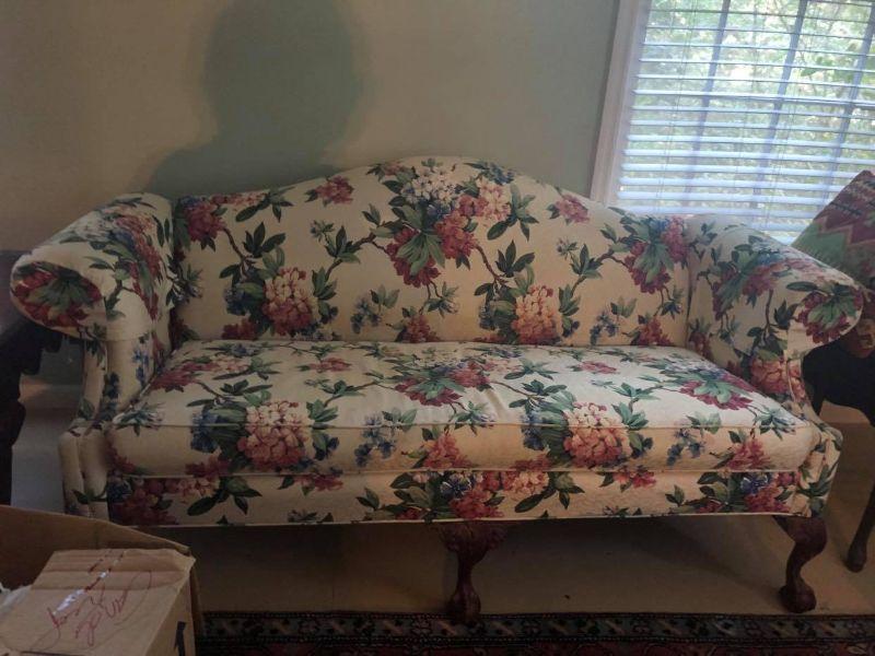 Floral Couch Park Place Furniture, Hand Tailored Designer Bench Couch. Carved claw-foot legs on front. Straight back legs. **If you want matching fabric, please inquire. We have about 50 yards matching.**