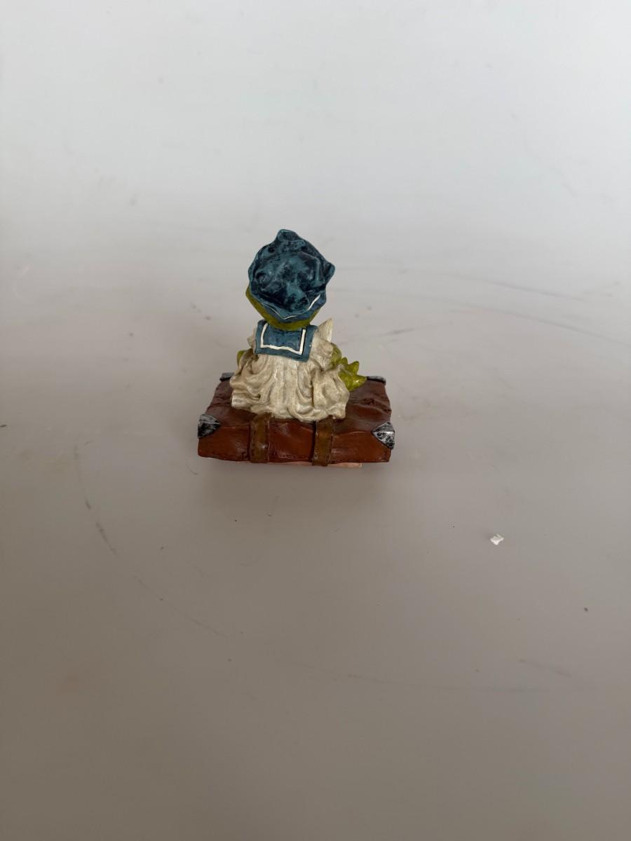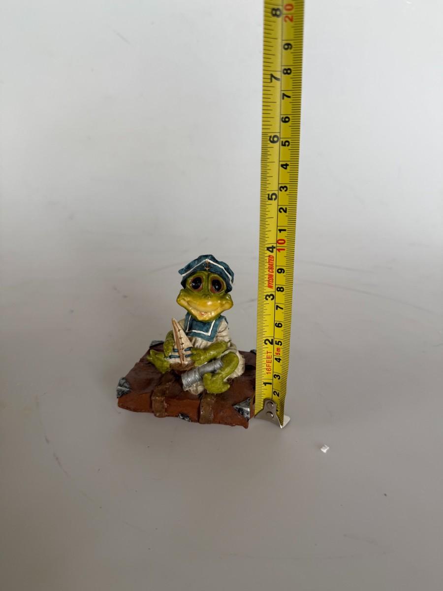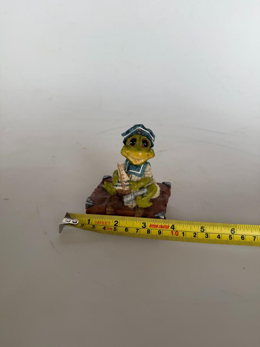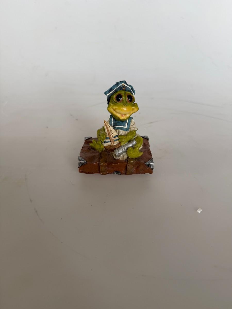Adorable sailor frog figurine holding a tiny boat. Great for whimsical collectors or nautical decor.