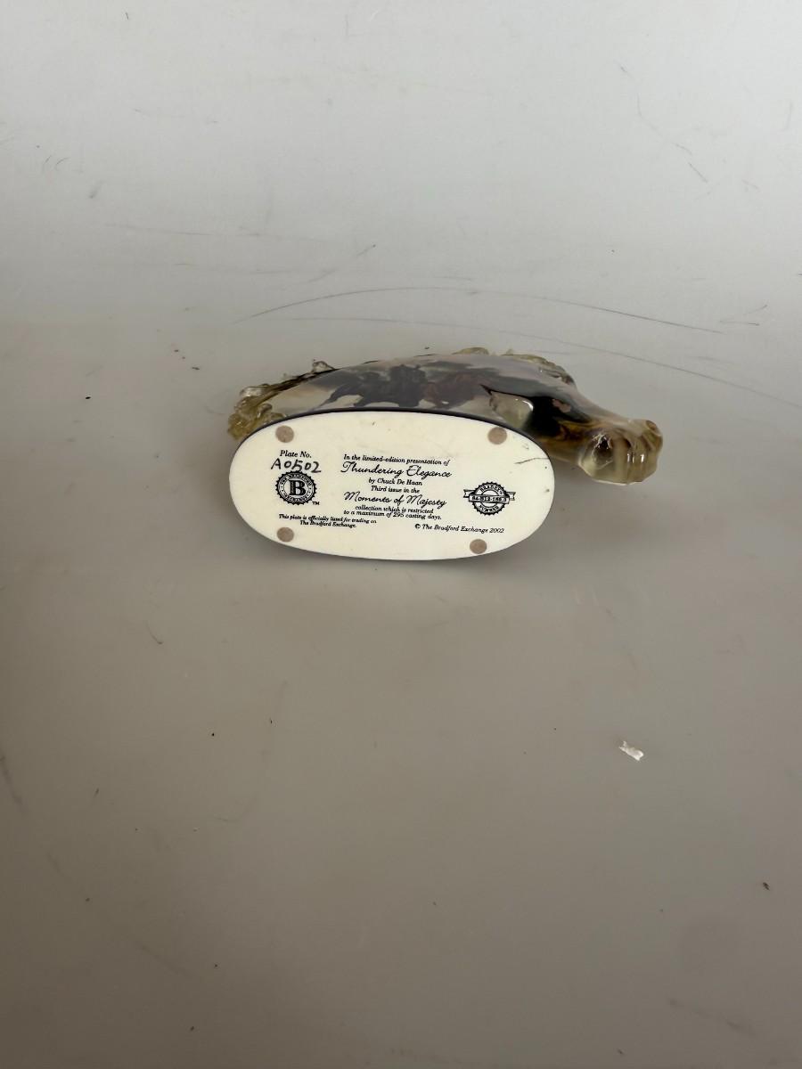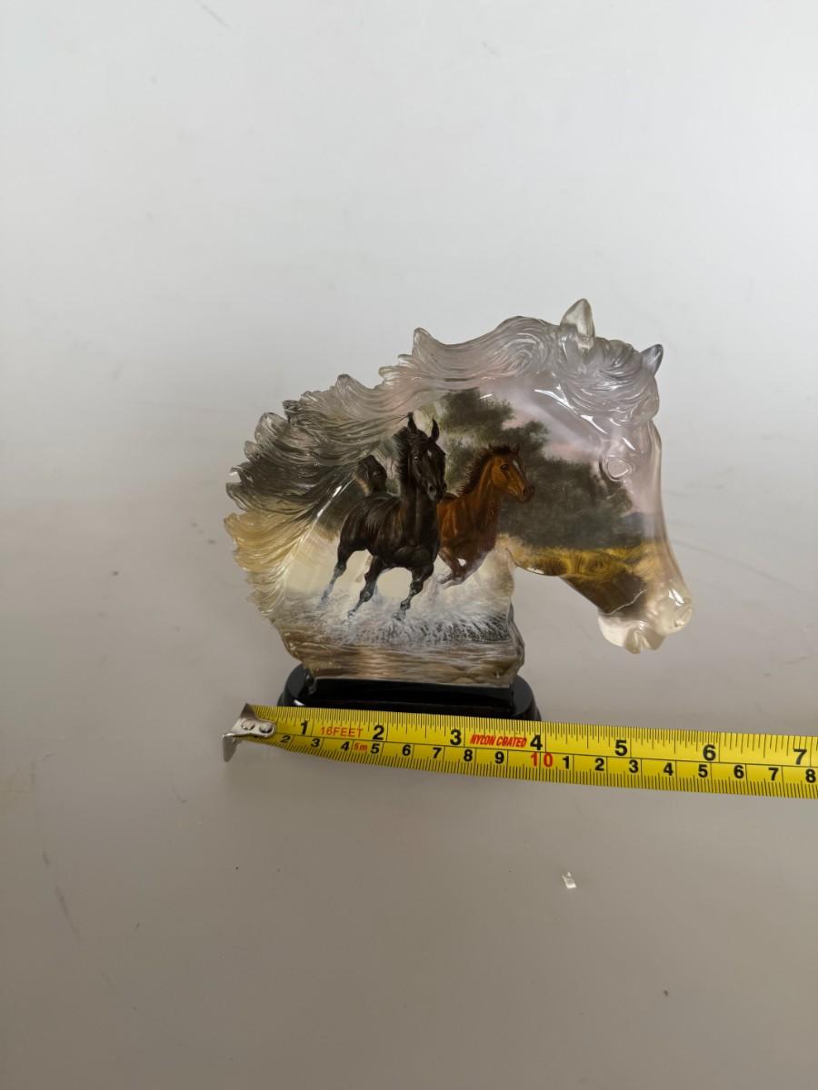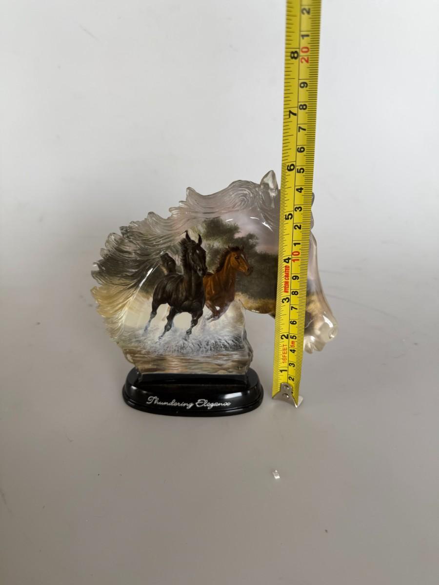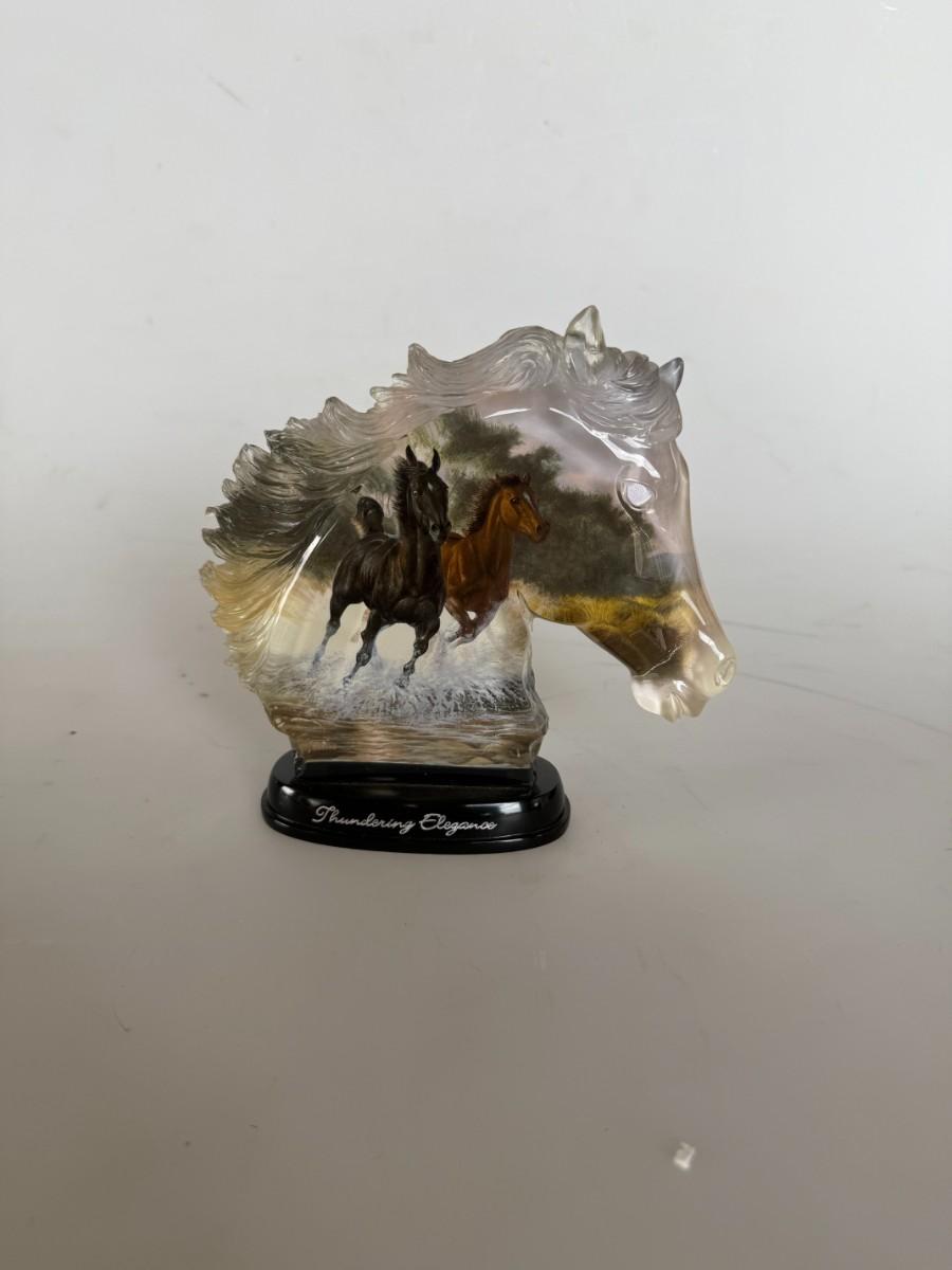 Resin horse head sculpture with embedded imagery of running horses. Labeled “Thundering Elegance.”