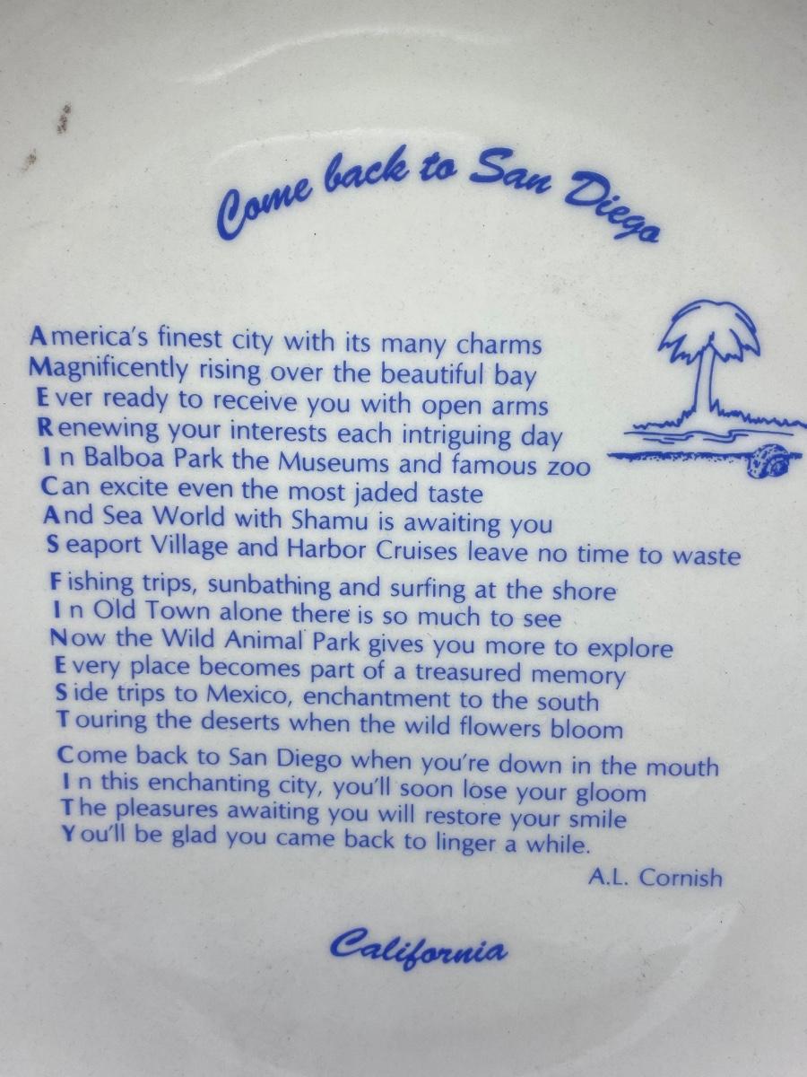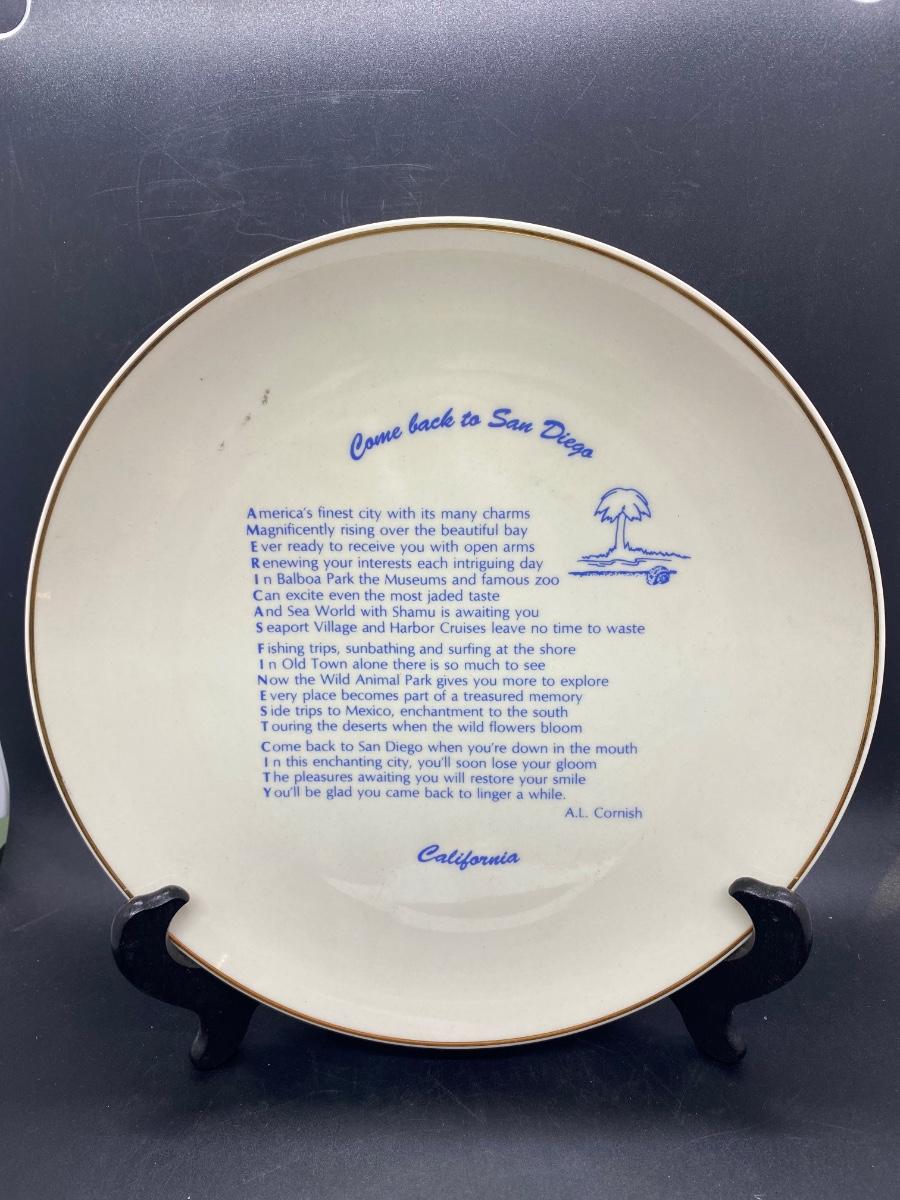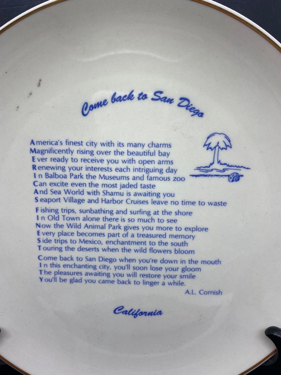 "Come Back to San Diego" Souvenir Poem Collector Plate. Has a poem on it with the first letter of each line spelling out Americas Finest City.