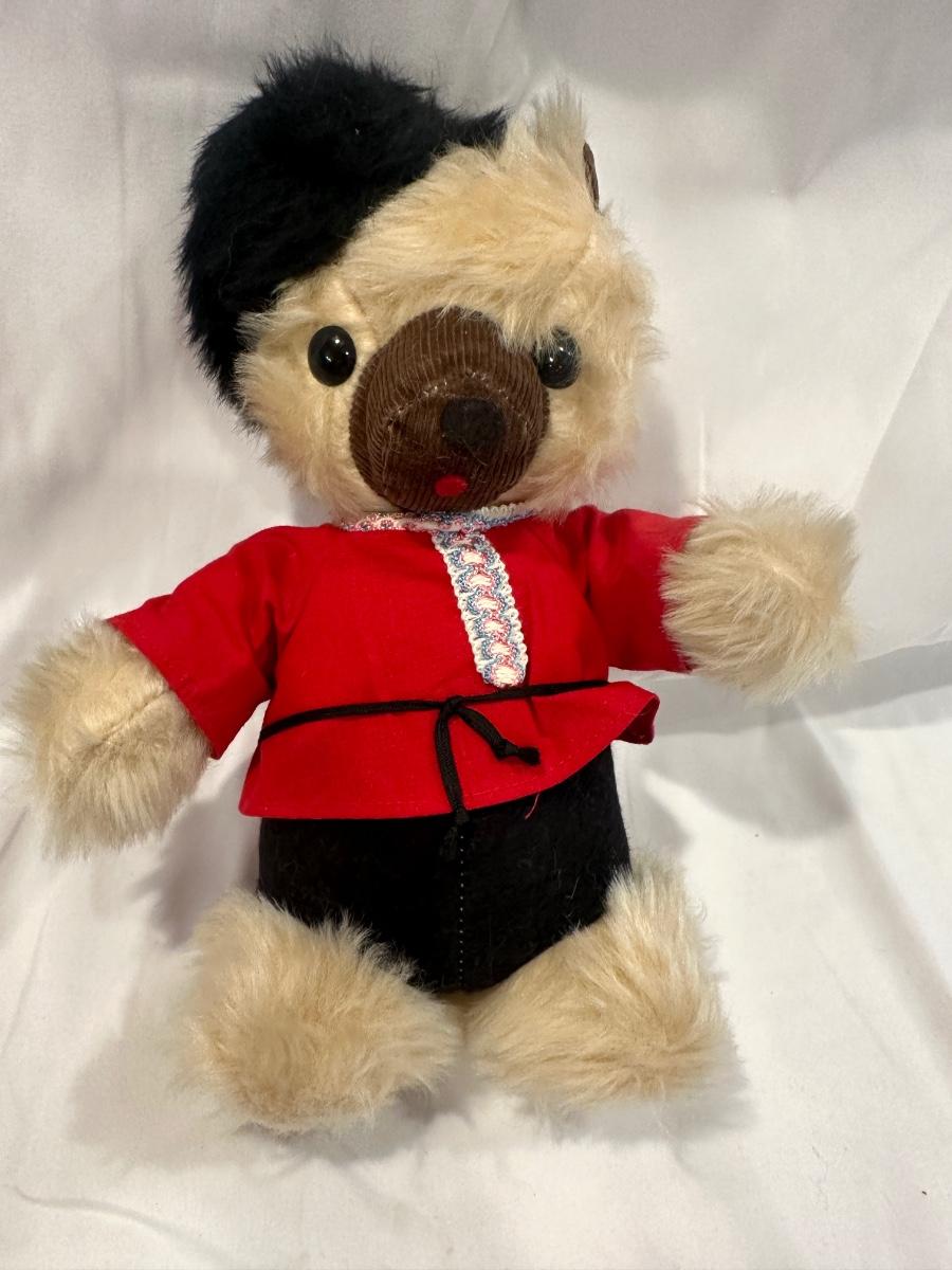 Russian dressed German teddy bear. This unique fellow has a great Coleco themed outfit, corduroy face and mohair fur.
