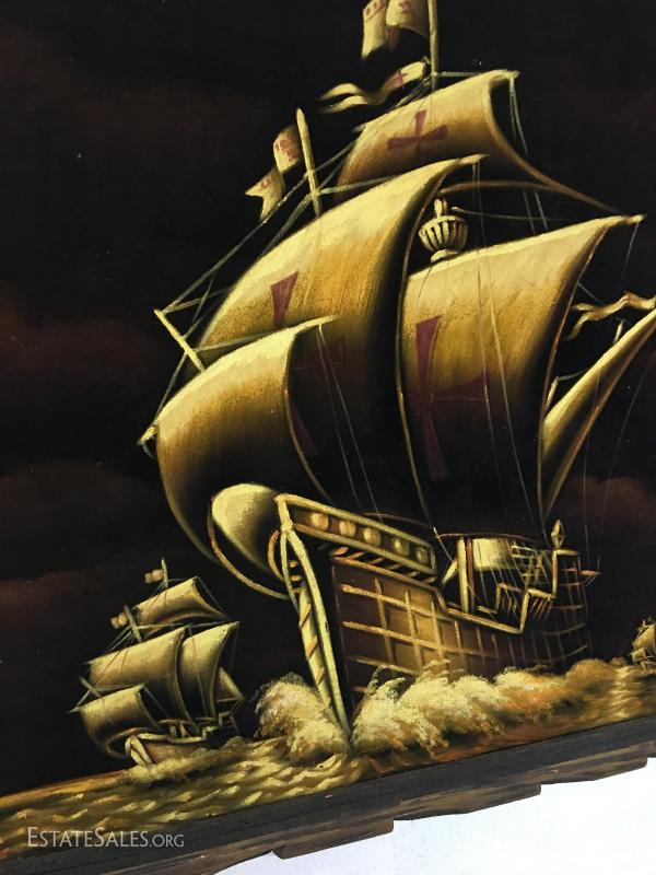 "Come Sail Away" Fine Velvet painting Spanish Galleon 39" x 27" c.1970 excellent condition, wood frame, a little dusty. This table was in last months auction but the high bidder failed to pick up and pay for it.