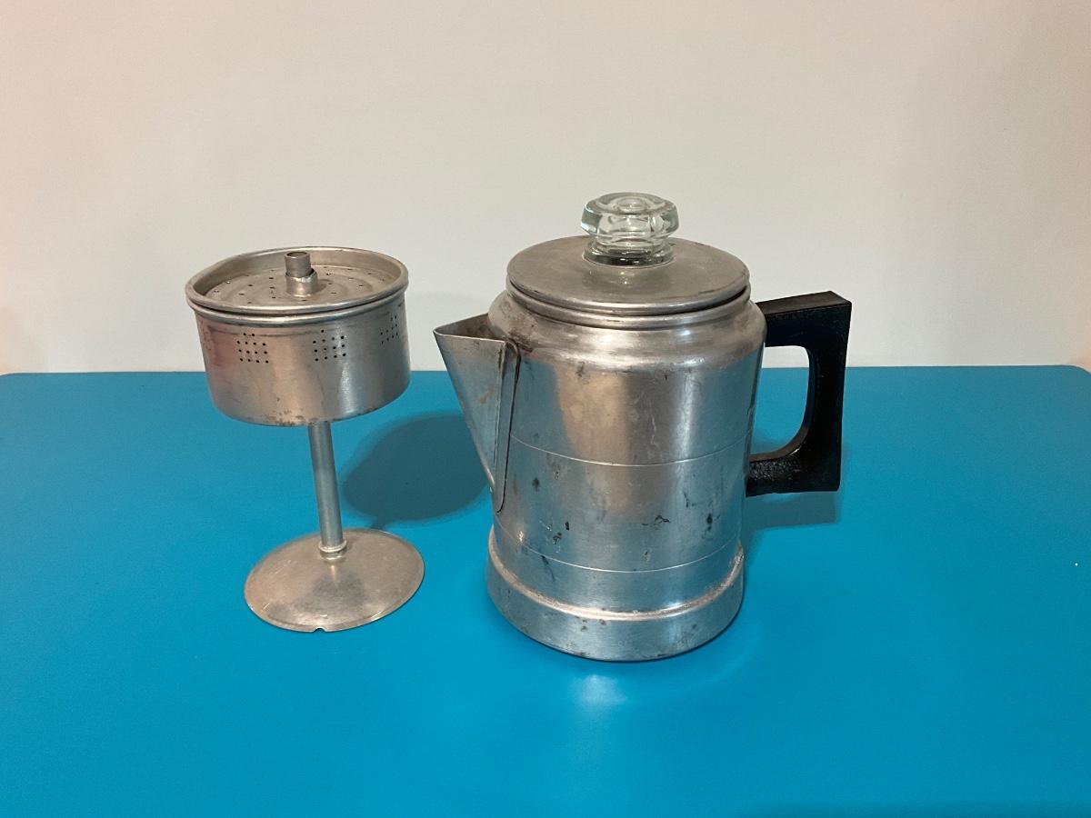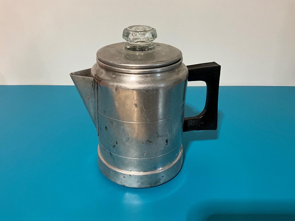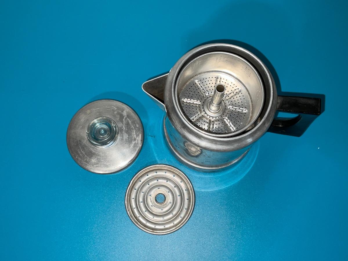 Aluminum kettle with built in strainer. Holds 5 cups. Made in USA