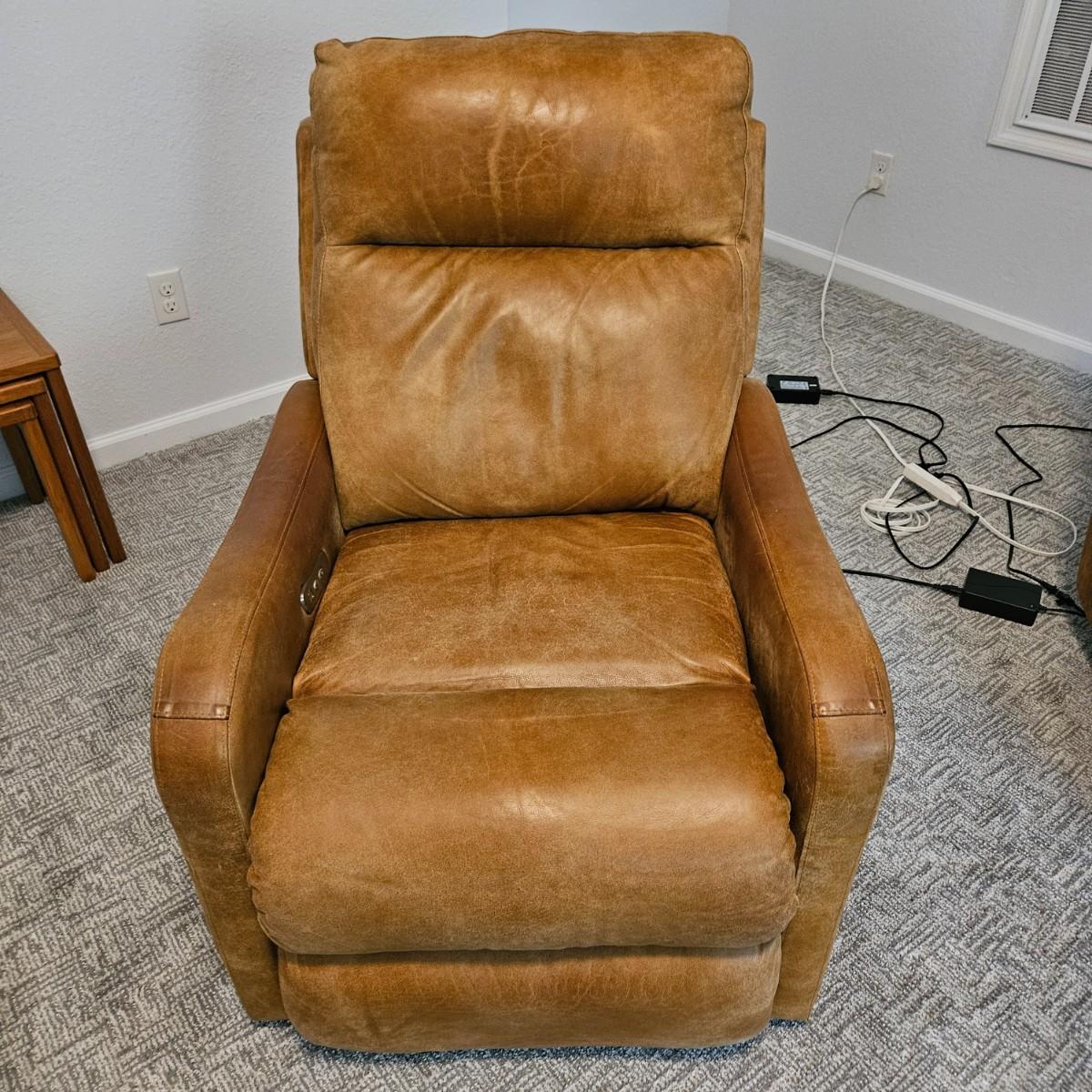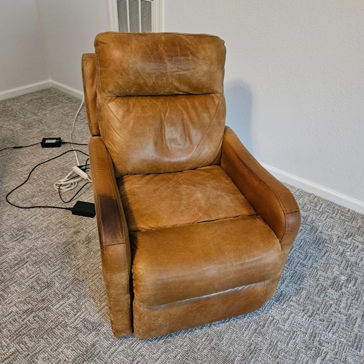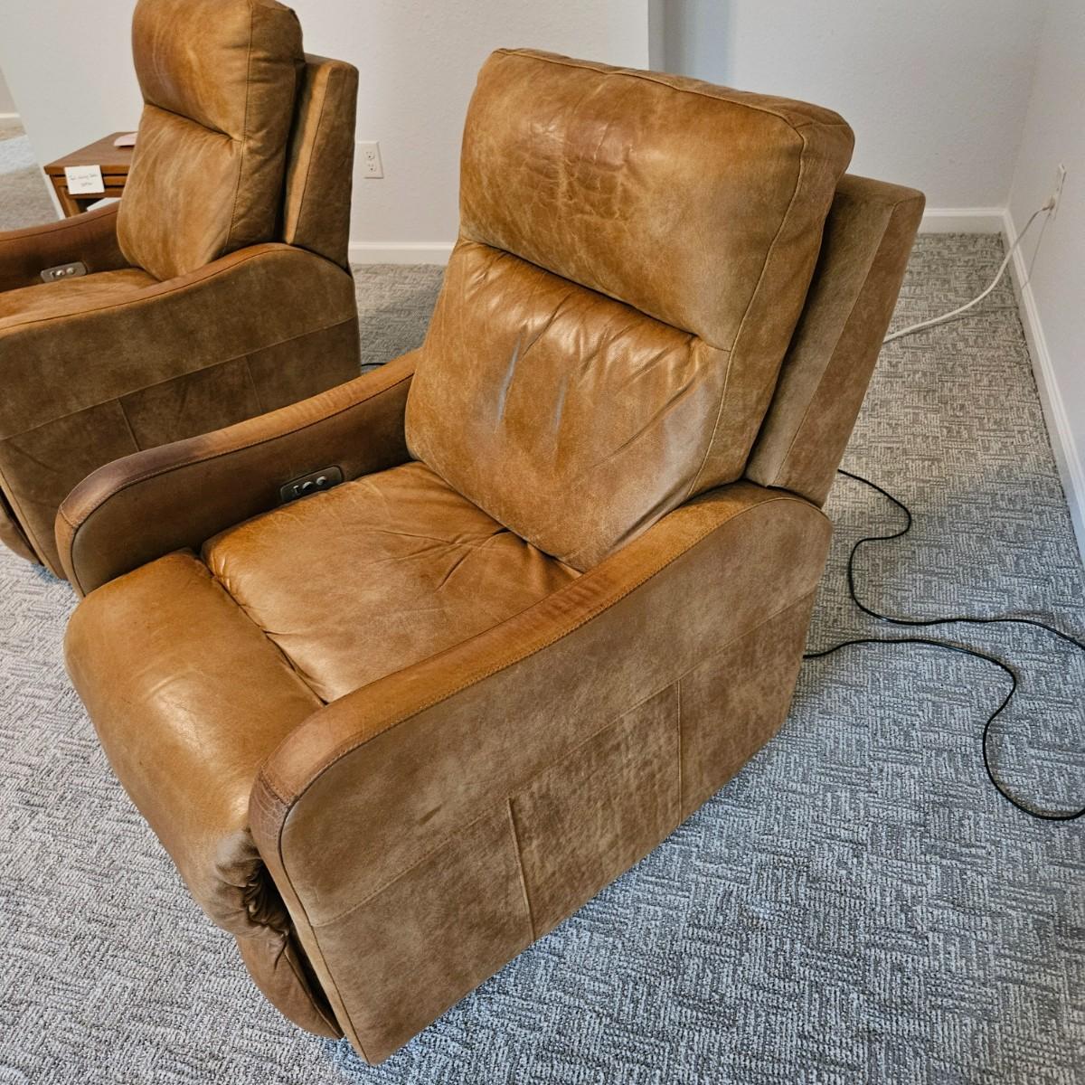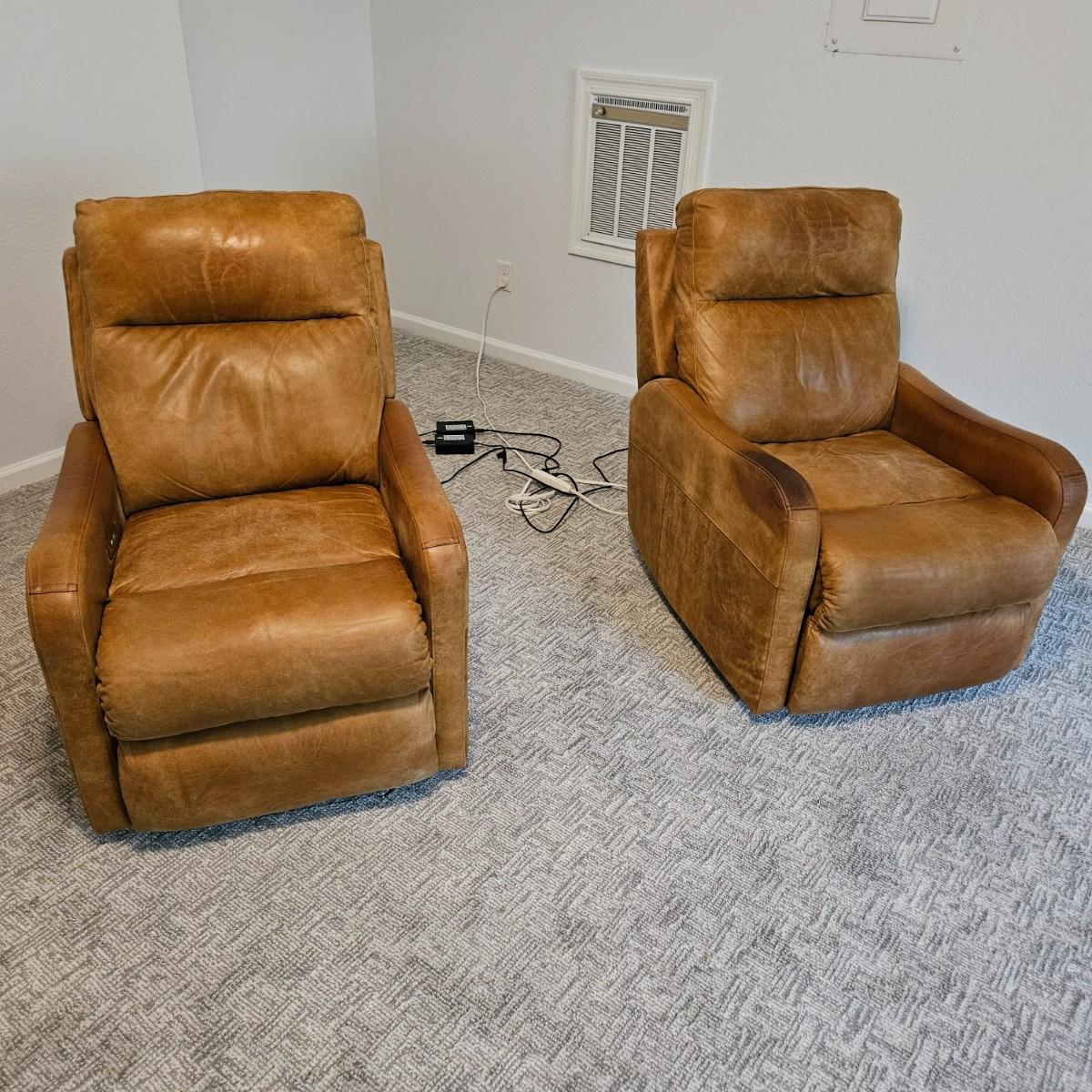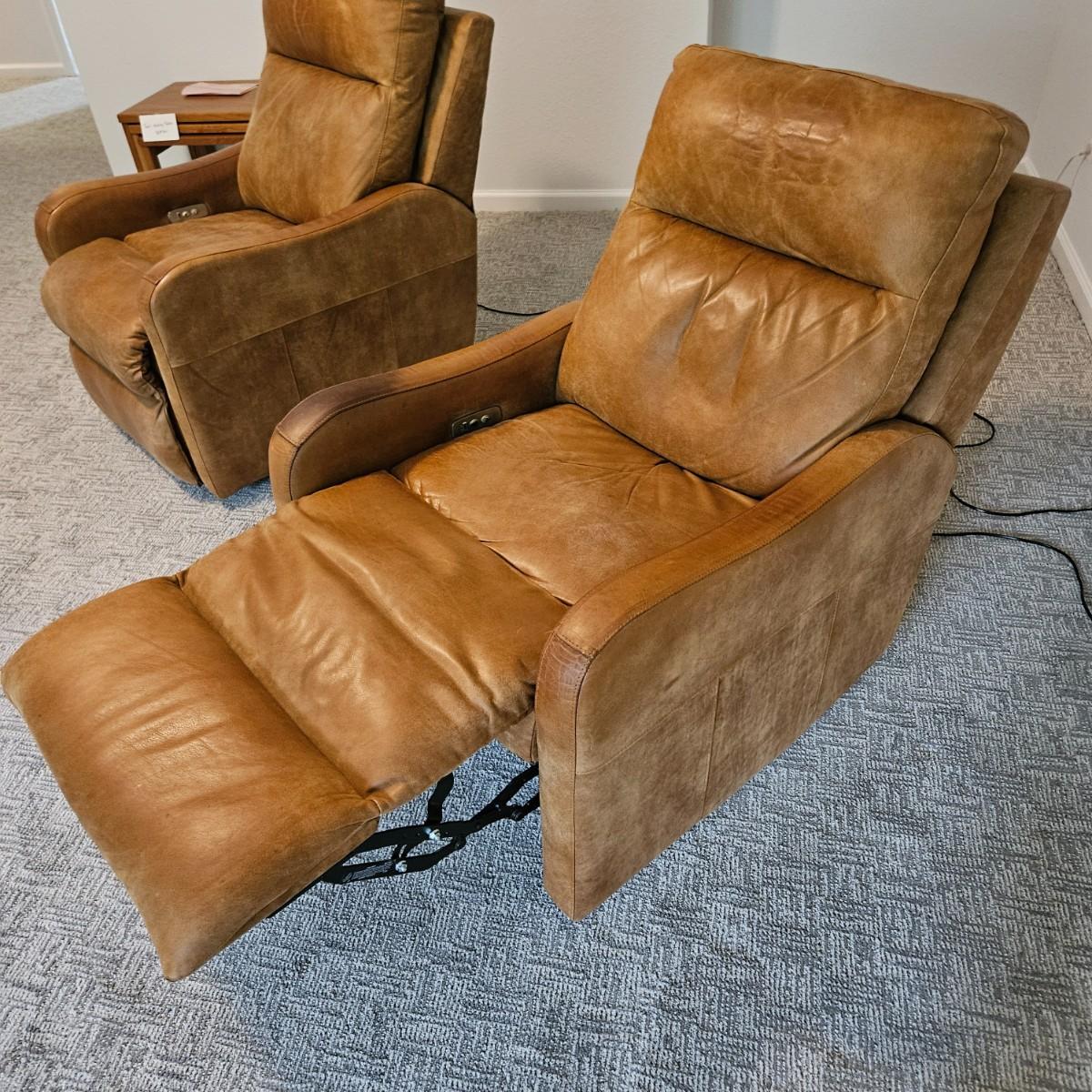 A pair of Davion electric leather recliners manufactured by Comfort Design that powered on when plugged in each chair features a rich medium brown leather with a usb port and electric controls. They measure approximately 33" x 40" x 42"H with a seat height around 17”. One chair has a darkened armrest and the other chair has a small white blemish on its back. Includes two AC power adapters. Local pickup only. Winning bidder must bring assistance to help move and load this item due to its weight and/or size. Chairs are located in a basement, with a walk out door. The path to the driveway has the possibility of being muddy during pick up.