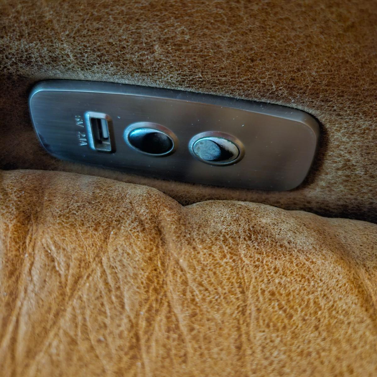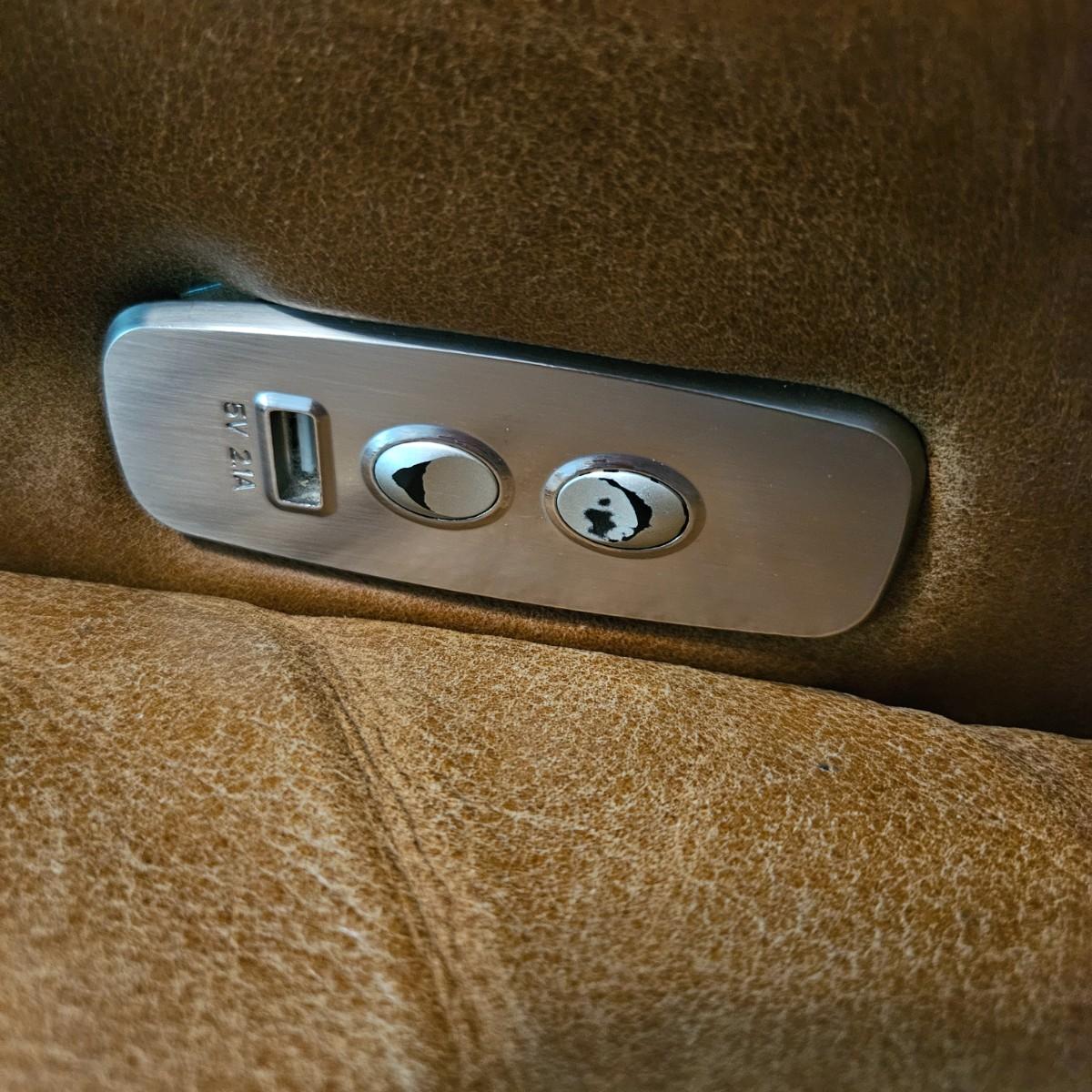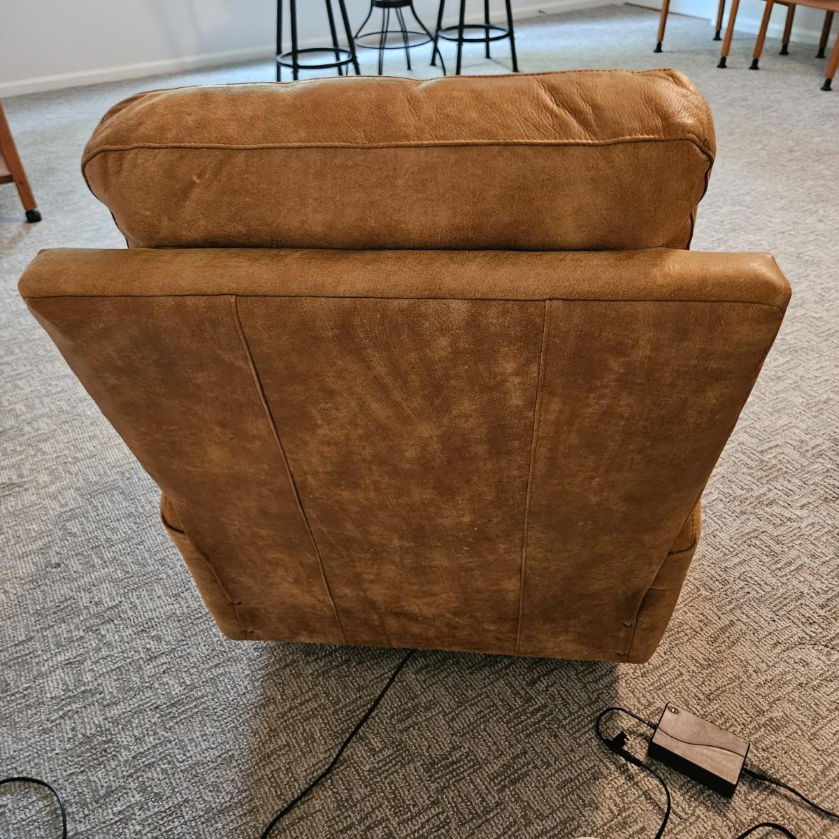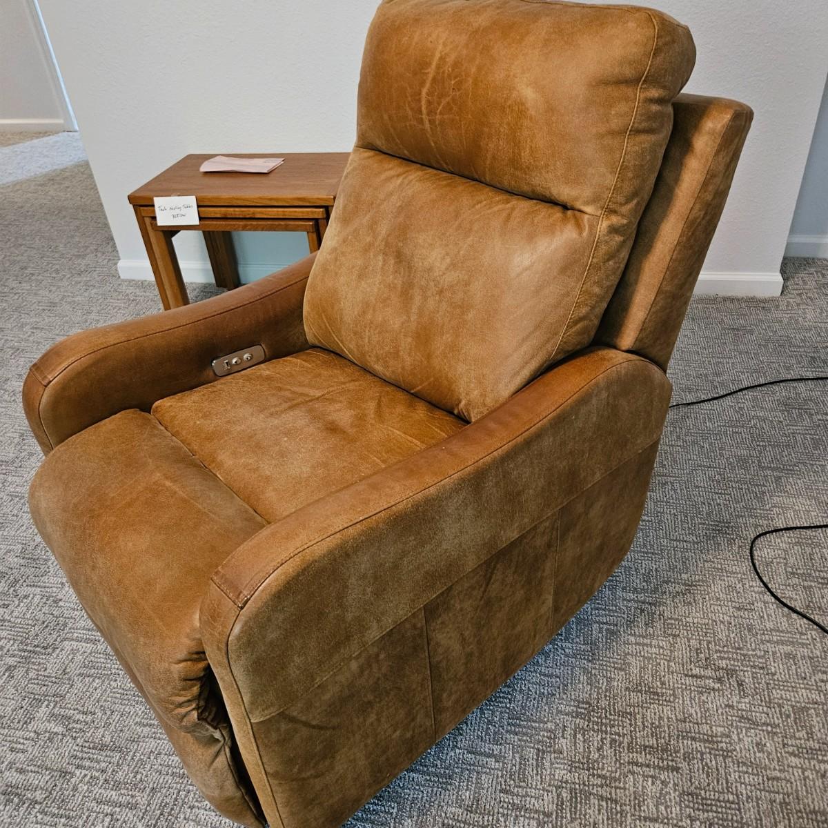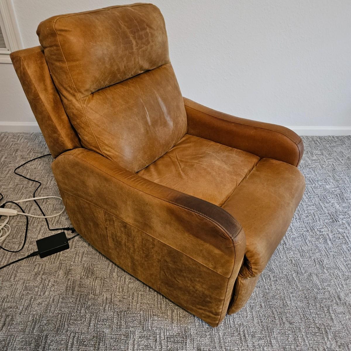 A pair of Davion electric leather recliners manufactured by Comfort Design that powered on when plugged in each chair features a rich medium brown leather with a usb port and electric controls. They measure approximately 33" x 40" x 42"H with a seat height around 17”. One chair has a darkened armrest and the other chair has a small white blemish on its back. Includes two AC power adapters. Local pickup only. Winning bidder must bring assistance to help move and load this item due to its weight and/or size. Chairs are located in a basement, with a walk out door. The path to the driveway has the possibility of being muddy during pick up.