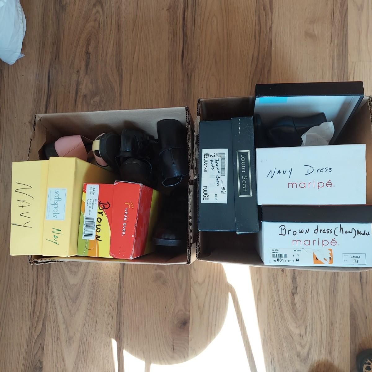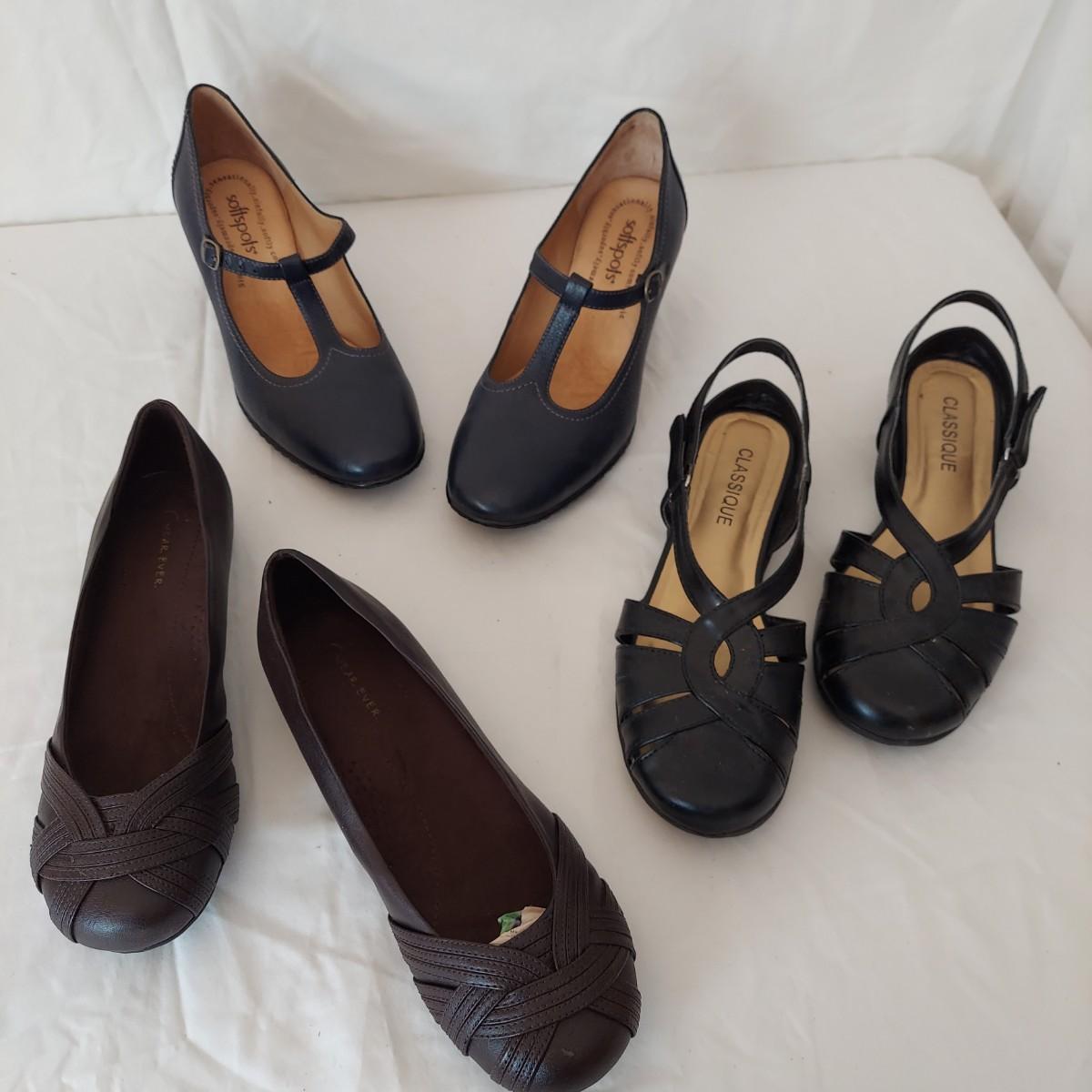 Lot includes eight pairs of heels, sandals and flats in comfort styles. Some are in their original boxes. Sizes vary from 7-7.5. Please see photos for details. Shipping available