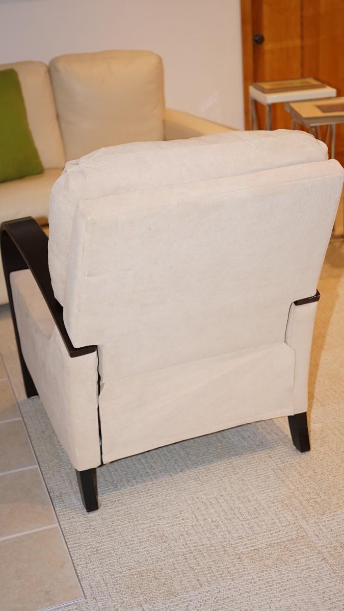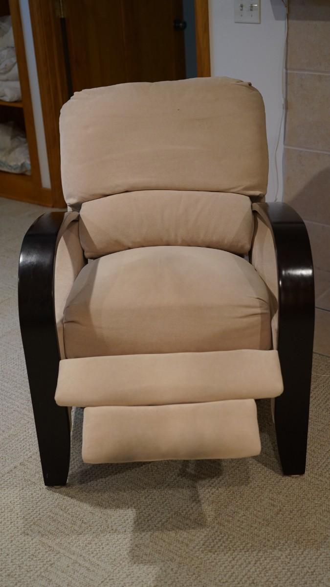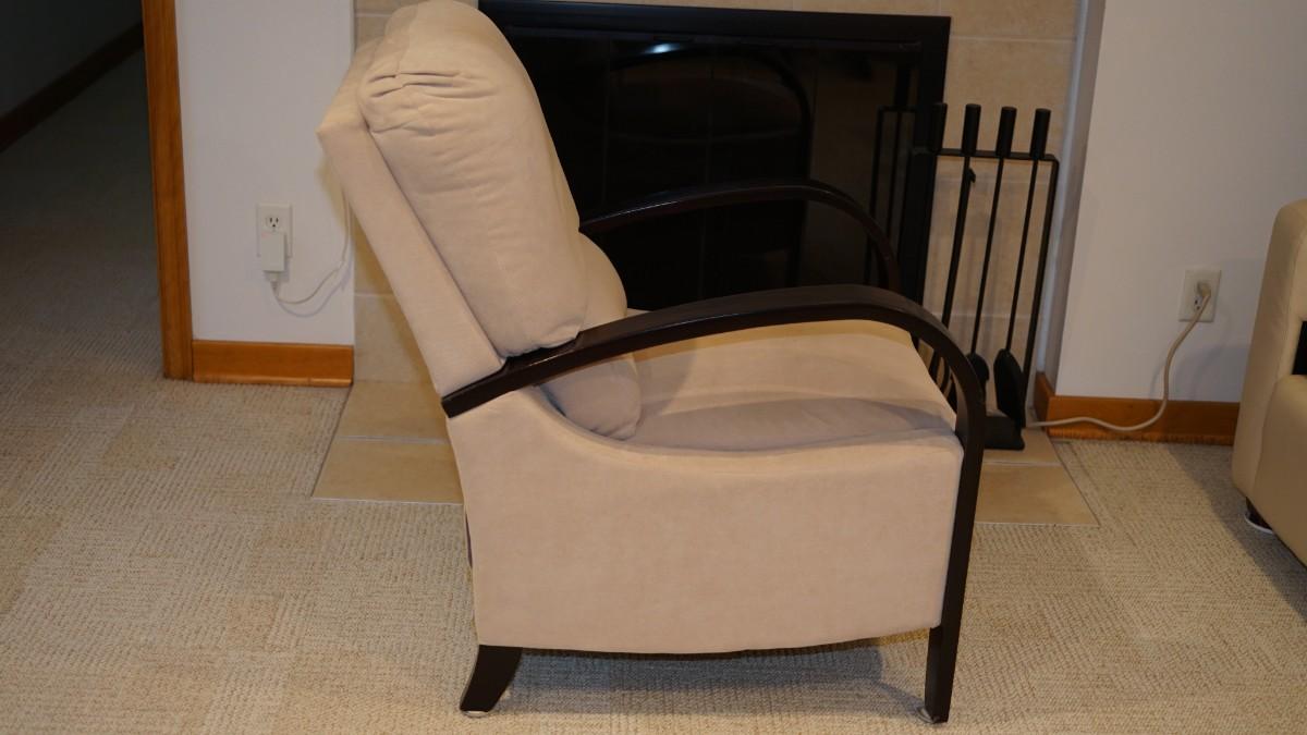 Comfortable chair with slight reclines with footrest. Bentwood Arms of wood