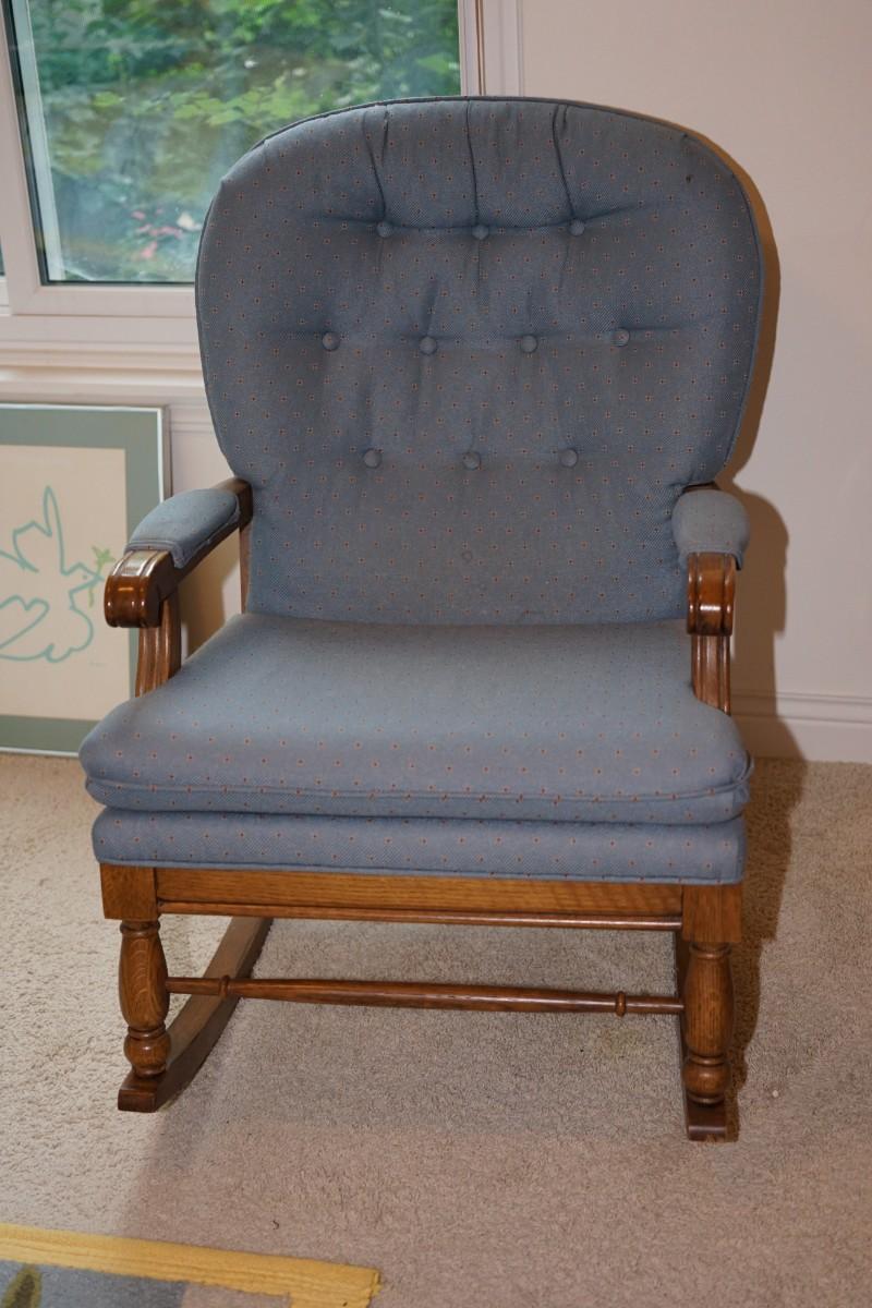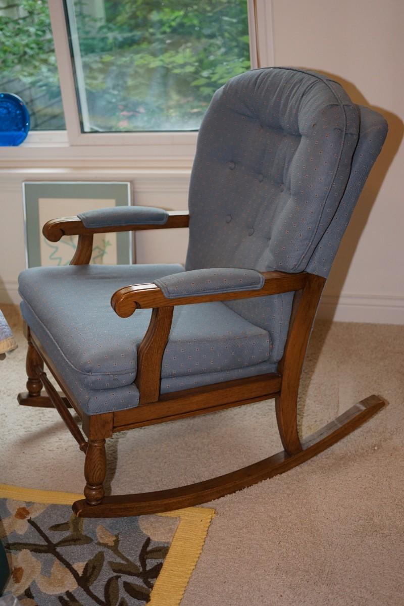COMFORTABLE WOOD FRAMED ROCKER UPHOLSTERED IN A BLUE FABRIC