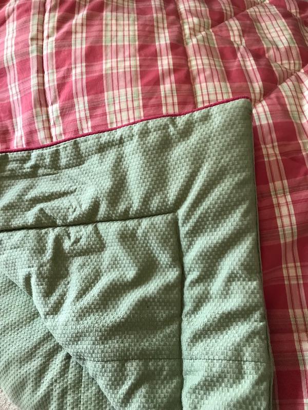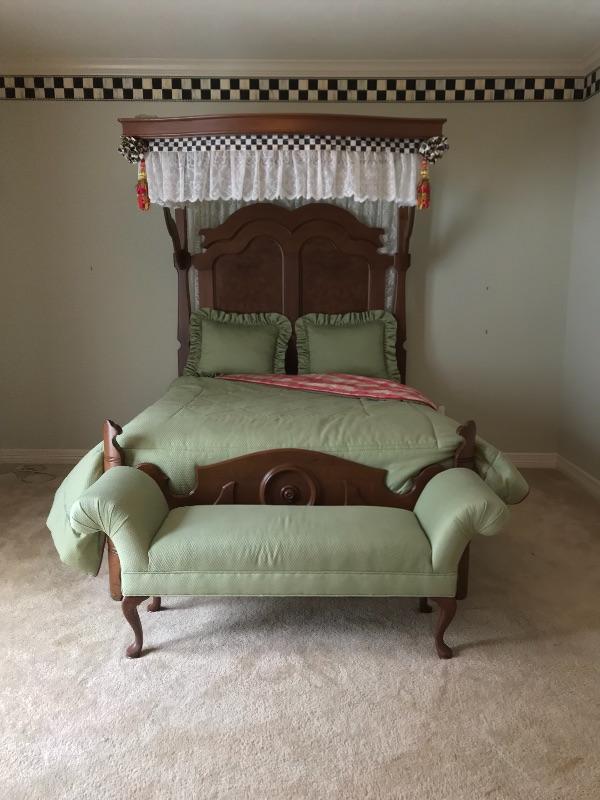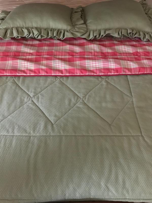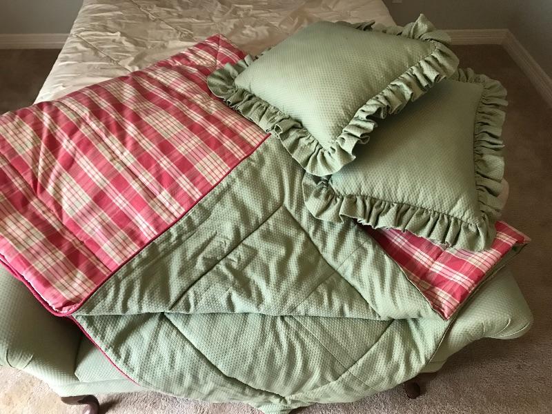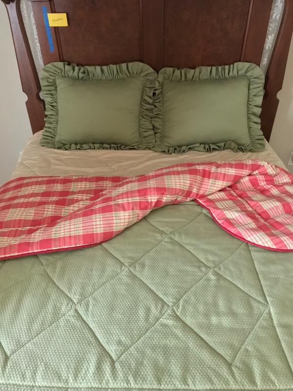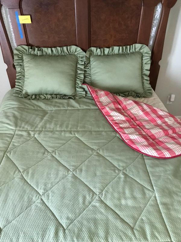 Beautifully crafted professionally made reversible comforter with two shams. Shams measure 22.5” X 16 “, Comforter measure 85” wide X 88” long. This fits on the Victorian bed and compliments draperies. Also, the same green fabric is on the bench that sits on the at the end of the bed in the photos.