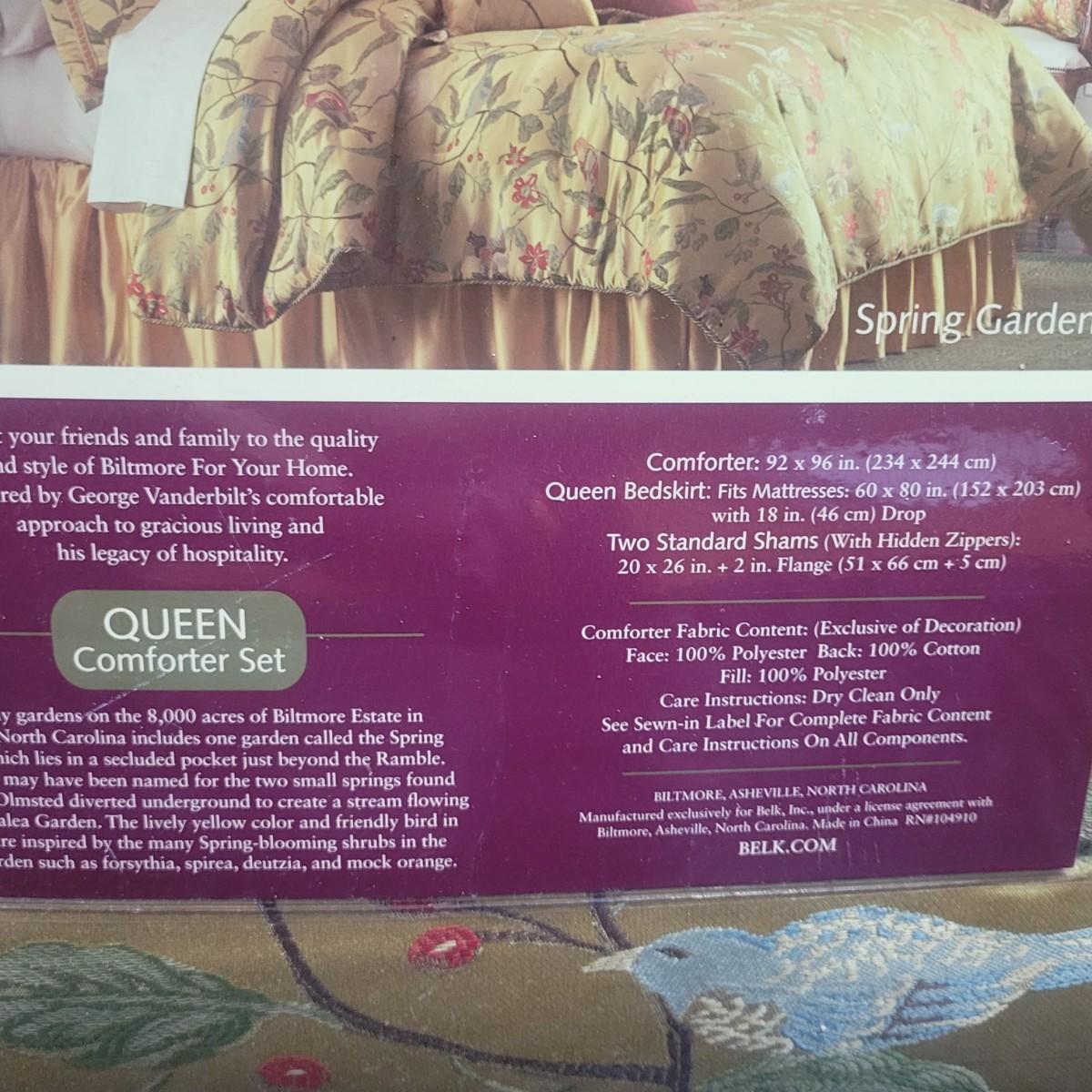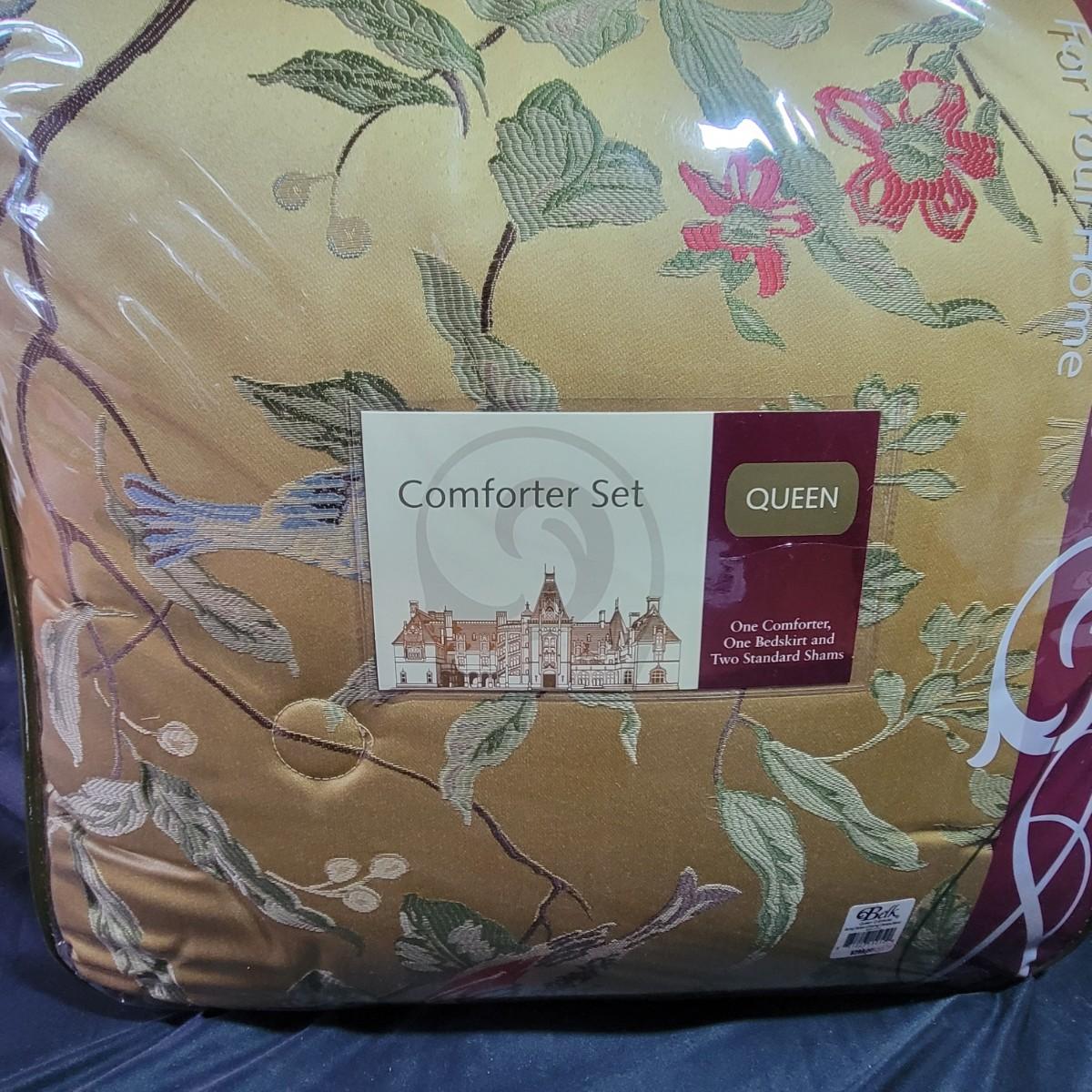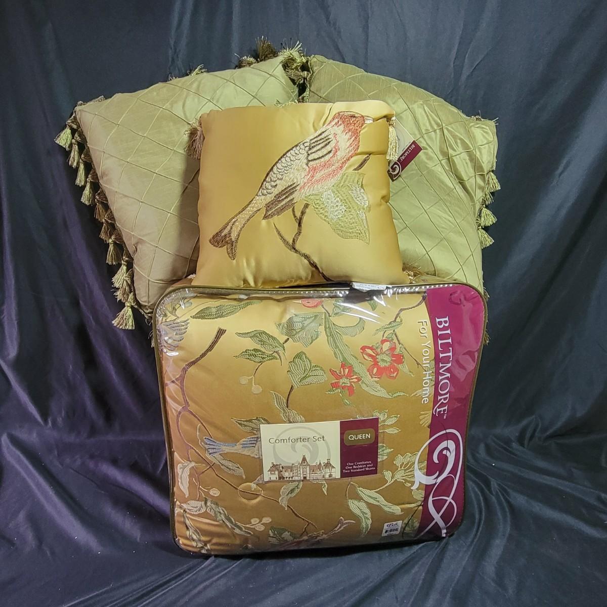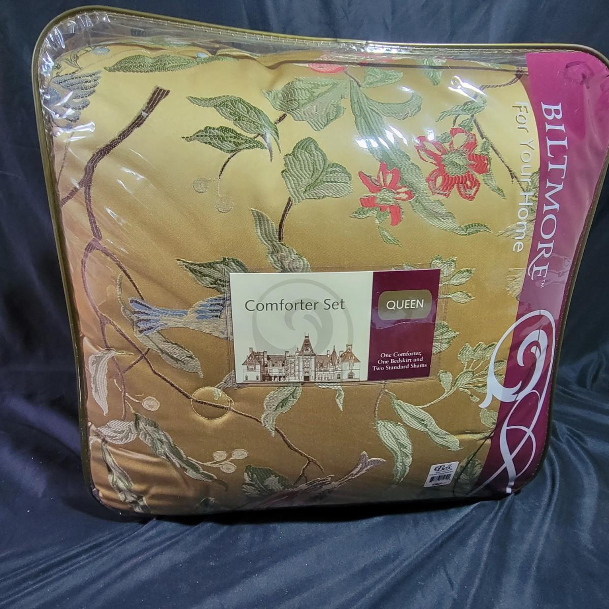 Queen sized comforter and pillow inspired and licensed by Biltmore Estates. The other 2 pillows are Diamond Royal Apple pattern that matches set and are 15" x 15". Bed skirt was originally with comforter set. All are new and unused. Local Pickup Only