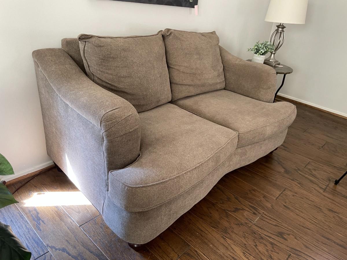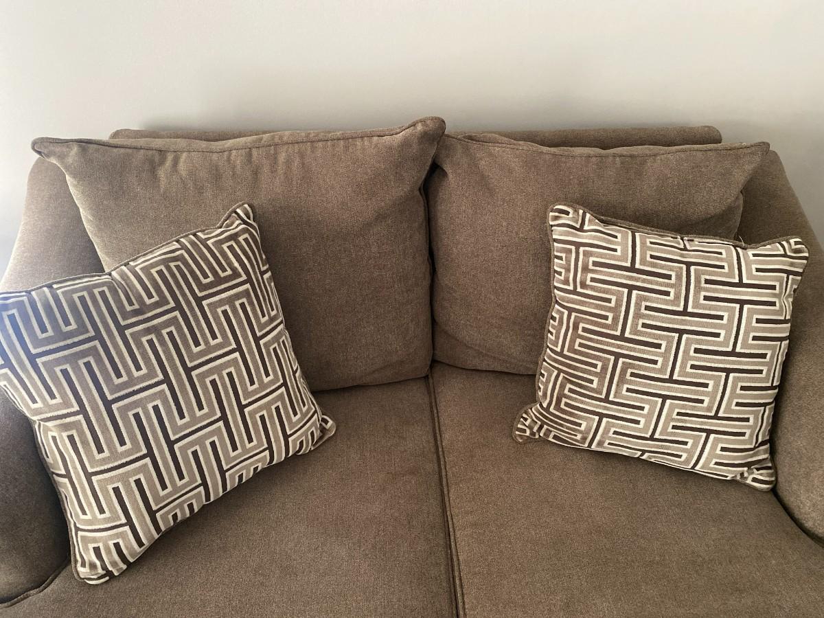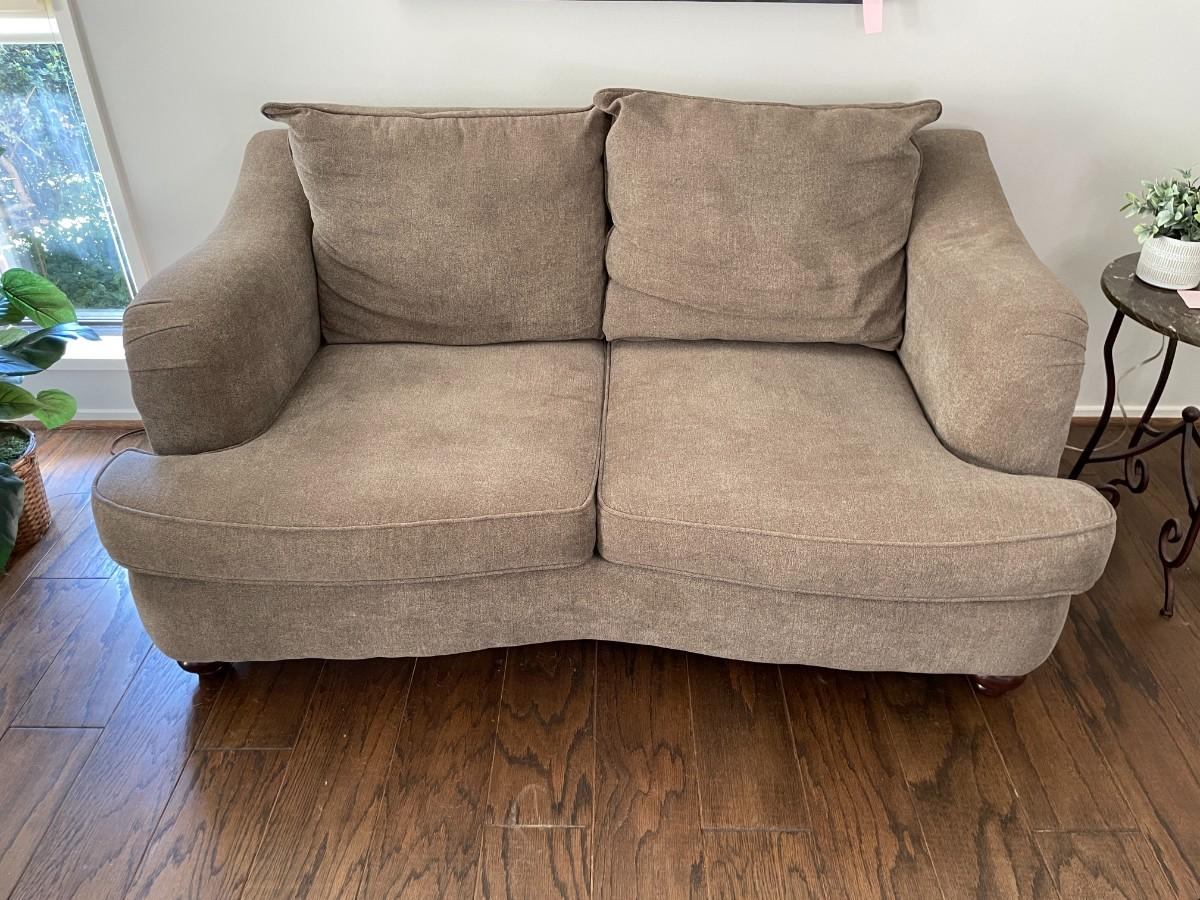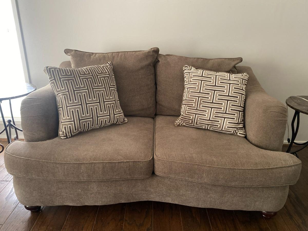 Brown/Gray. This item pairs back to Lot # 8. Measures 64l x 37d x 33h. Clean and in beautiful condition.