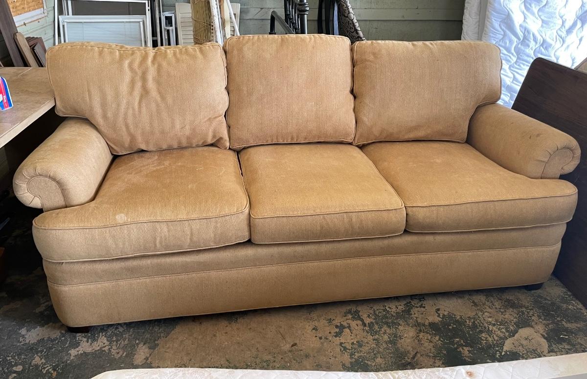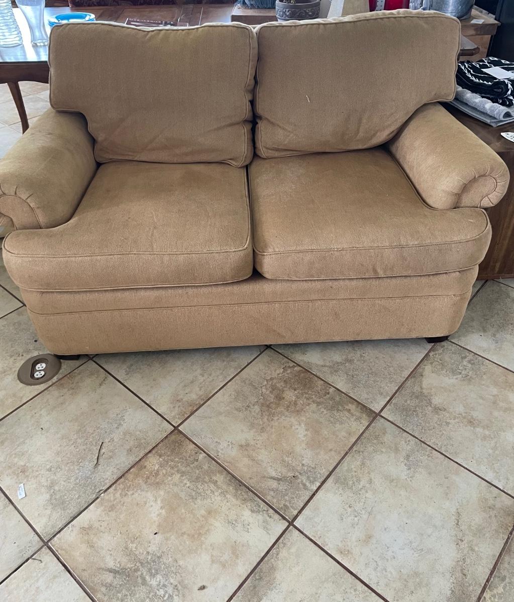 Needs cleaning - comes with off white canvas slip covers - super comfy